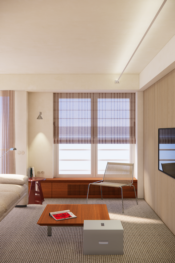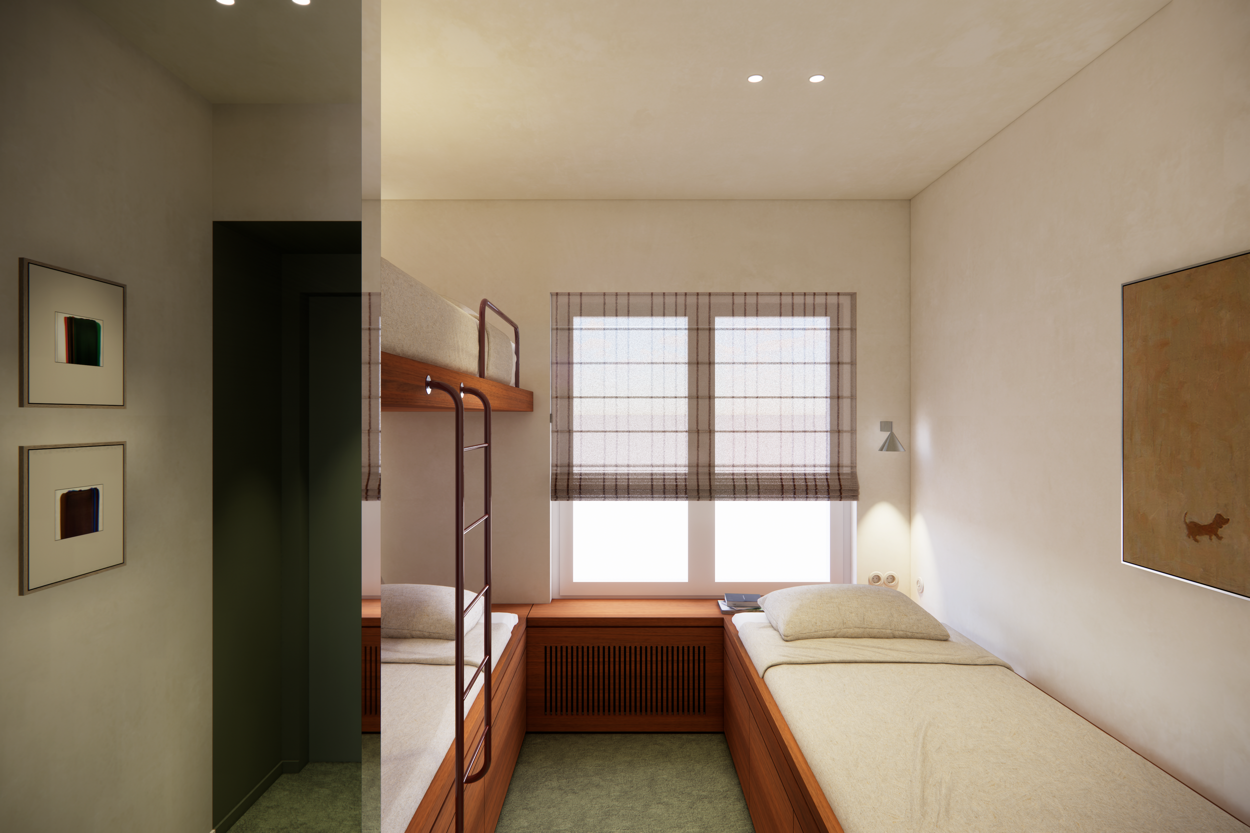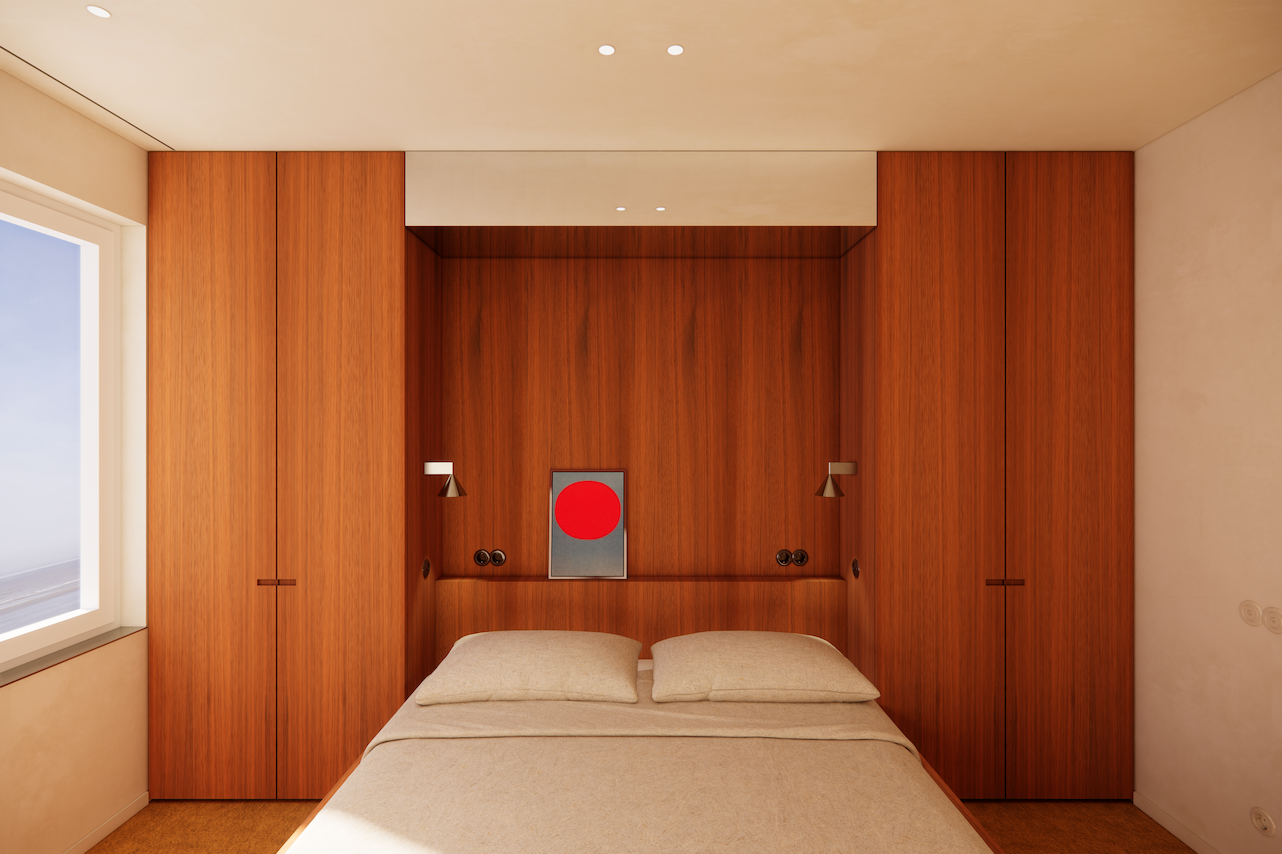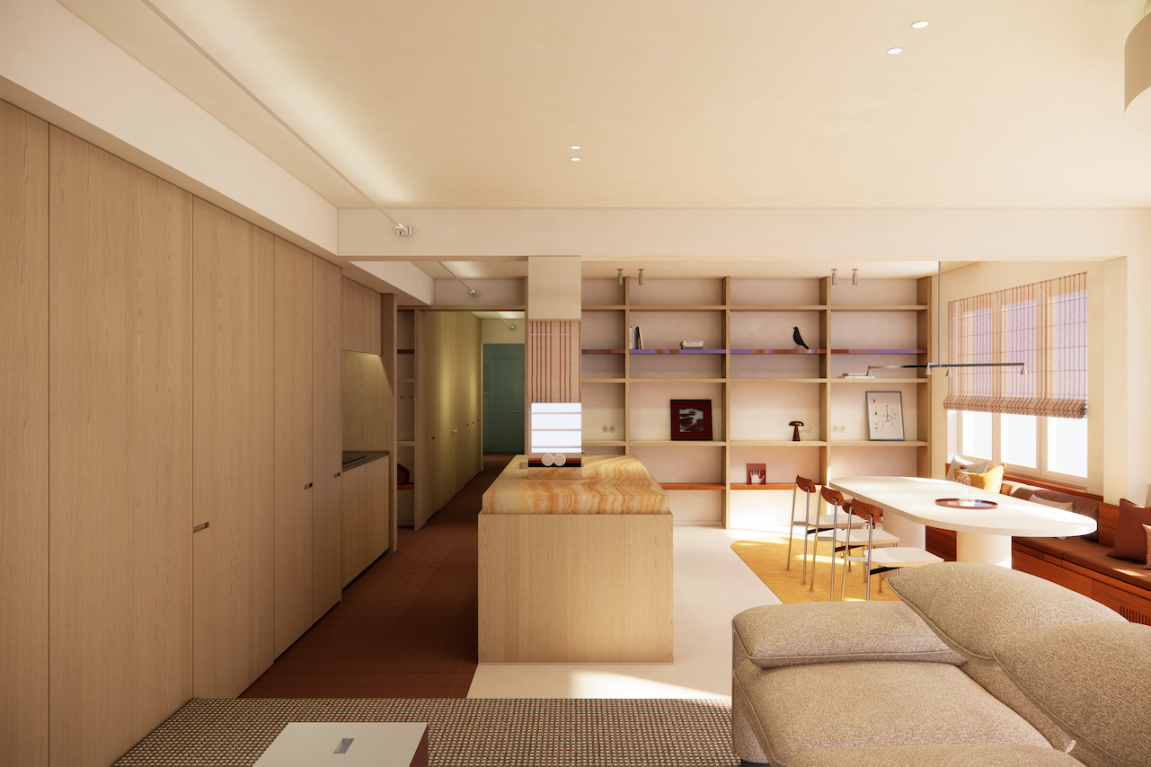 Het kleurenpalet — opgebouwd uit terracotta, hemelsblauw, okergeel en warm rood — weerspiegelt de optimistische esthetiek van de vroege modernisten. De aandacht voor detail reikt tot in de kleinste finesses: van de grafische prints in het textiel tot de bakelieten schakelaars, die als authentieke accenten de geschiedenis van het gebouw voelbaar maken in het interieur.