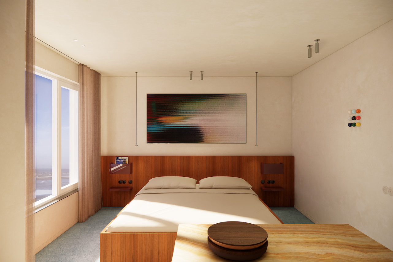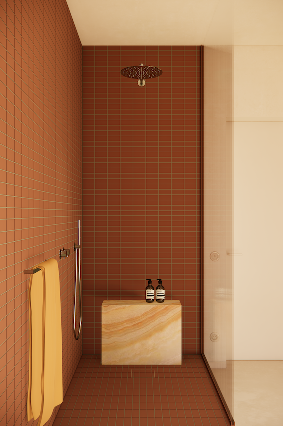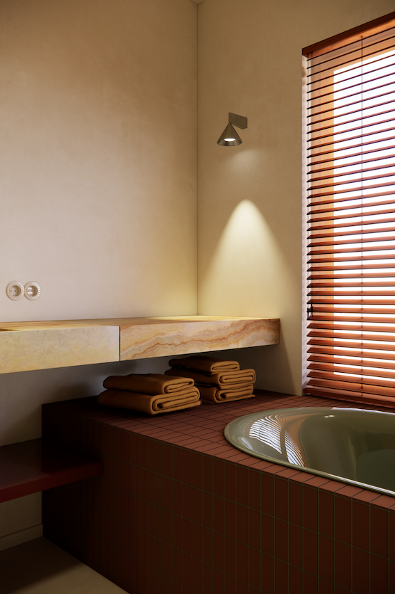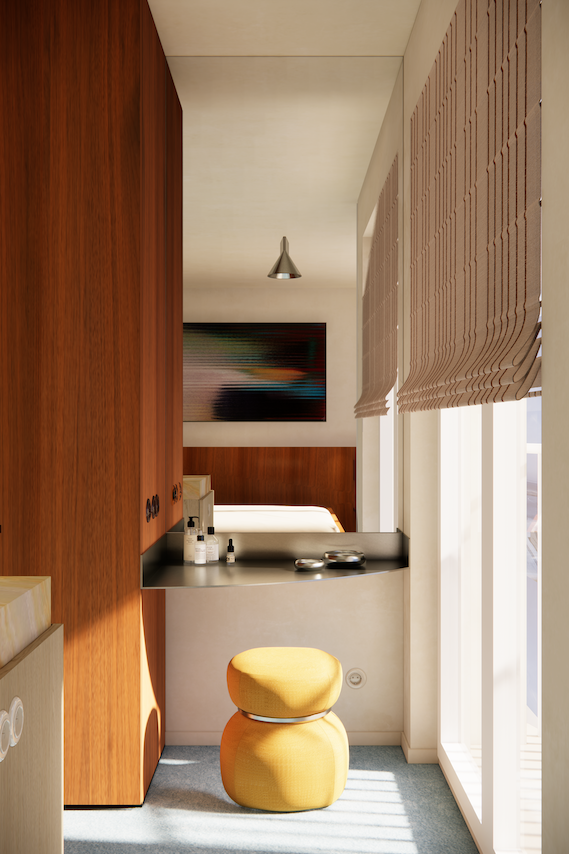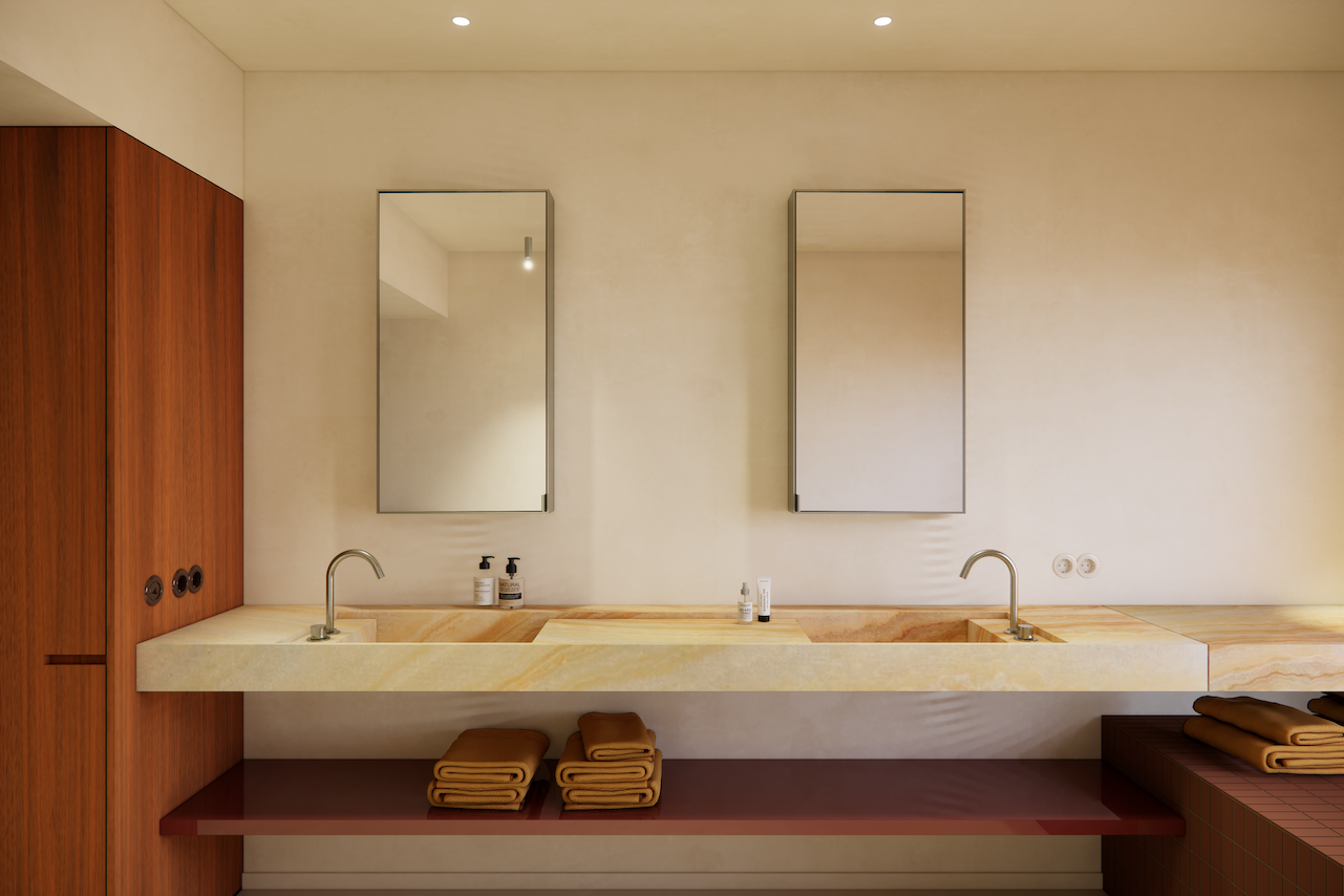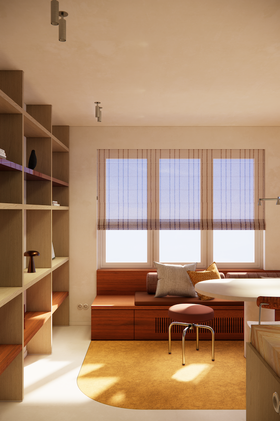 Het kleurenpalet — opgebouwd uit terracotta, hemelsblauw, okergeel en warm rood — weerspiegelt de optimistische esthetiek van de vroege modernisten. De aandacht voor detail reikt tot in de kleinste finesses: van de grafische prints in het textiel tot de bakelieten schakelaars, die als authentieke accenten de geschiedenis van het gebouw voelbaar maken in het interieur.
