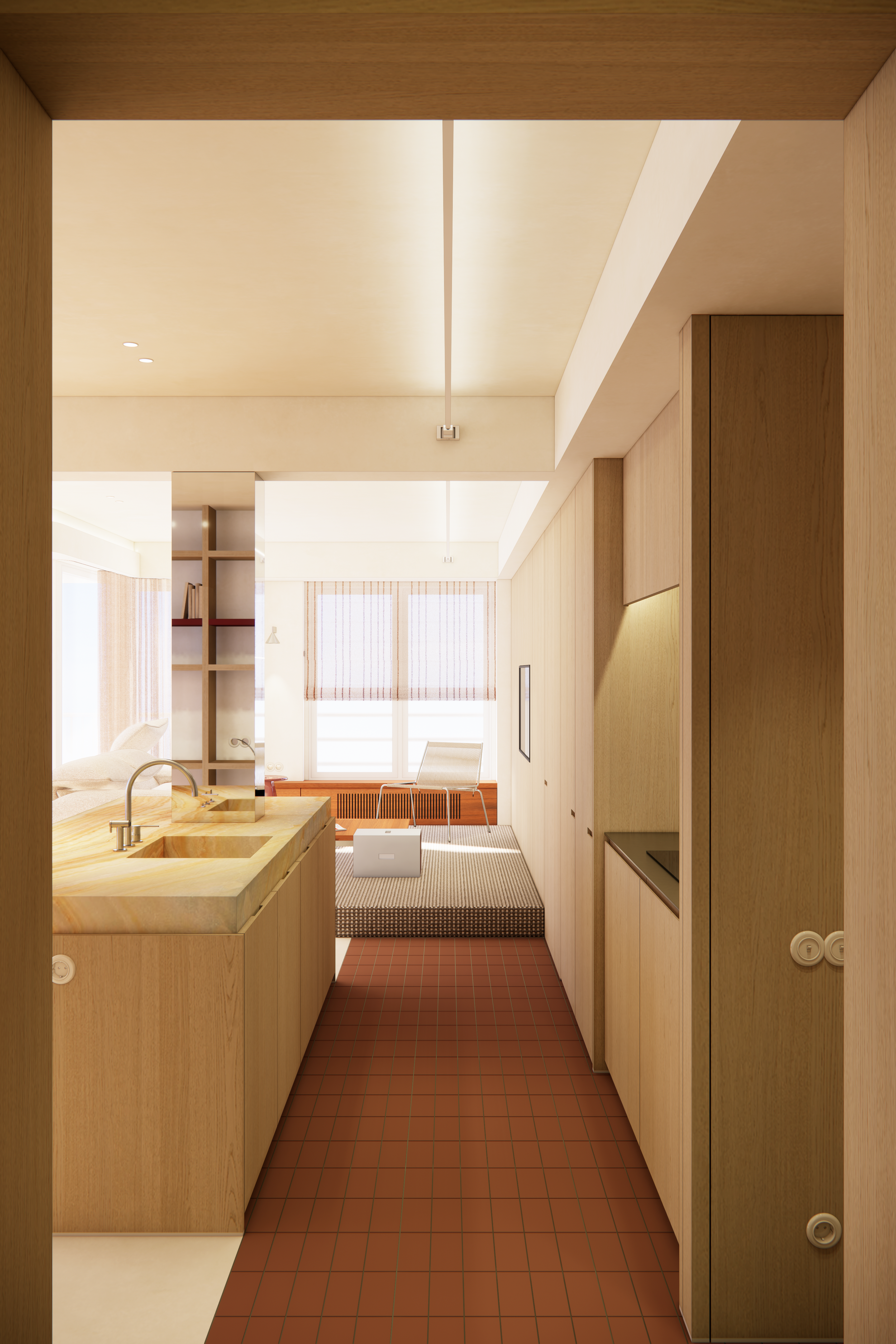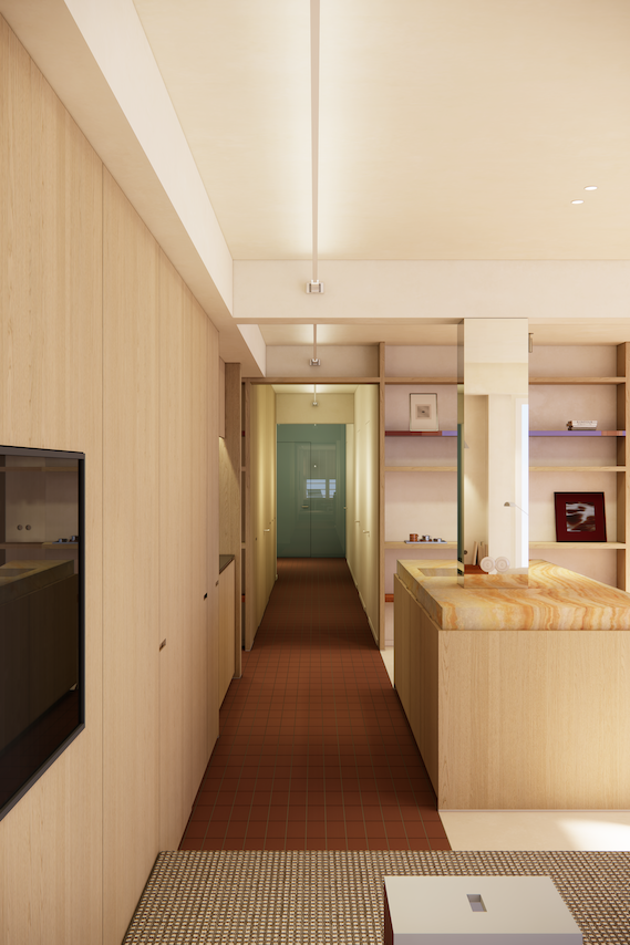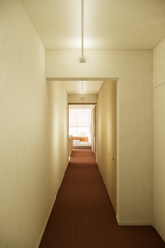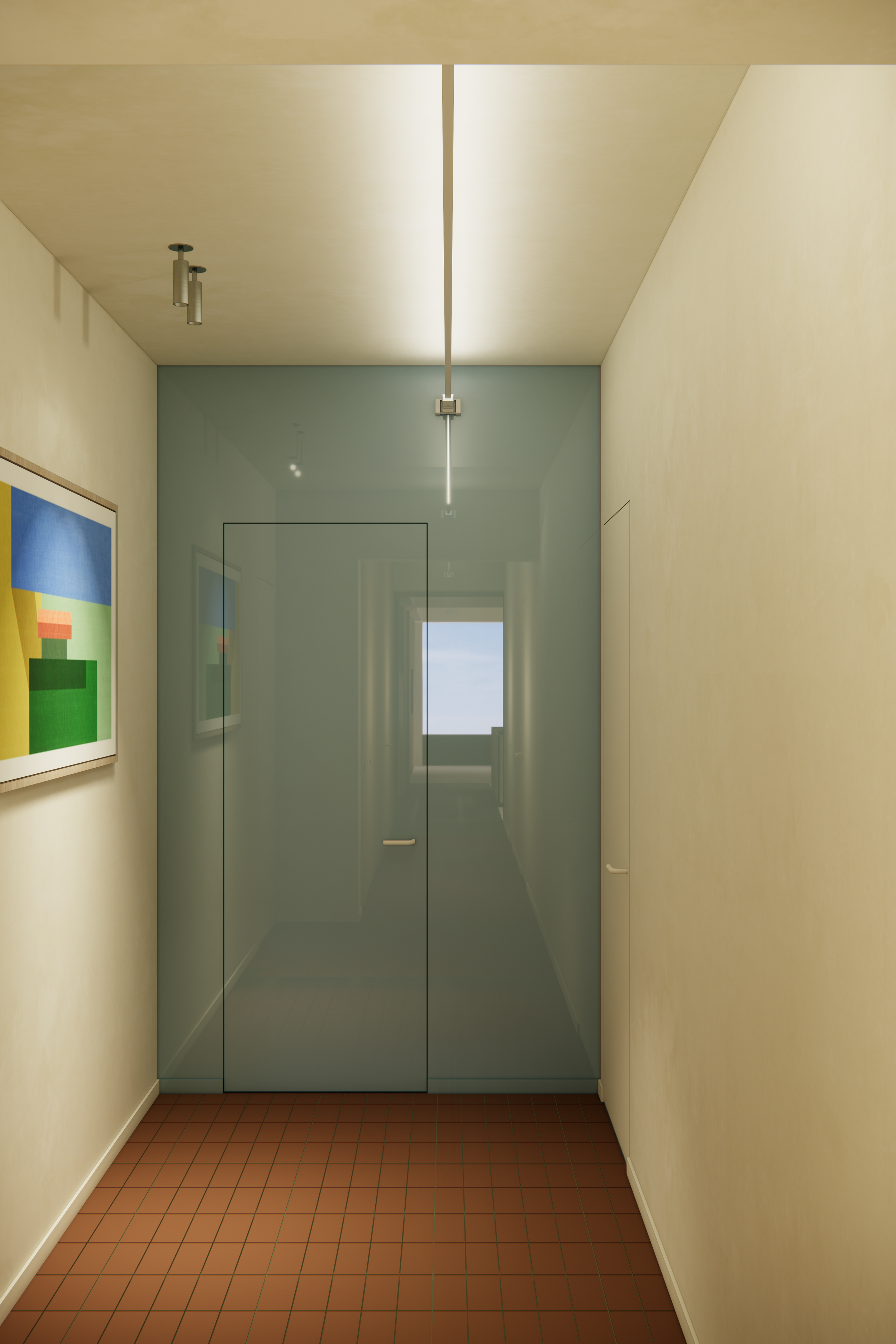 De ruggengraat van de woning is een lange, centrale as die de nacht- en dagfuncties met elkaar verbindt. De lijnverlichting aan het plafond accentueert deze beweging en verlicht de volledige diepte van het appartement met een indirecte, zachte gloed. Deze ingreep creëert een dwingende maar serene circulatie doorheen de verschillende leefruimtes.