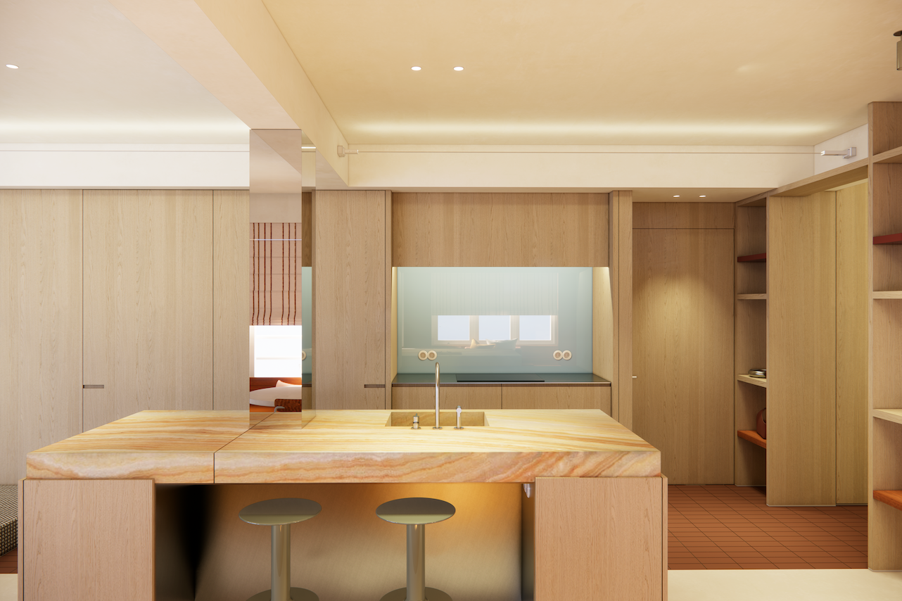 De materiaalkeuze is een bewuste knipoog naar de jaren '30, vertaald naar het nu. Warm eiken- en merantihout vormen een rustig decor voor een monumentaal kookeiland in gele onyx, dat als een sculpturaal ankerpunt in de ruimte staat. Hoogglans afwerkingen en strakke inox accenten zorgen voor een scherp, modern contrast met de rijke texturen van de stoffering.