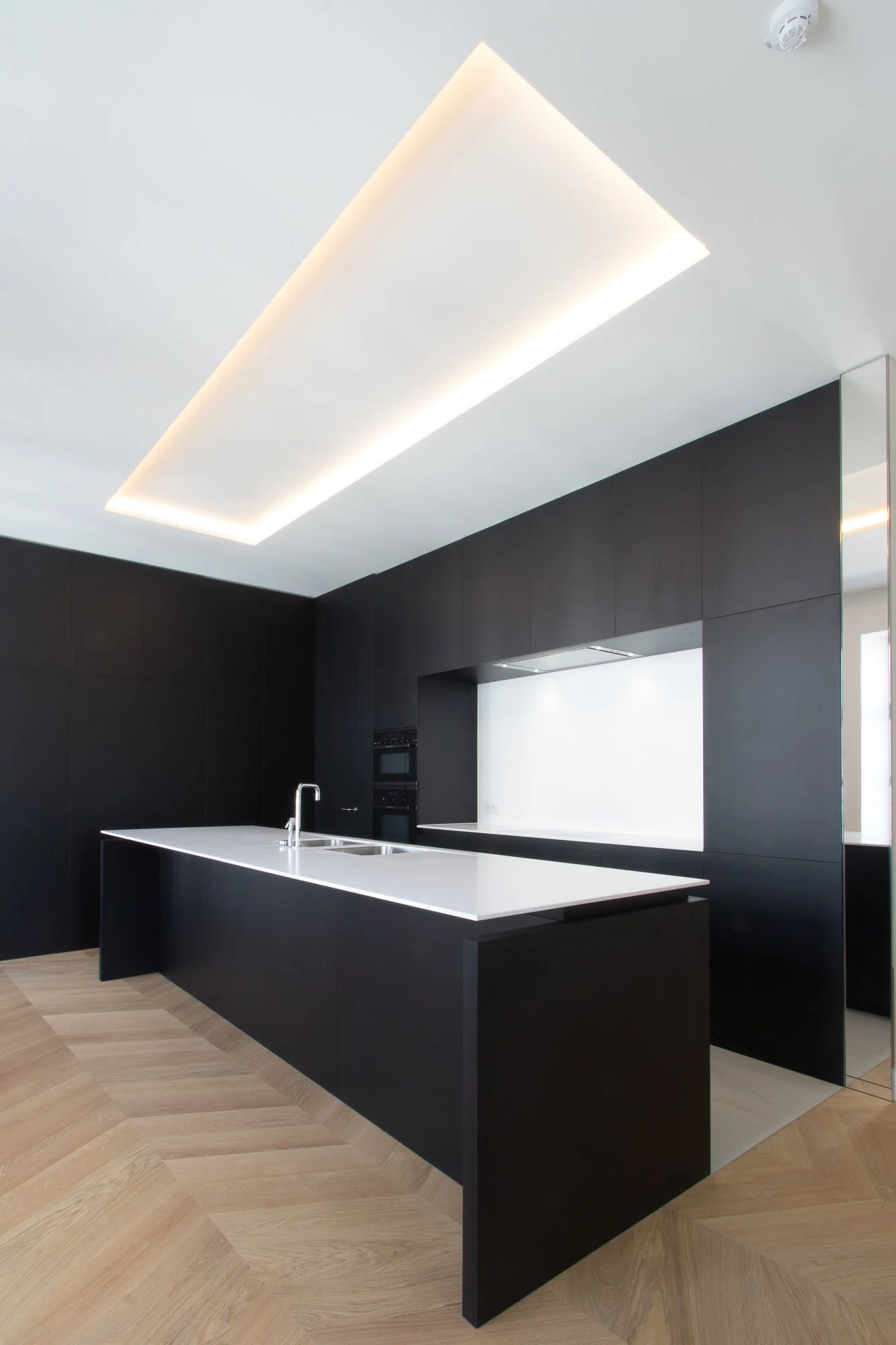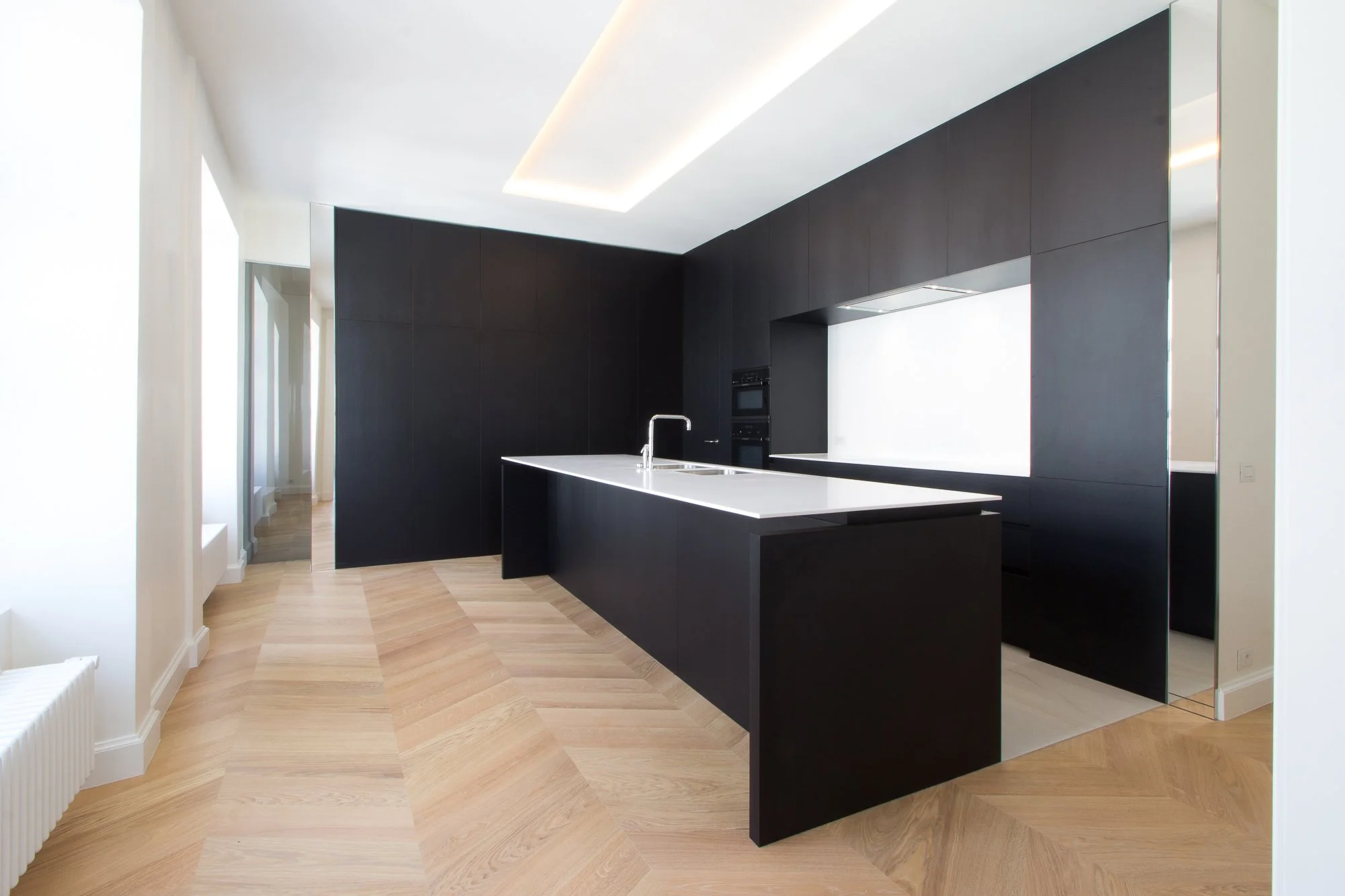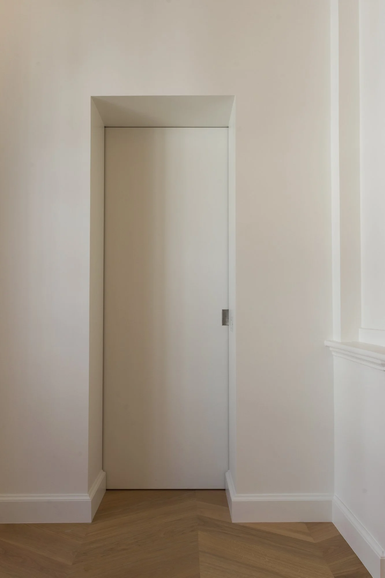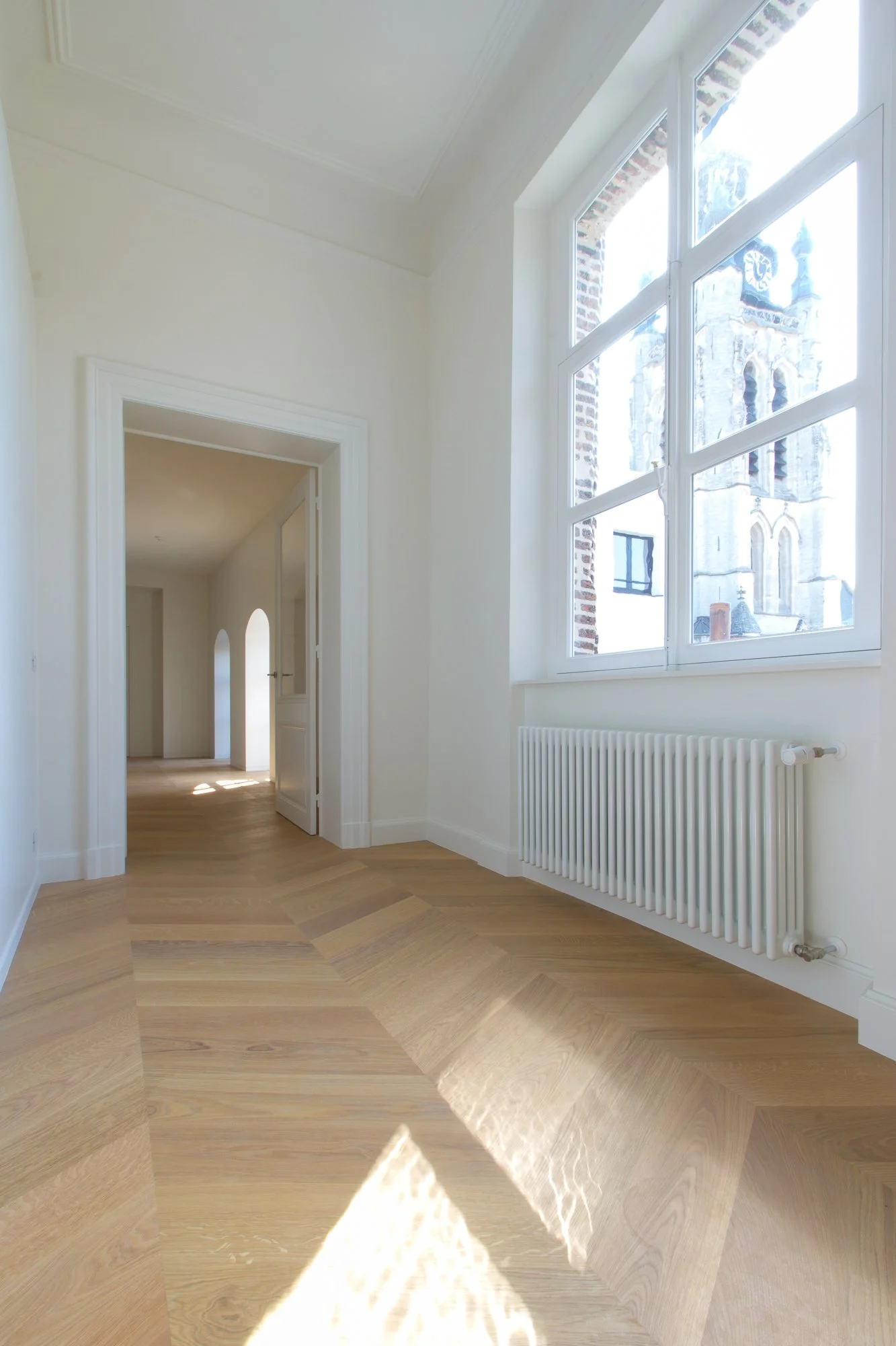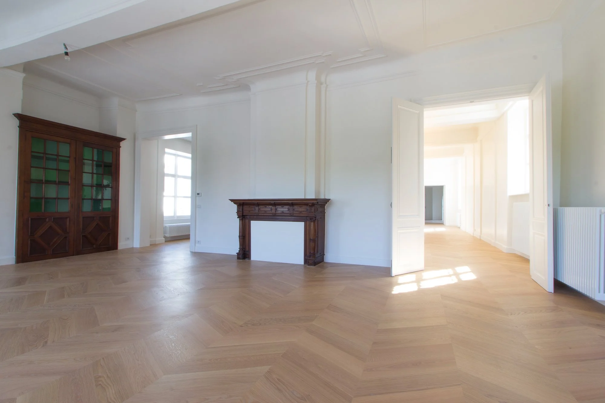 De vloer is uitgevoerd in een parket met Hongaarse punt – een bewuste knipoog naar de klassieke traditie, maar uitgevoerd met een moderne verfijning. Deze vloer vormt de basis waarop oud en nieuw elkaar ontmoeten: hij is sober genoeg om de aandacht bij de sierlijke plafonds en wanden te houden, maar spreekt dezelfde taal van vakmanschap als het oorspronkelijke pand.