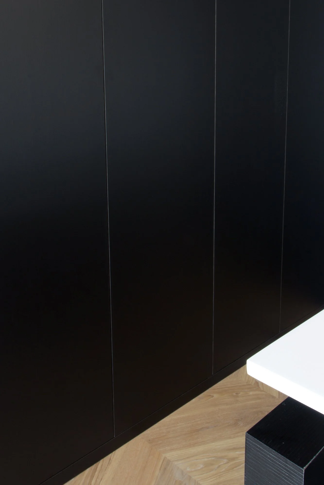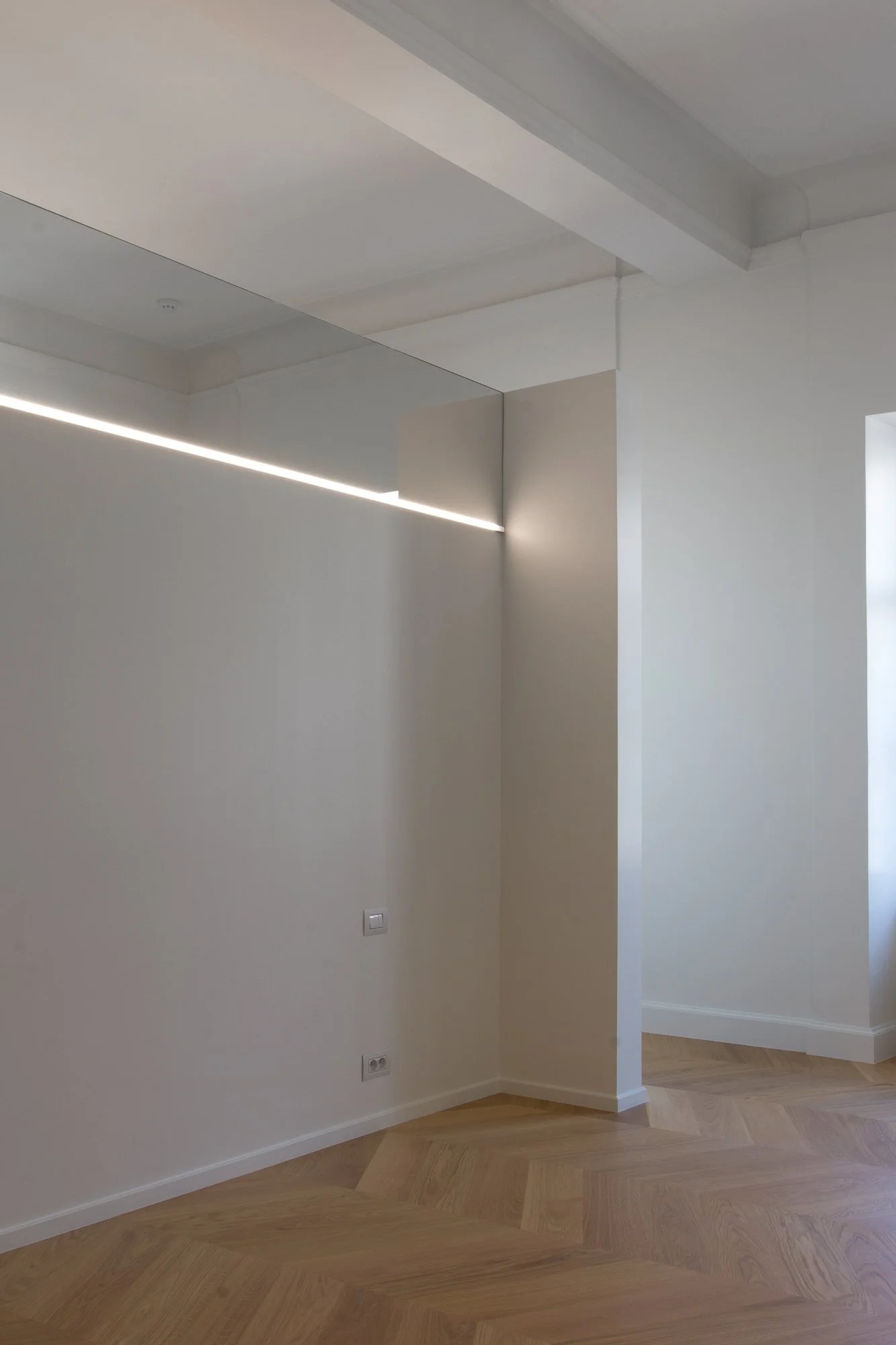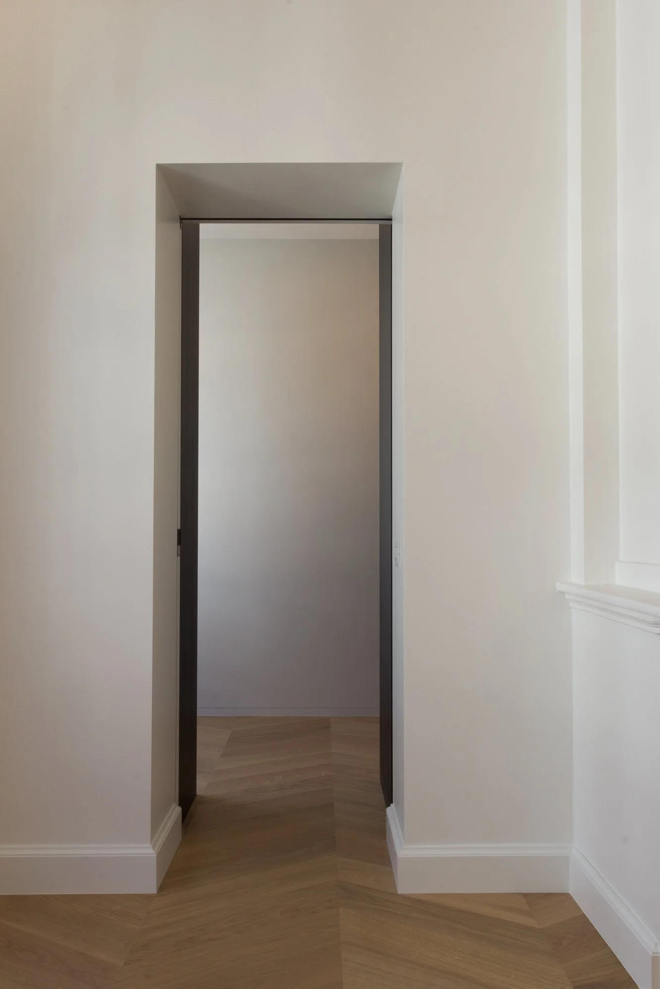 In PA22 vormde het aanwezige erfgoed de absolute prioriteit. Met uiterste precisie werden de originele sierlijsten en het bestaande ingebouwde meubilair gerestaureerd en in hun volle glorie hersteld. Door deze historische elementen met zorg te conserveren, blijft de authentieke ziel van de ruimte tastbaar en vormt het een rijk gedecoreerd decor voor de nieuwe bewoners.