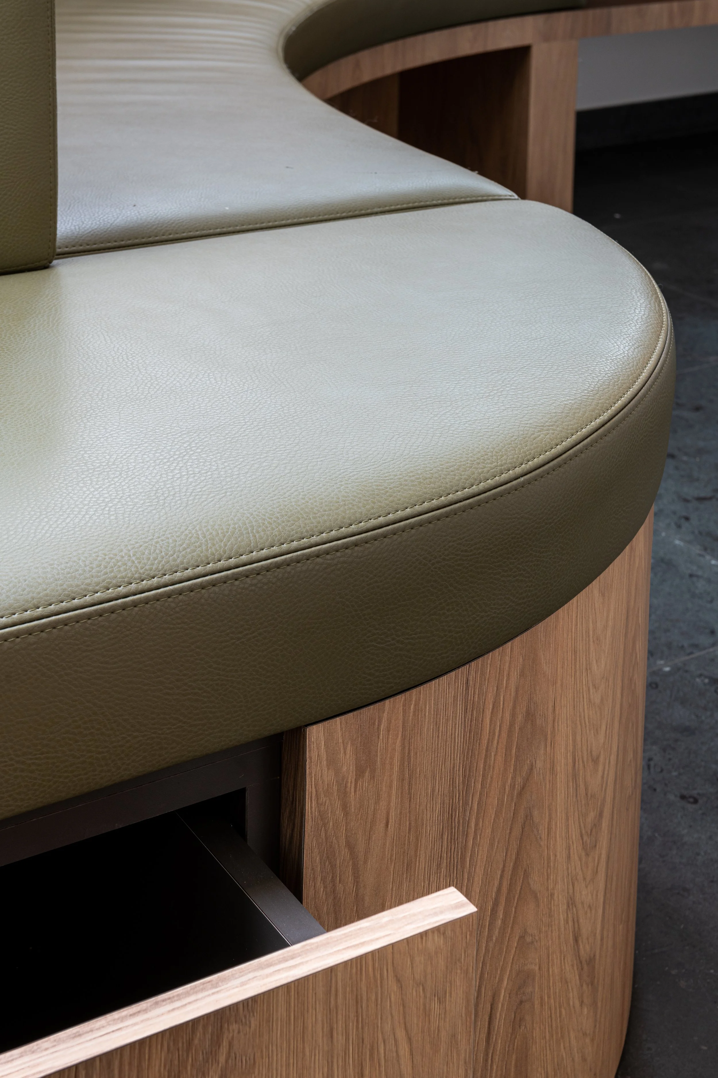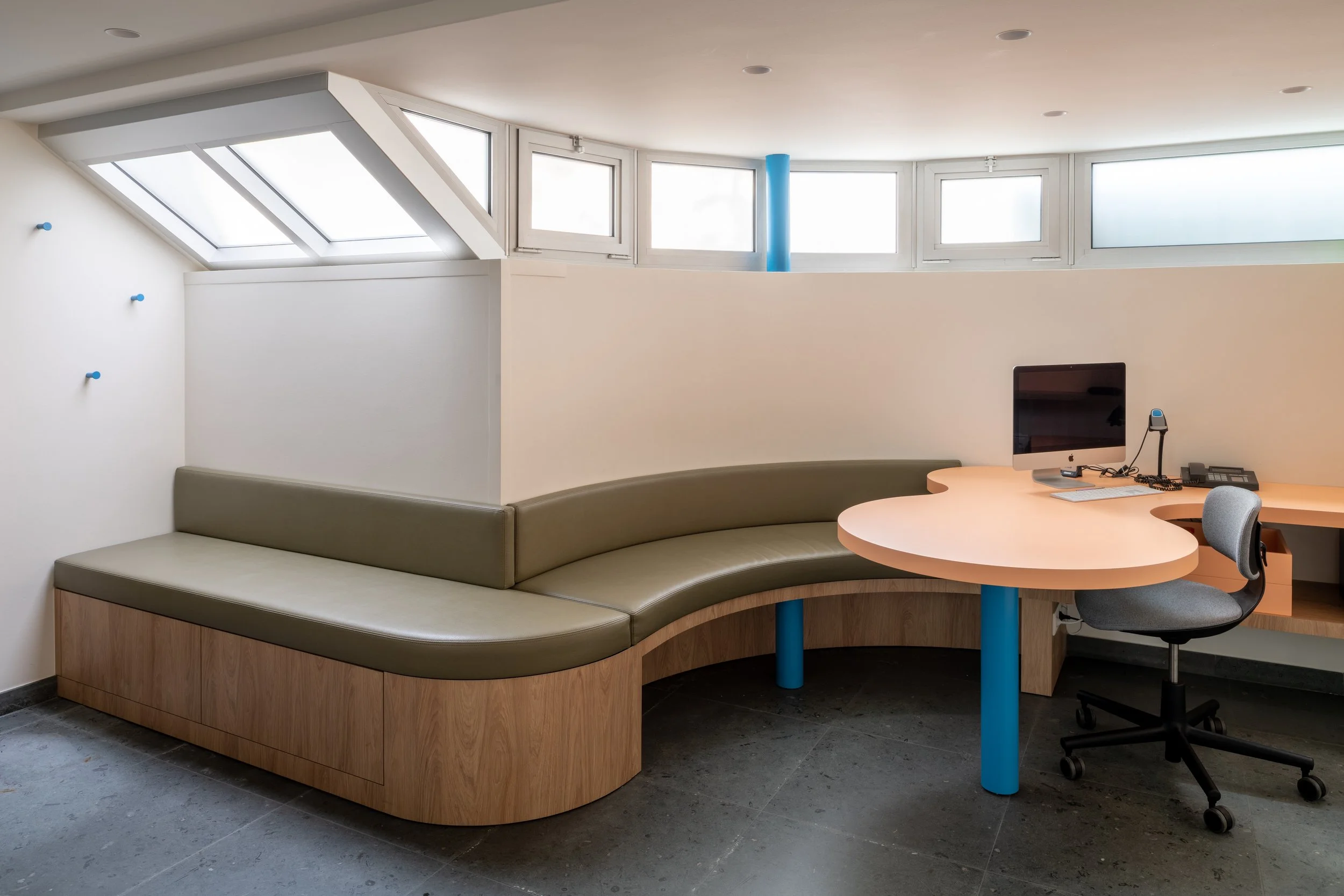 De maatwerk zitbank over de volledige lengte biedt plaats aan hele gezinnen, terwijl geïntegreerde lades met speelgoed de kleinste patiënten op hun gemak stellen.
