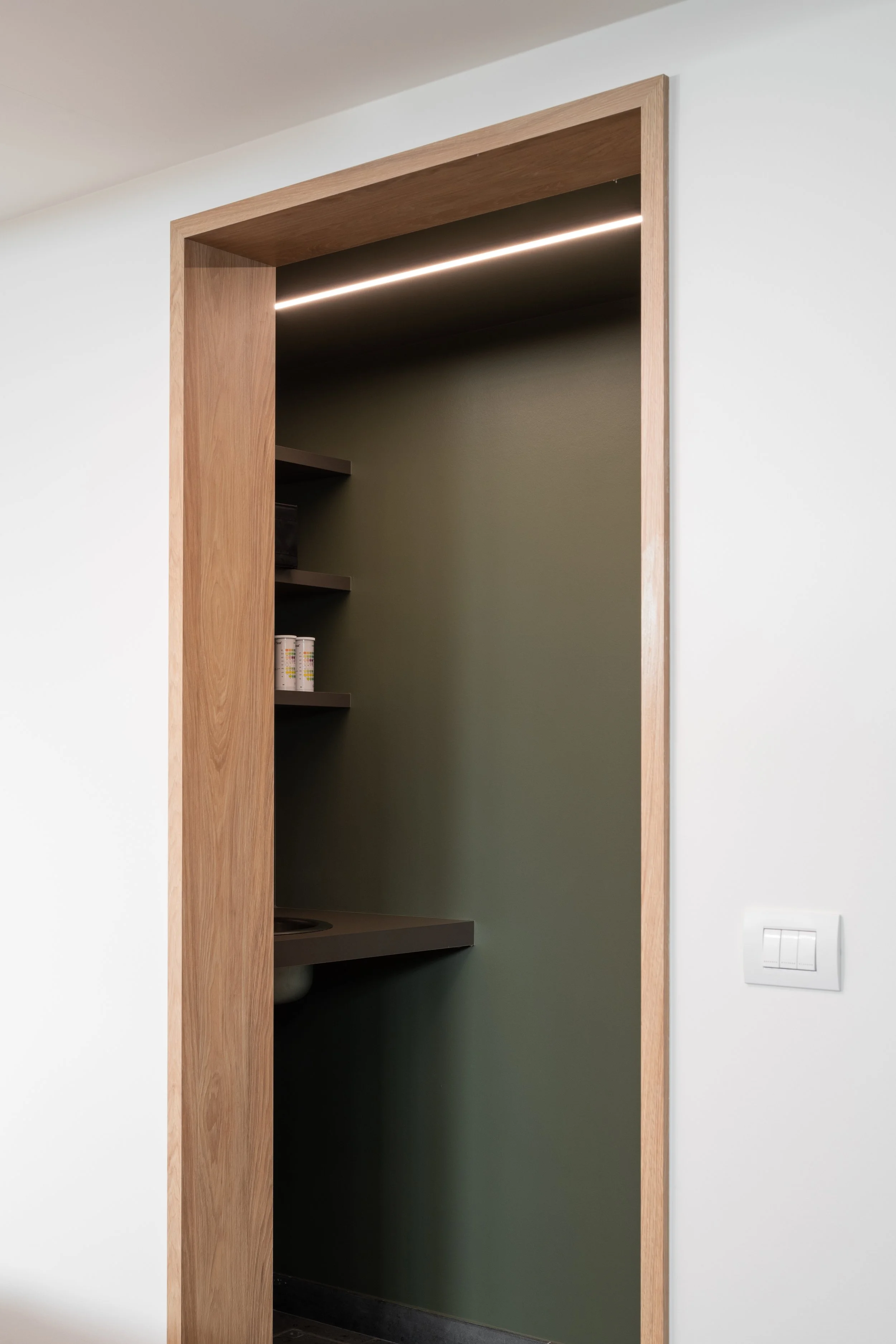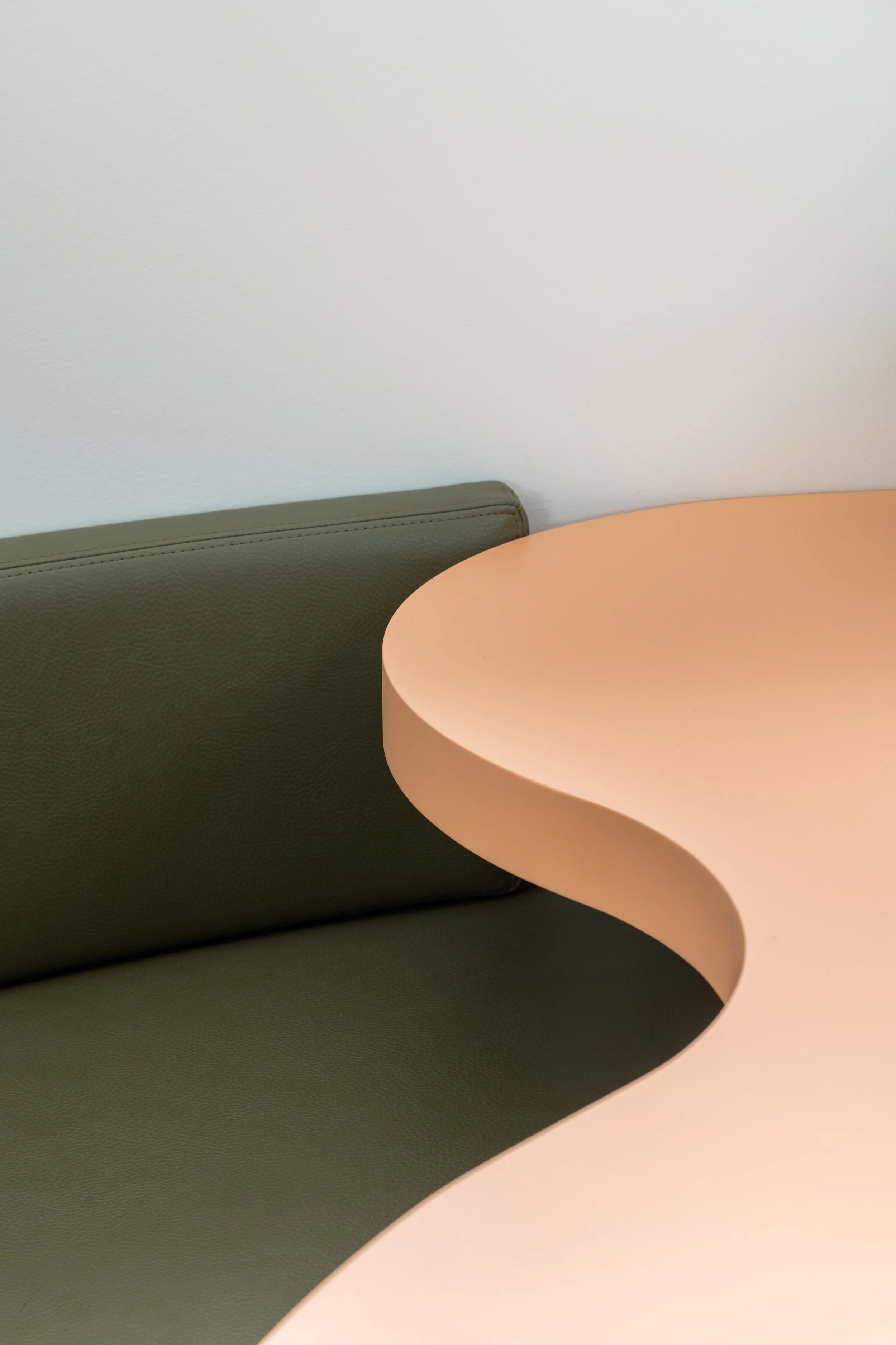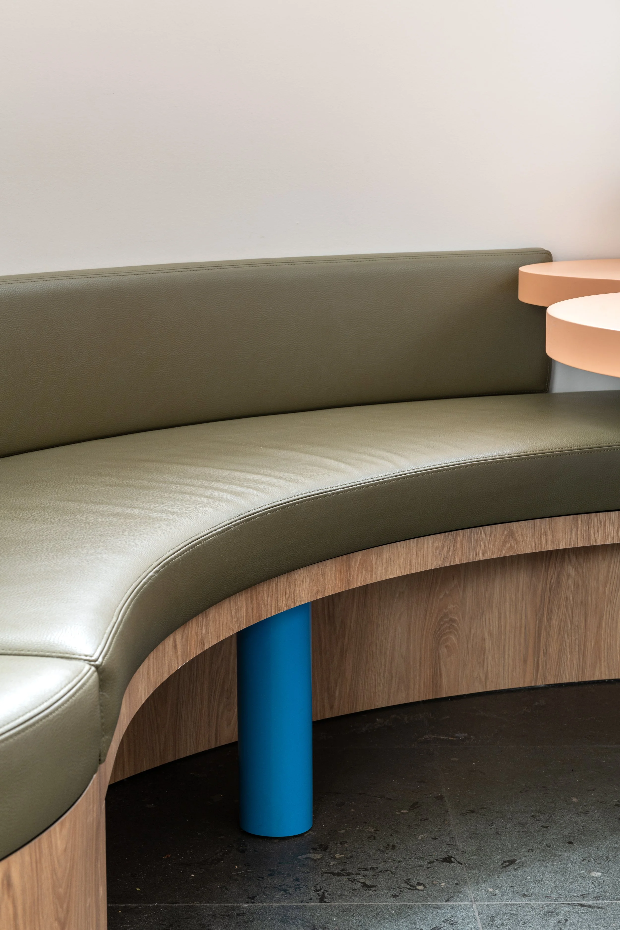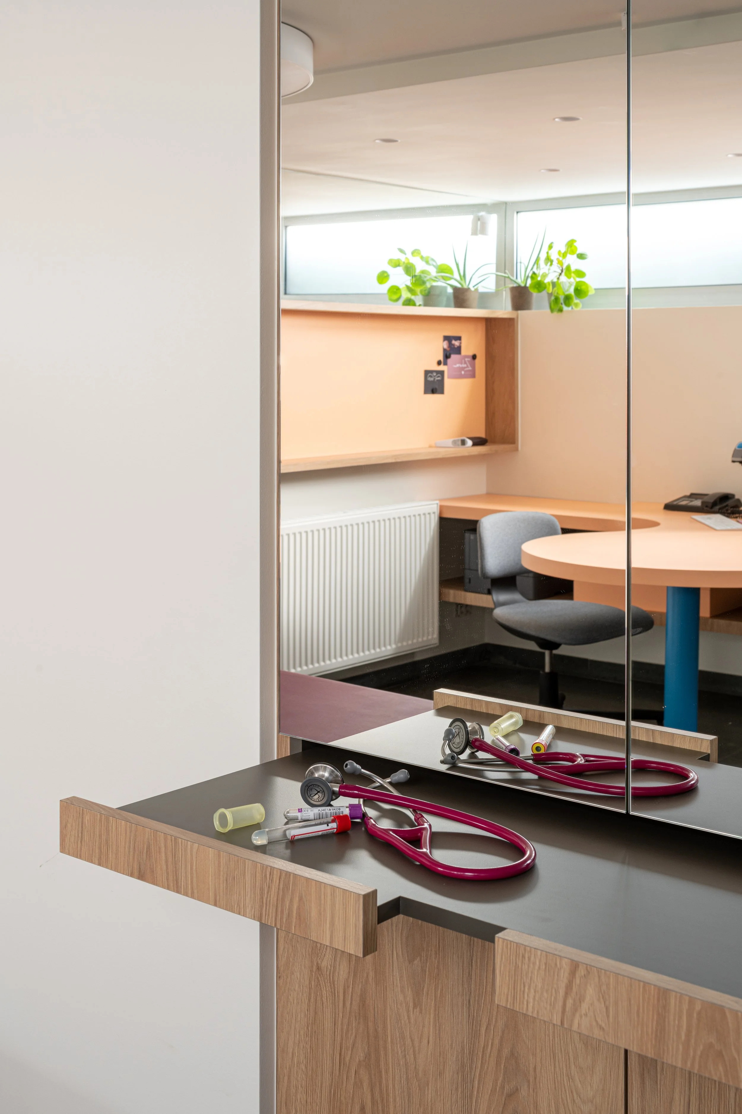 De bestaande architectuur met een karakteristieke gebogen wand vormde de grootste uitdaging én de oplossing. We benutten deze kromming om een intieme setting te creëren voor het patiëntengesprek. Strategisch geplaatste spiegels versterken de architecturale lijnen en vergroten de ruimte visueel.