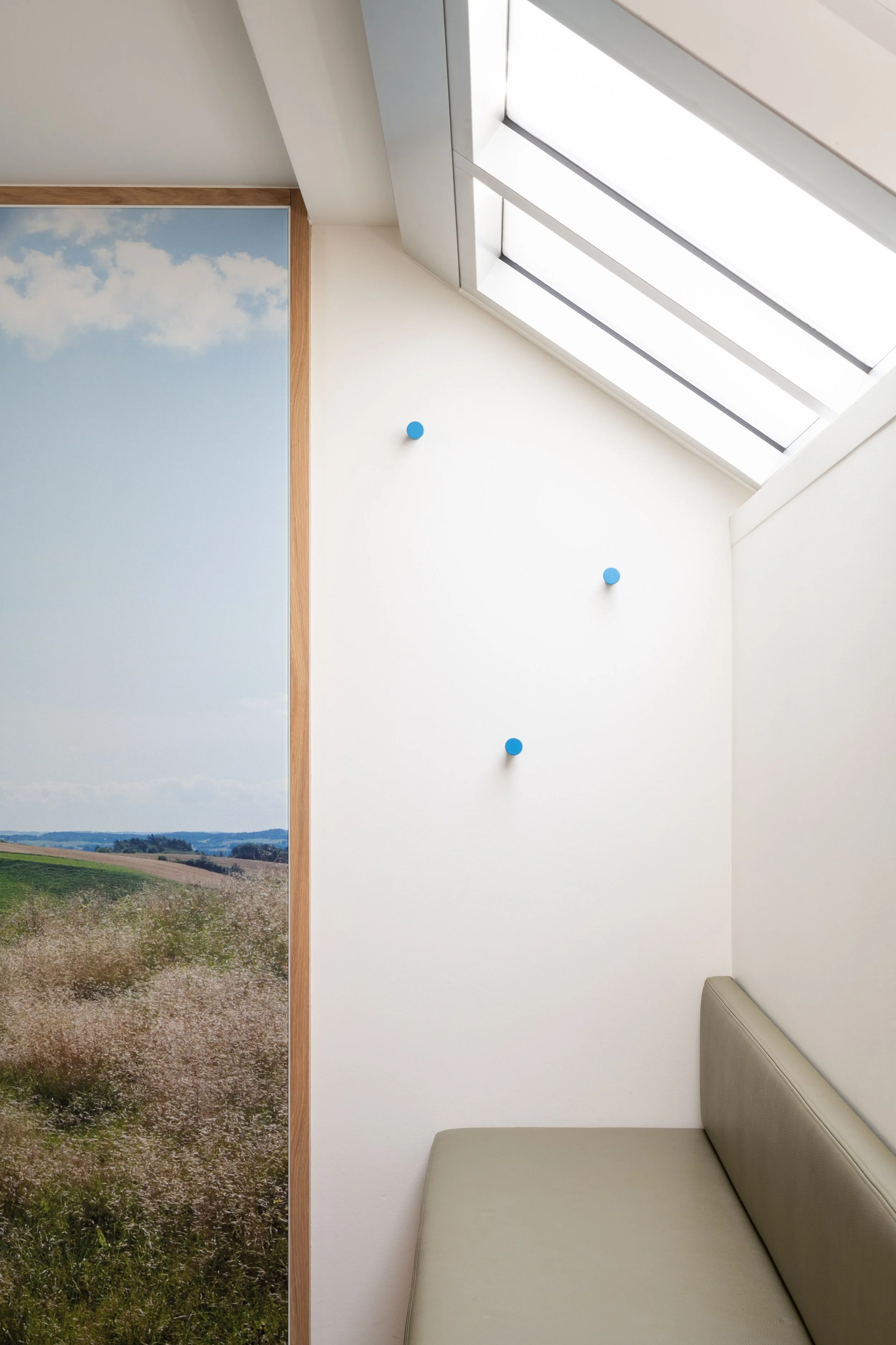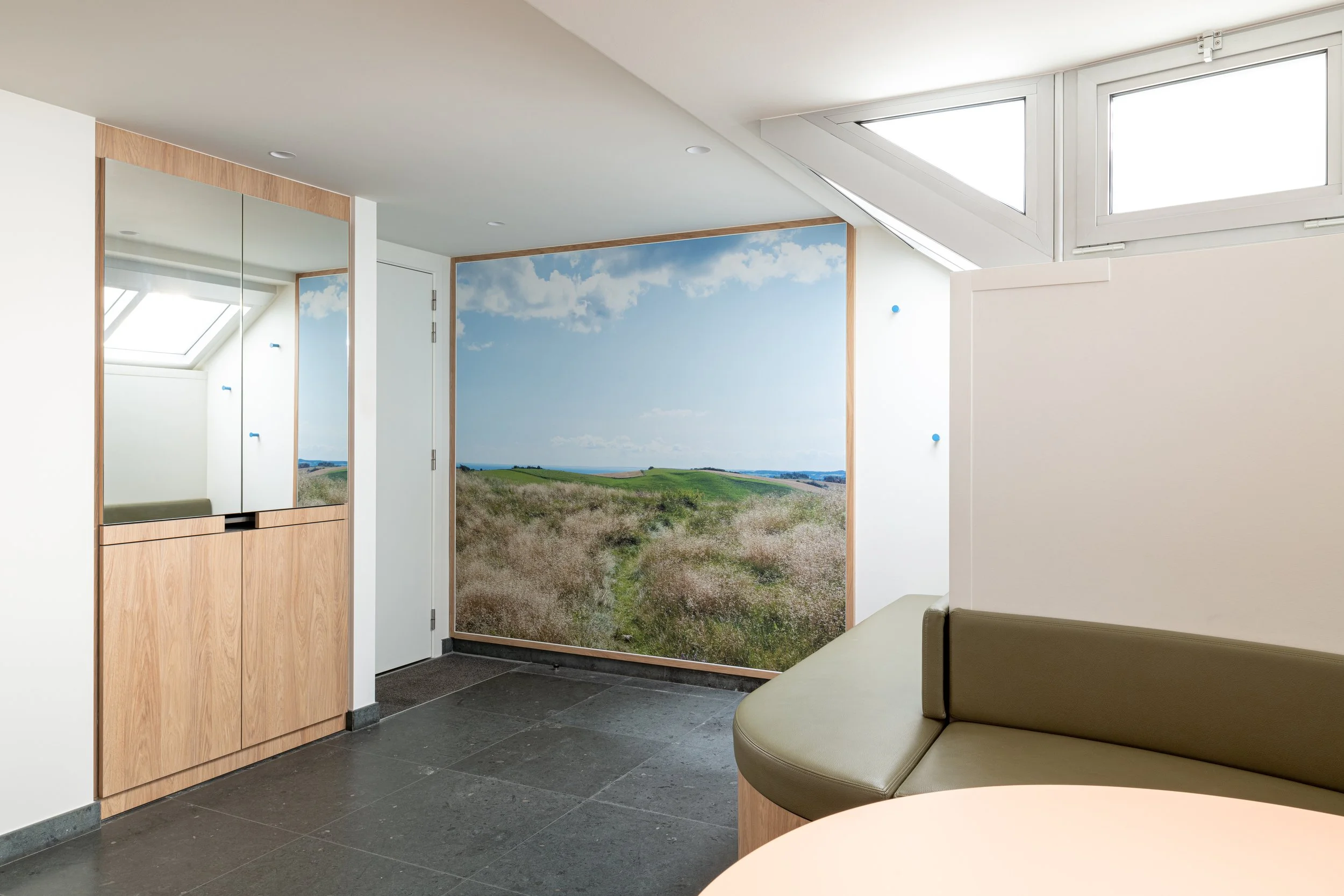 Bij gebrek aan een fysiek raam naar buiten, introduceerden we een grootformaat foto van een Deens landschap. Dit beeld dient als een visueel ankerpunt dat afleiding en rust biedt tijdens het onderzoek. De natuurlijke tinten uit deze foto vormden de directe inspiratie voor het gehele materiaal- en kleurenpalet van de praktijk, waardoor een serene en coherente eenheid is ontstaan.