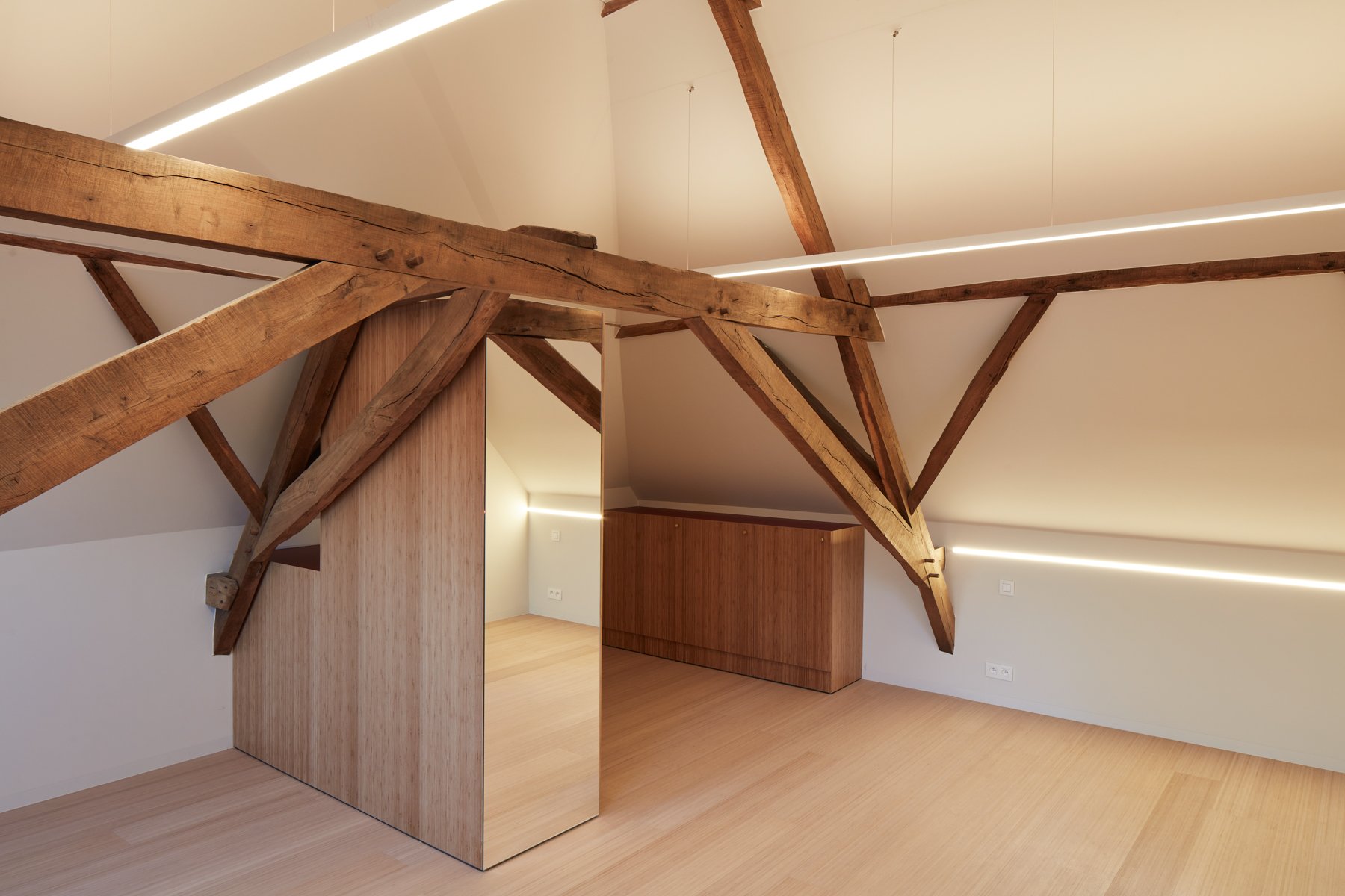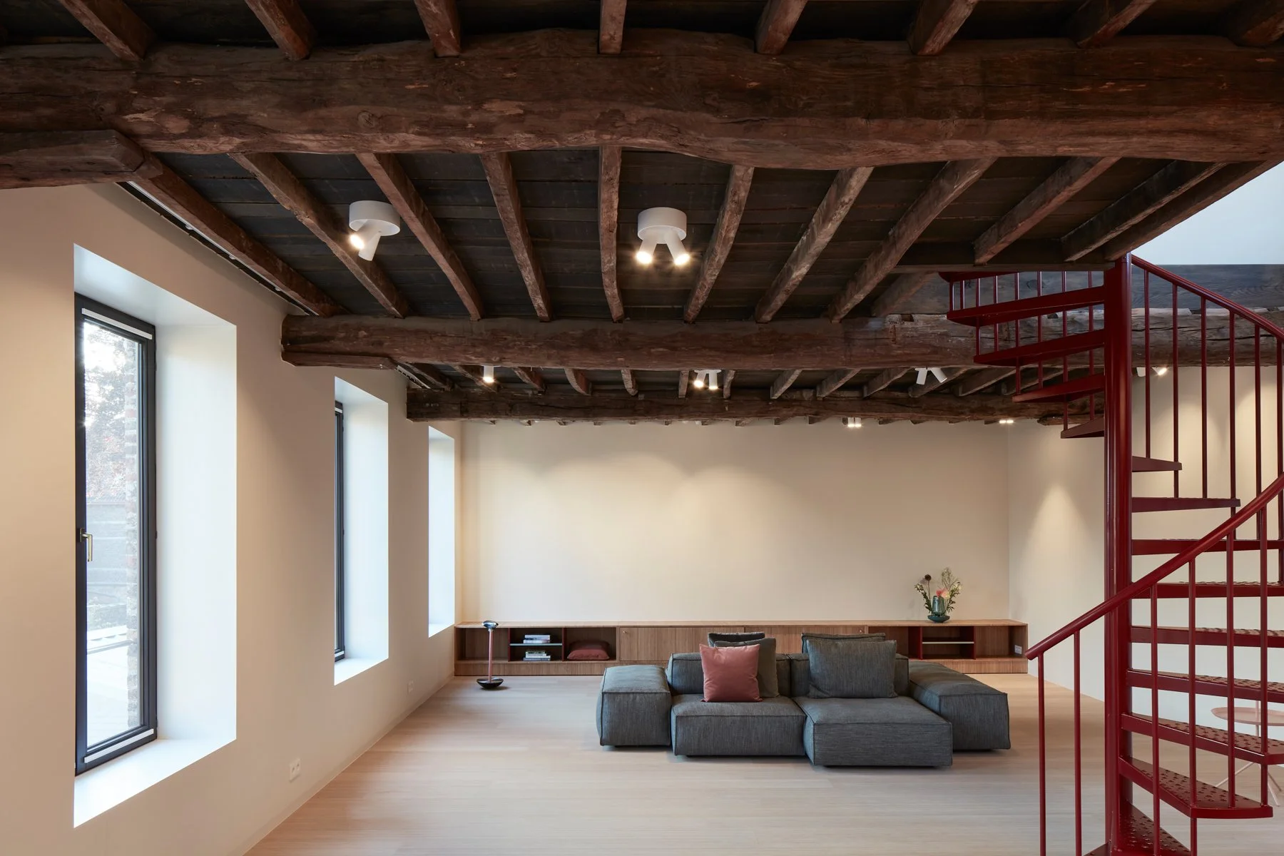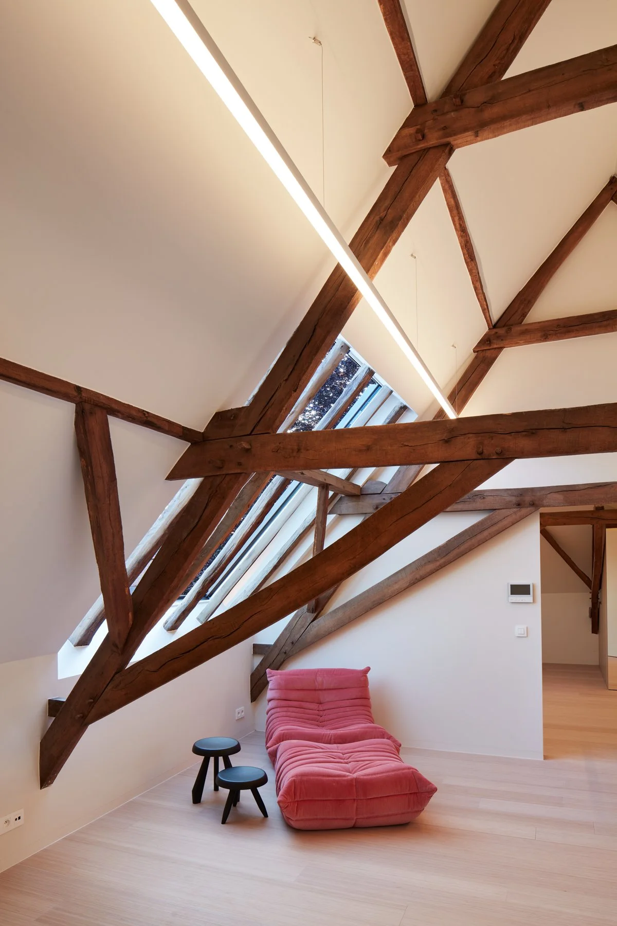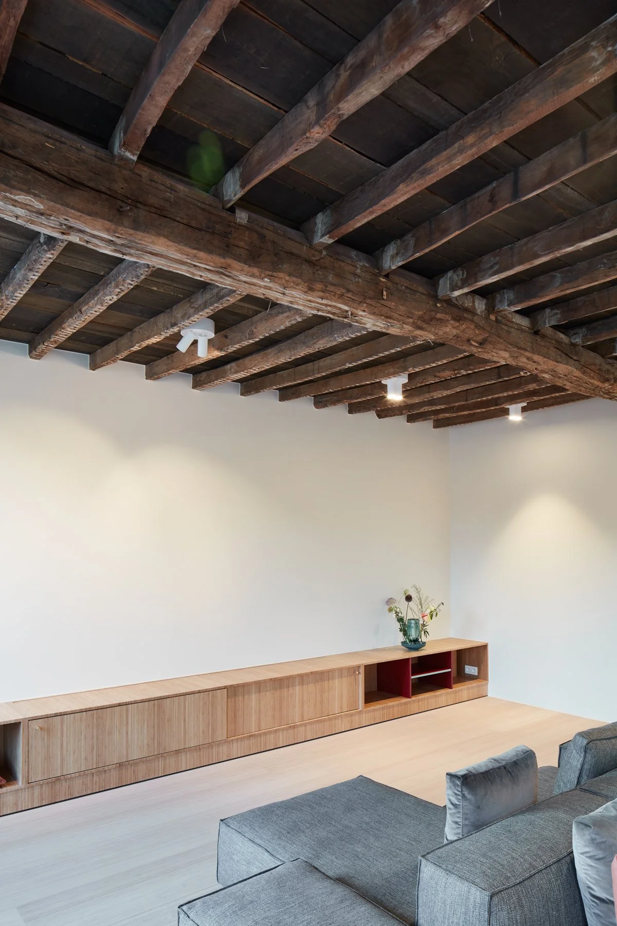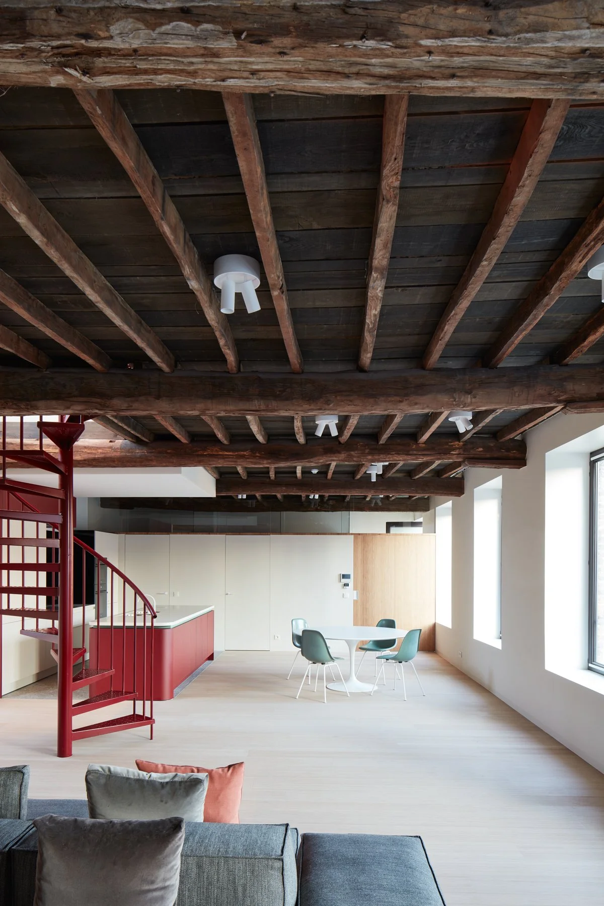 In deze duplex is de confrontatie tussen historisch erfgoed en nieuwe ingrepen tastbaarder dan ooit. We hebben het authentieke dakgebinte en de robuuste vloeropbouw van het 19e-eeuwse pakhuis bewust zichtbaar gelaten. Om deze monumentale structuur te eren, werken de nieuwe wanden met een beperkte hoogte, aangevuld met glas. Hierdoor blijft het dakgebinte vanuit elke hoek zichtbaar en stroomt het natuurlijke licht ongehinderd door de volledige woning.