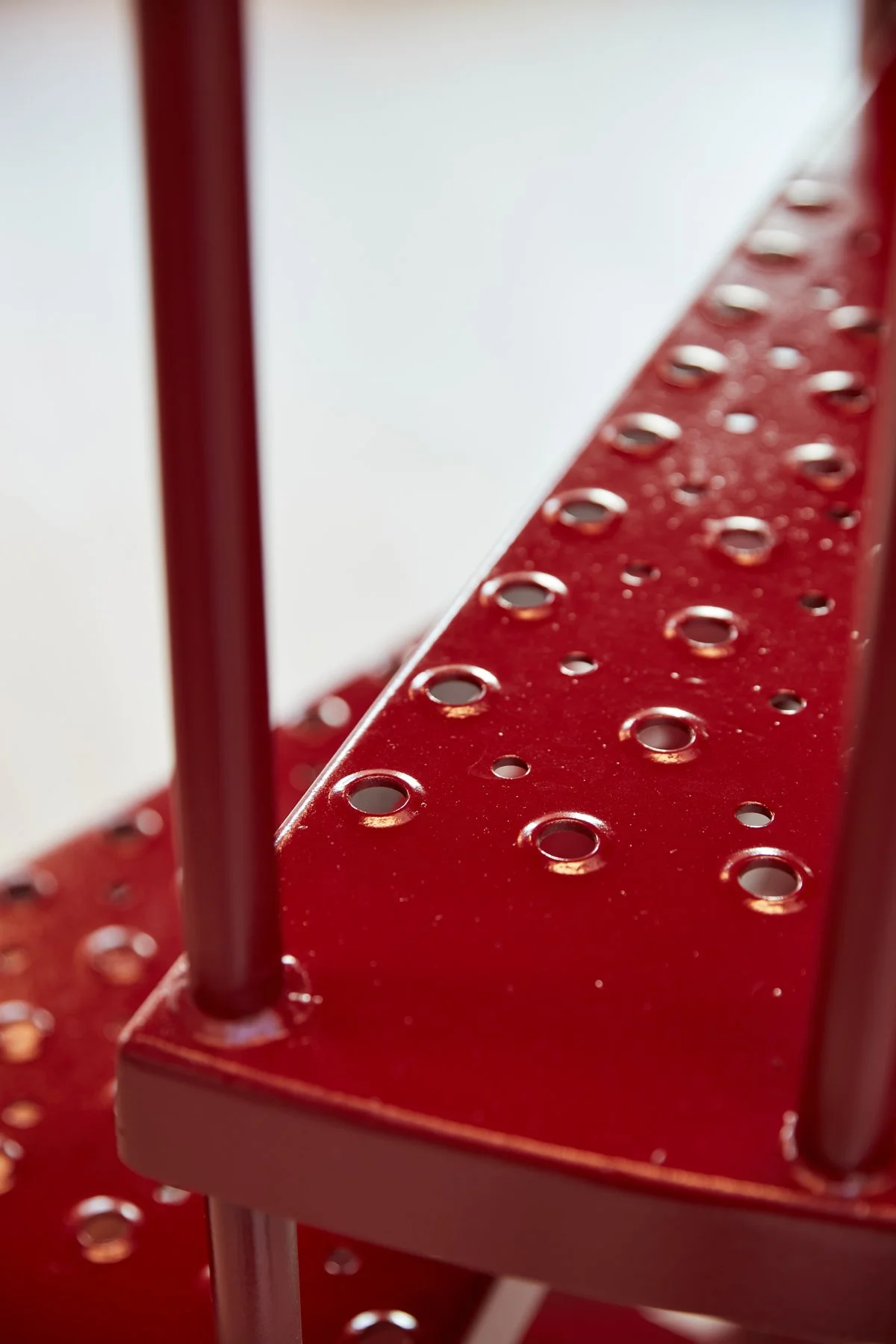 De bestaande trap die we konden hergebruiken kreeg een prominente rol in het ontwerp; door hem in een krachtig rood te hullen, fungeert hij als een verticaal ankerpunt in de ruimte.