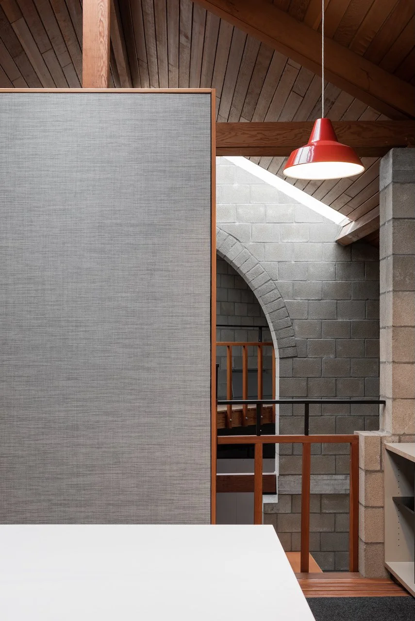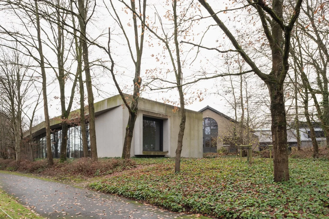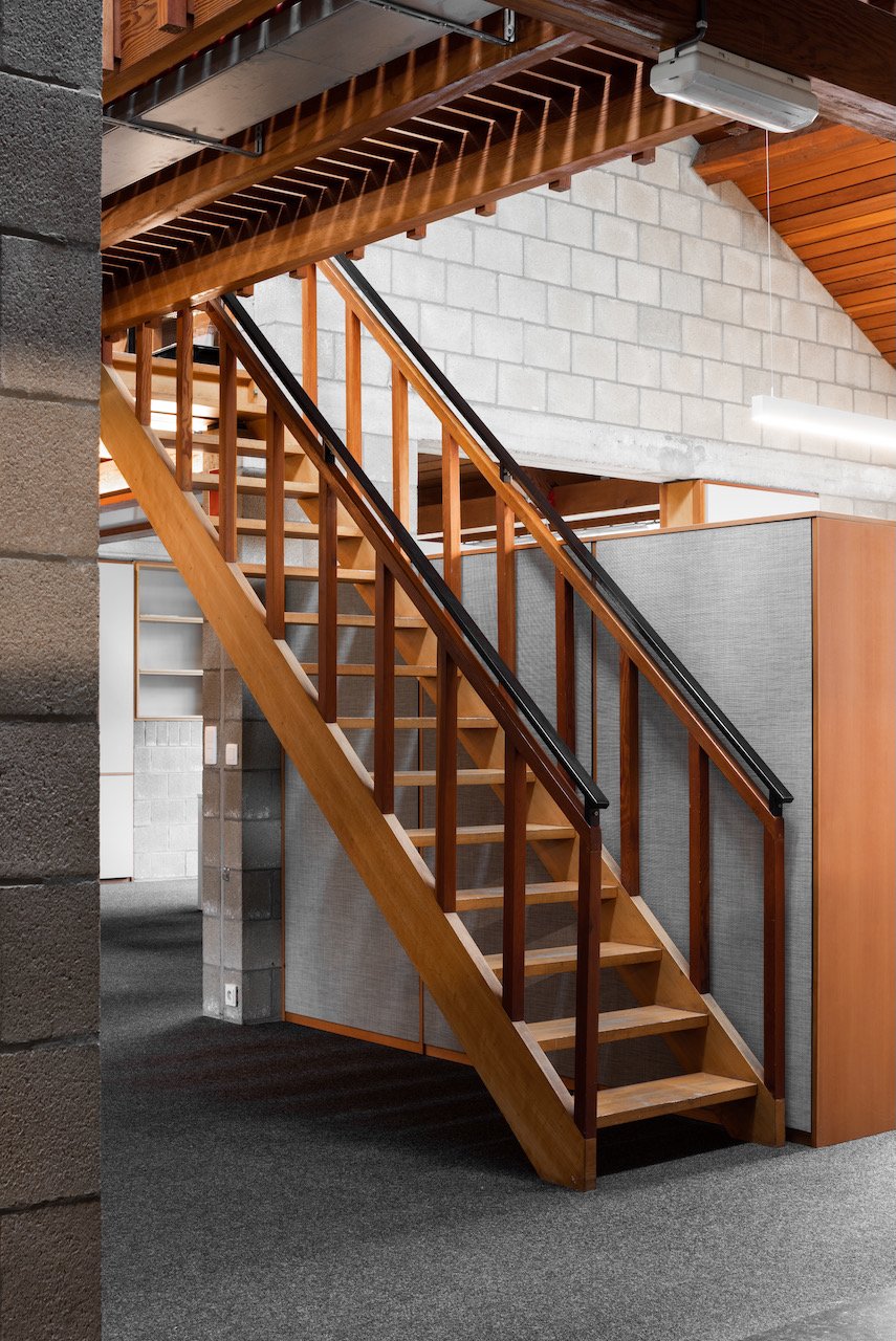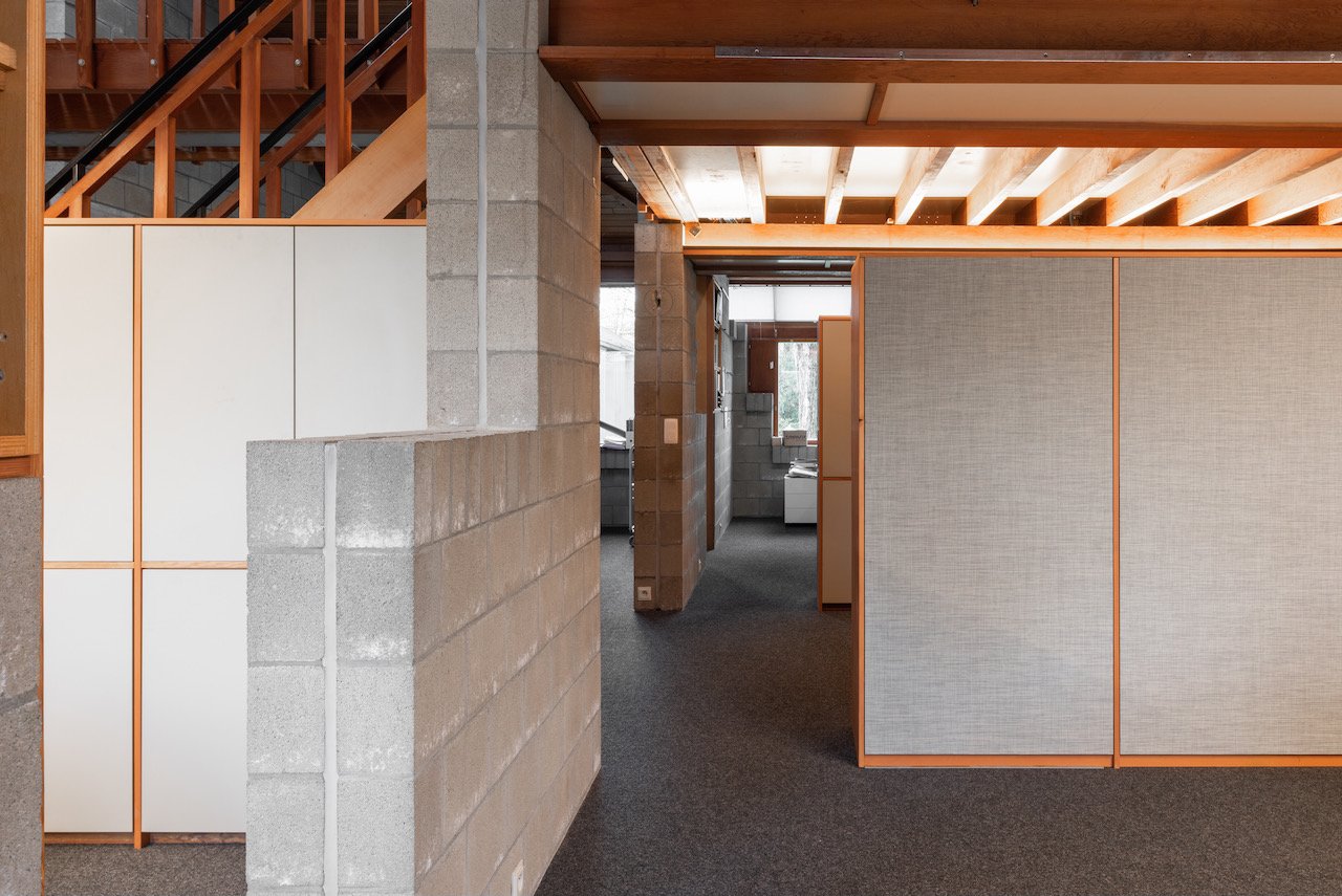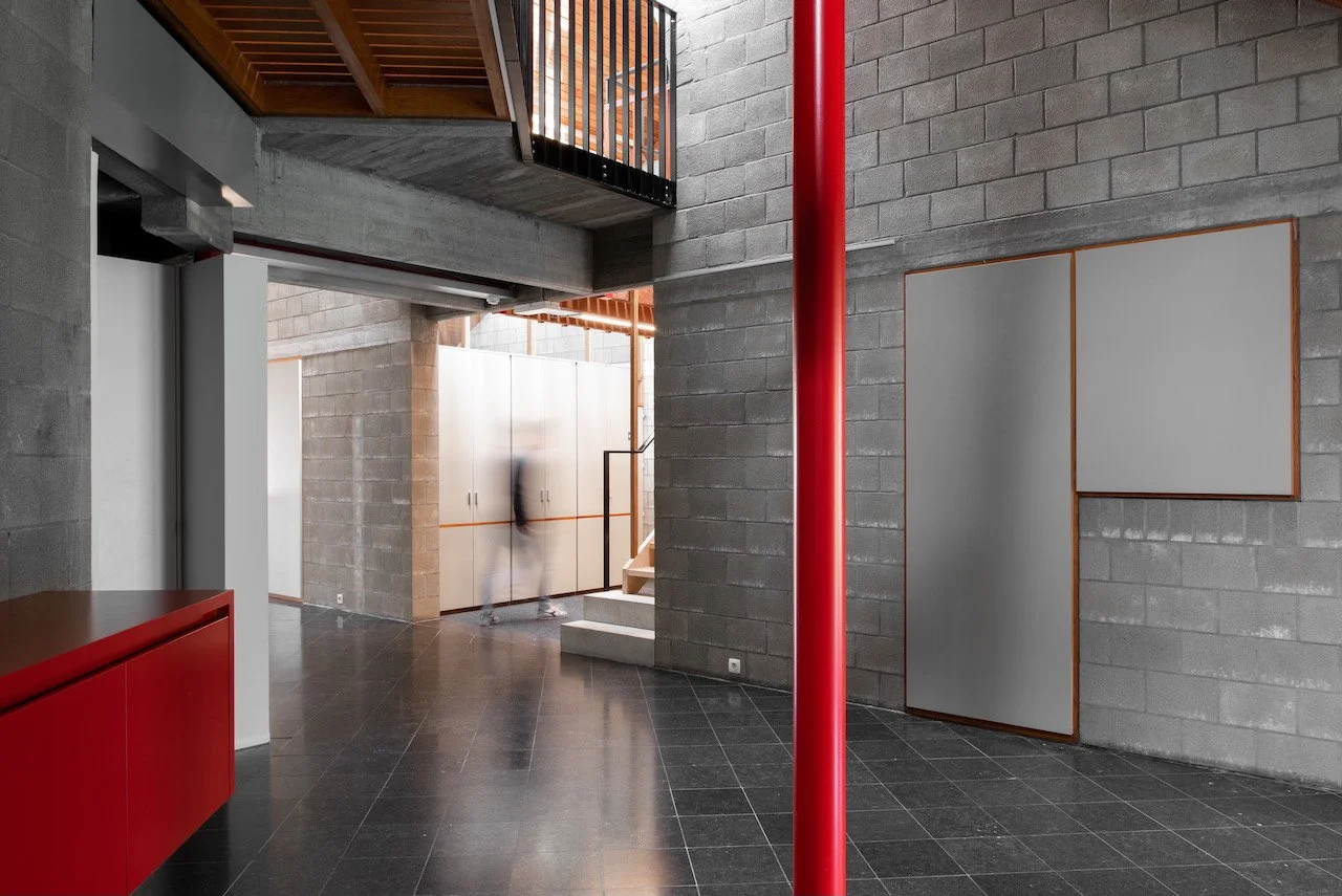 Het hoofdkantoor van Leiedal, een karaktervol gebouw uit de vroege jaren tachtig, kenmerkt zich door een open plan en de eerlijke esthetiek van zichtbare betonsteen. Met een verdubbeling van het aantal medewerkers groeide de nood aan een nieuwe indeling die het moderne werkcomfort verhoogt zonder de originele architecturale ziel aan te tasten.