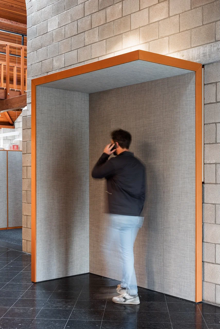 Voor de afwerking gebruikten we een innovatief en afwasbaar vinyltapijt – een hoogwaardig 'streekproduct' ontwikkeld door Print Acoustics en Ntgrate. Met diezelfde materialen ontwierpen we akoestische praatnissen in de gemeenschappelijke ruimtes, waar medewerkers ongestoord kunnen bellen of overleggen zonder hun collega's te hinderen.