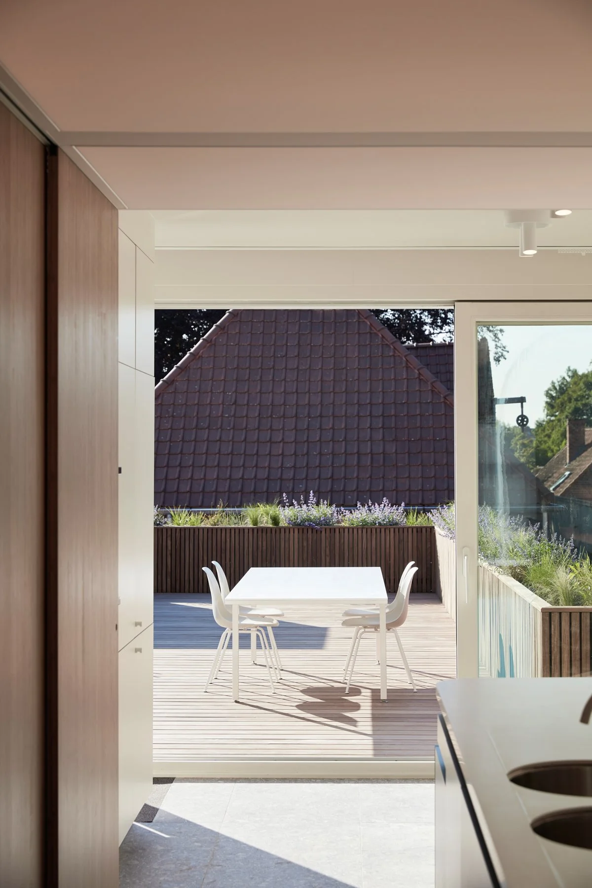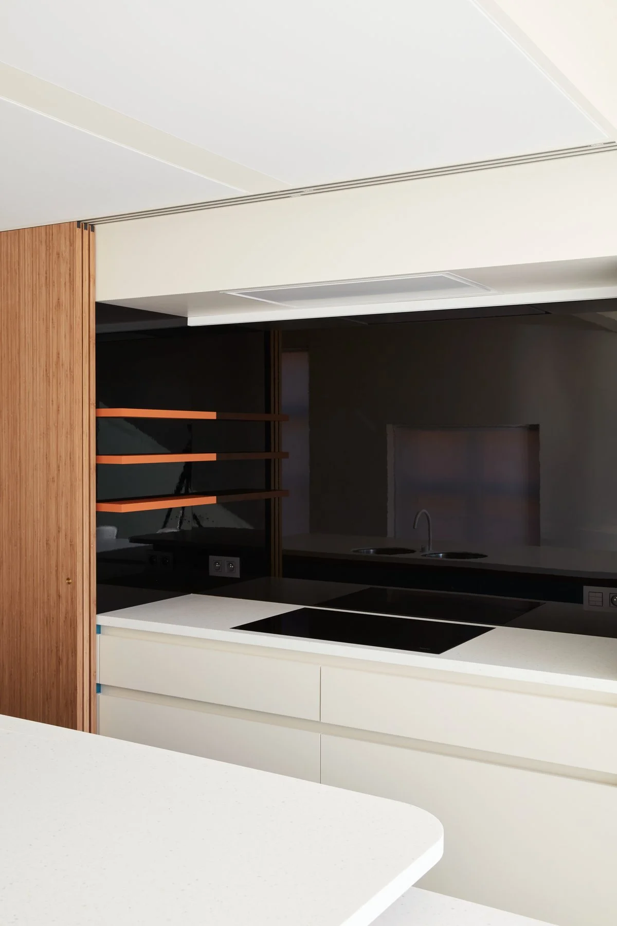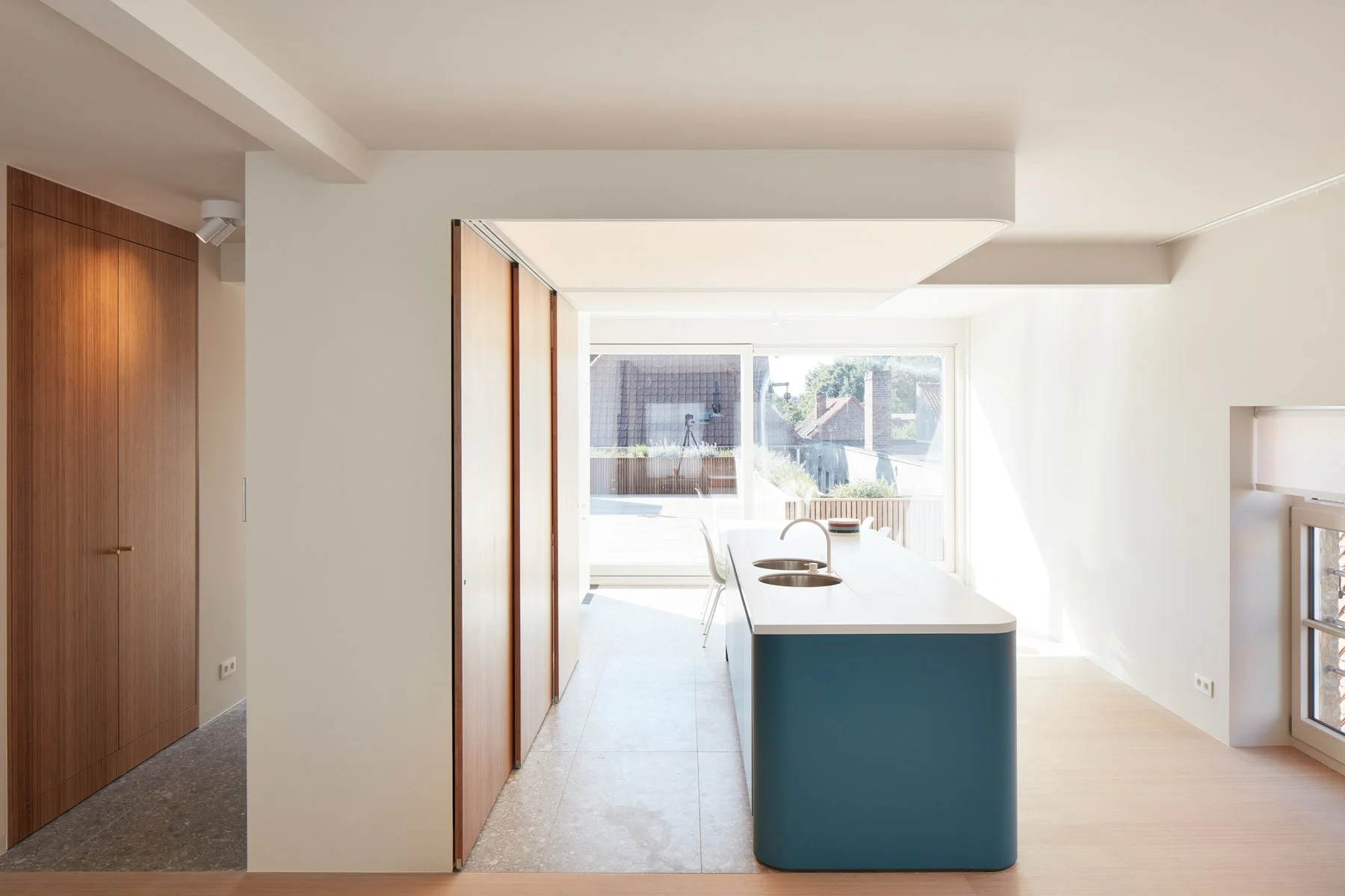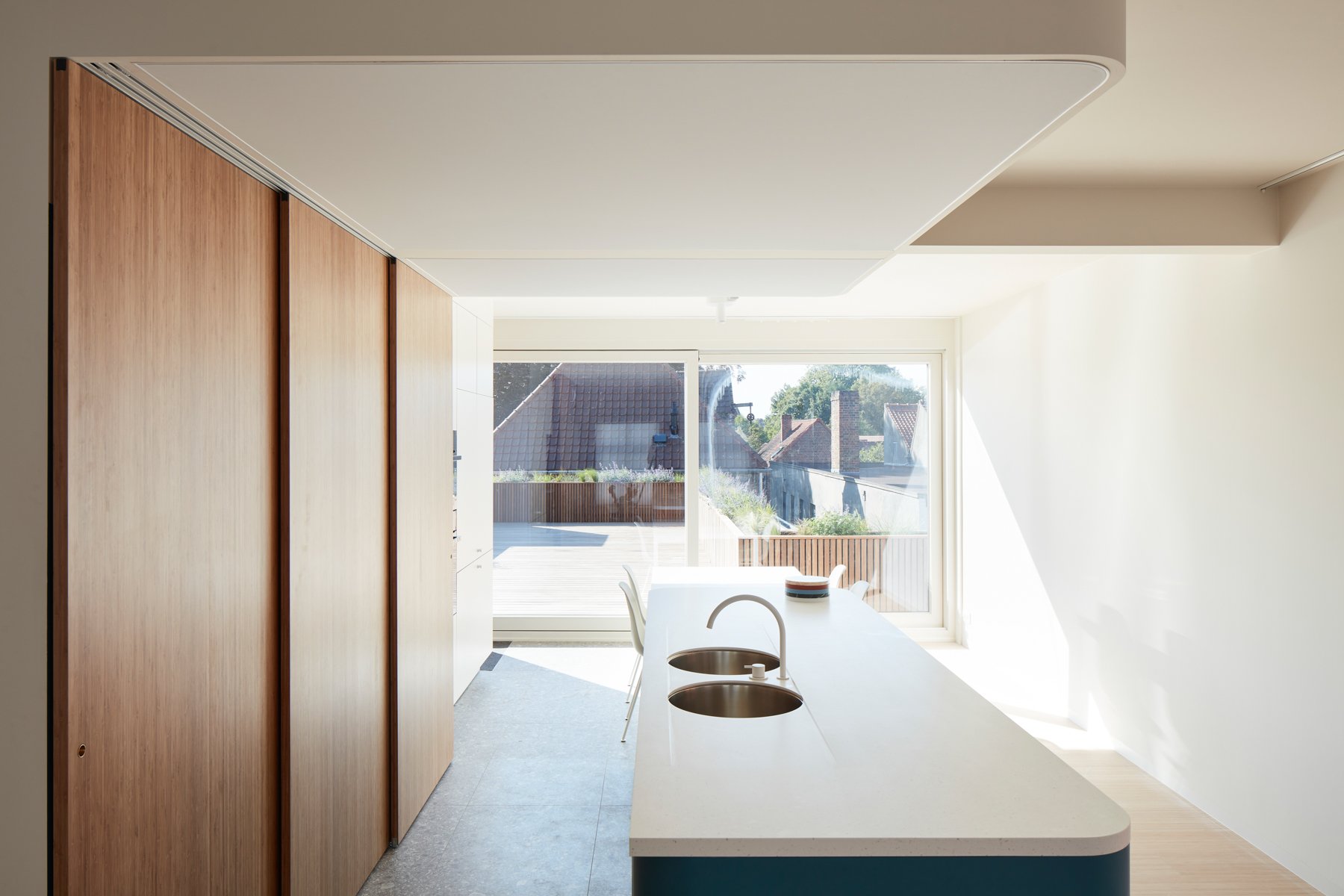 Dankzij vernuftige schuifwanden kunnen technische keukenfuncties worden verborgen, waardoor de leefruimte onmiddellijk transformeert tot een rustige zone.