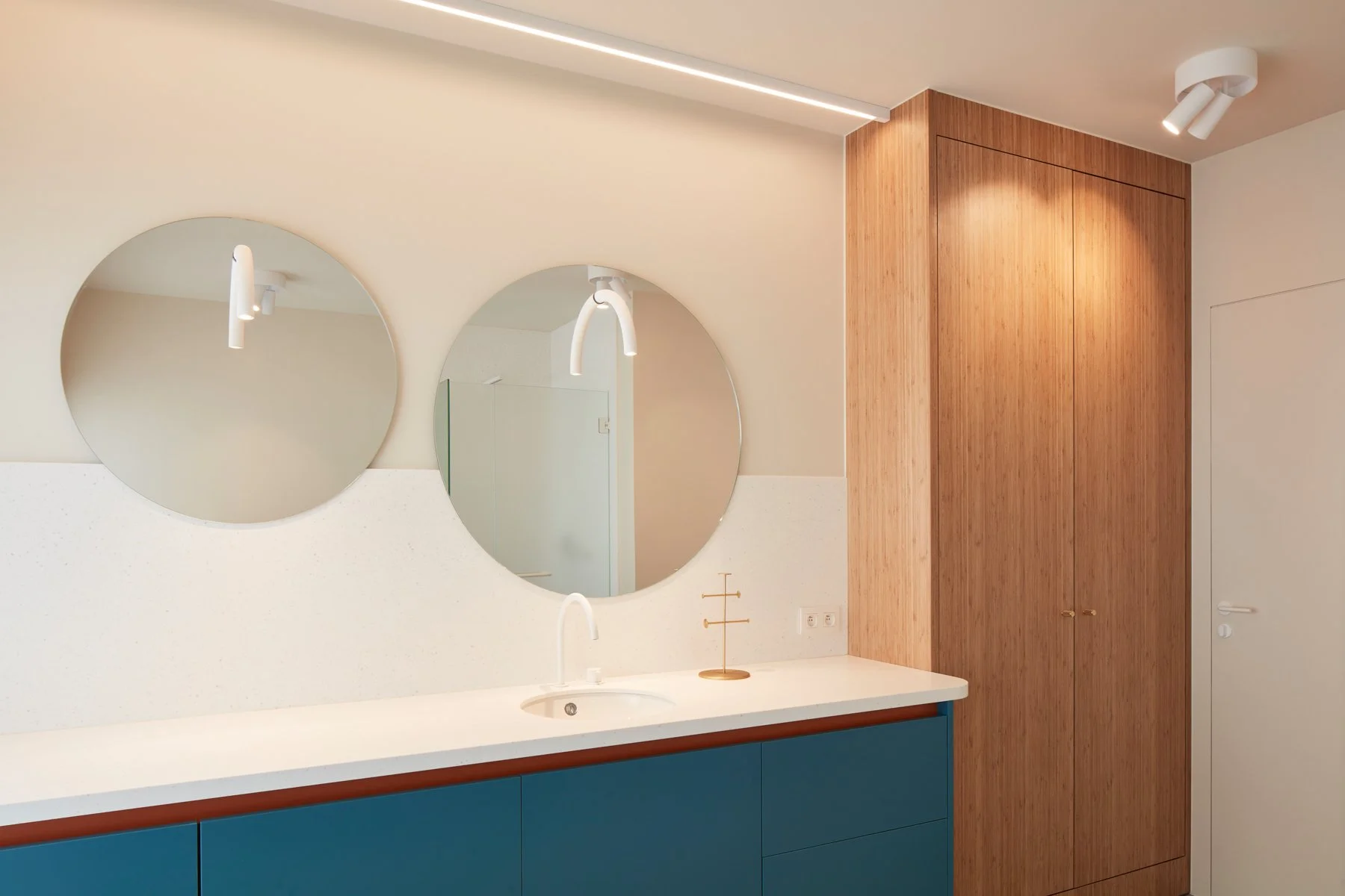 Het concept is gedurfd en geworteld in de geschiedenis van Brugge. We kozen voor duurzame, natuurlijke materialen zoals bamboe parket en fineer, gecombineerd met karaktervolle Ceppo di Gré vloeren.