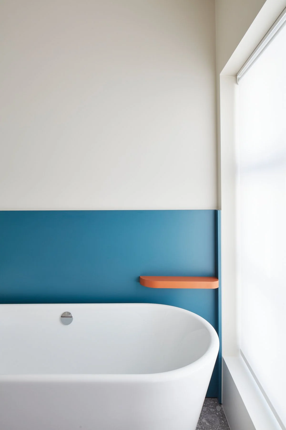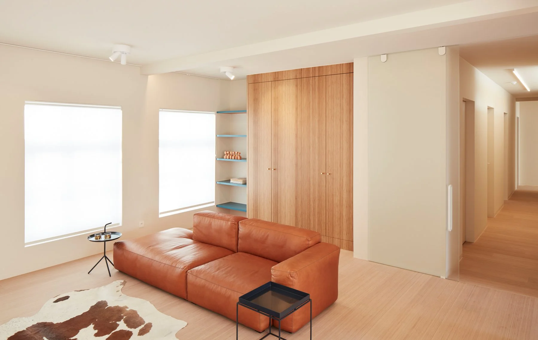Petroleumblauw vormt het hoofdaccent – een directe referentie aan de blauwe hemel die hier overal zichtbaar is – versterkt door complementaire details in cognac.