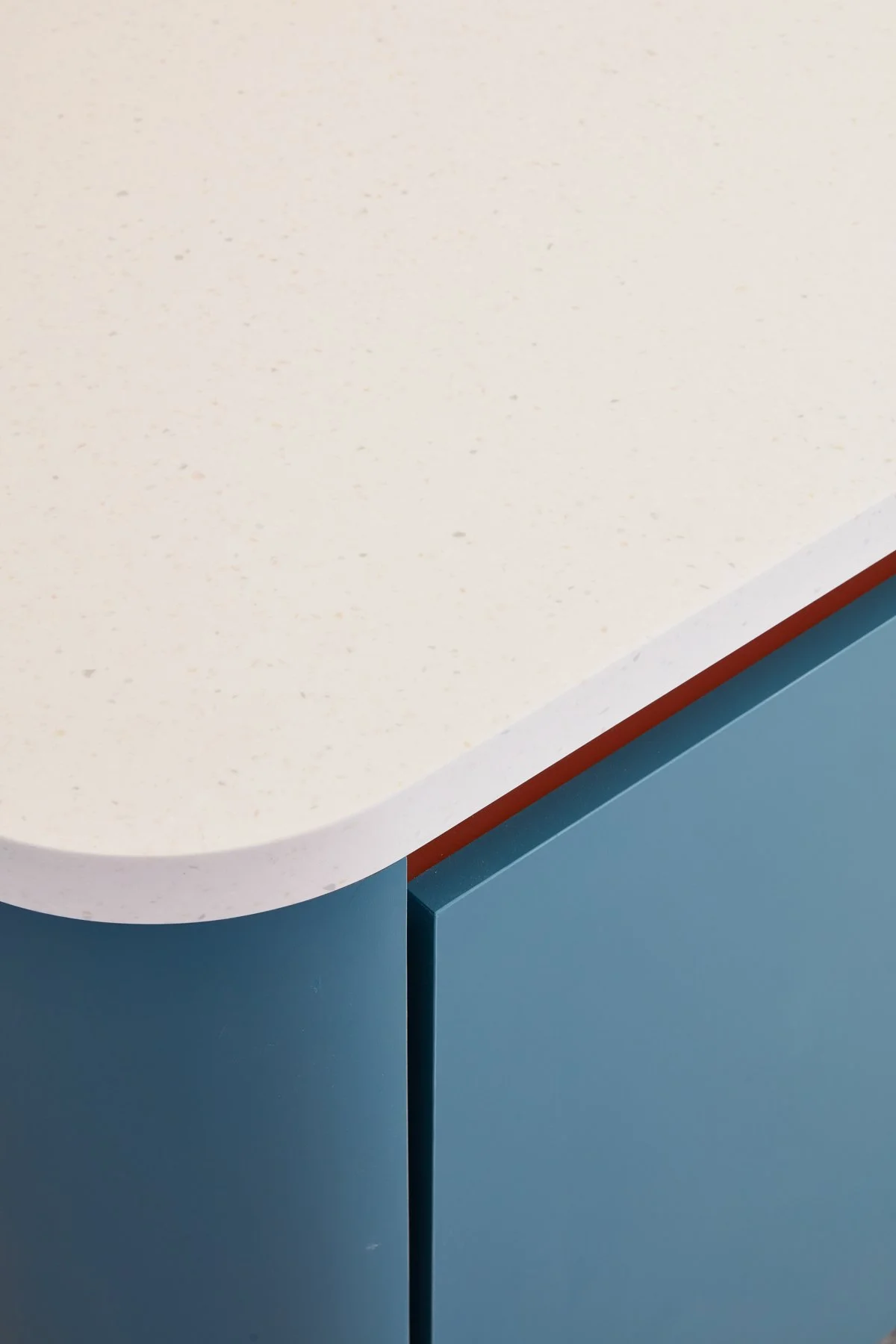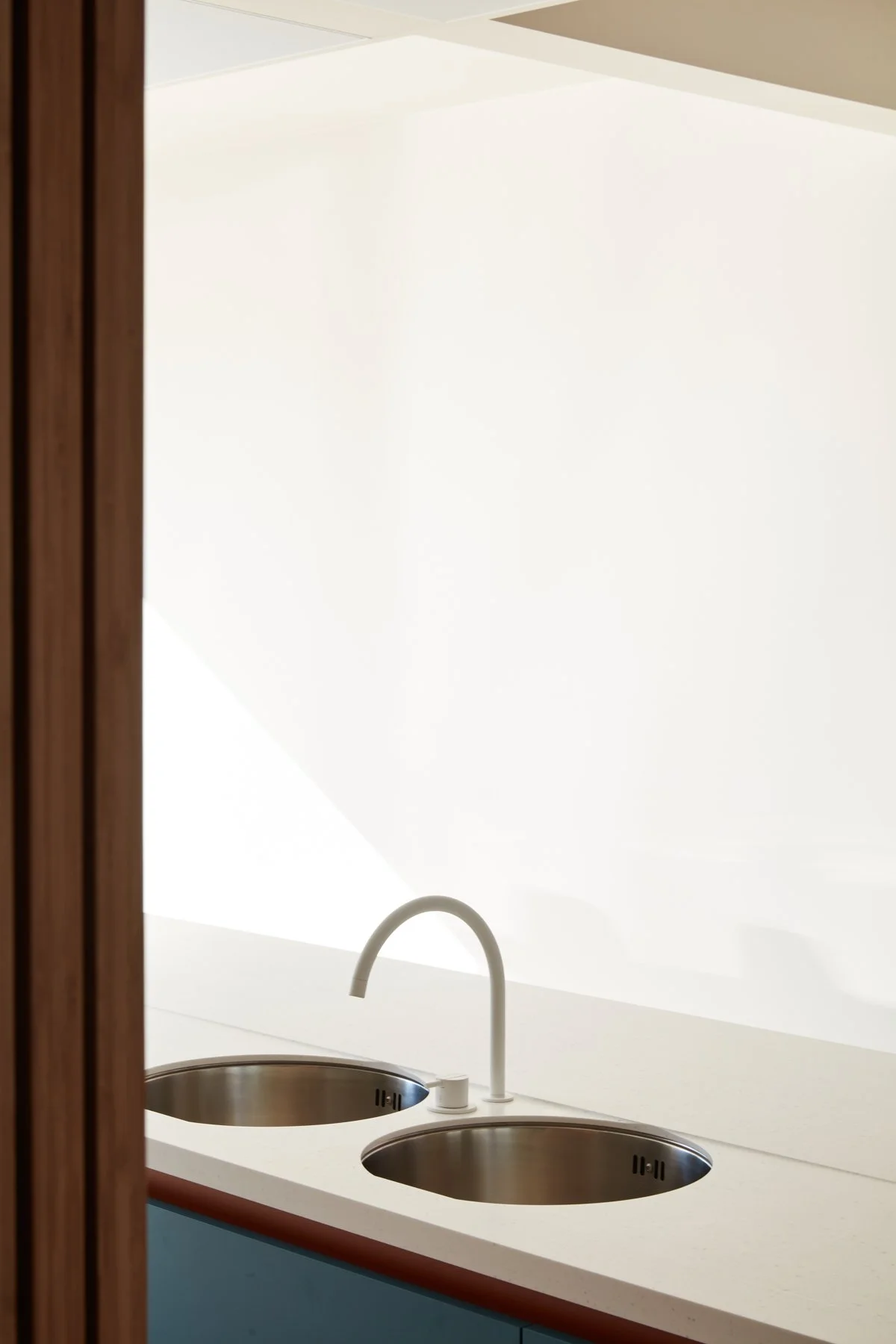 Corian werkbladen in 'whitecap' voegen kleurrijke nuances toe, terwijl helderwitte accenten in het kraanwerk en deurbeslag voor een frisse toets zorgen.