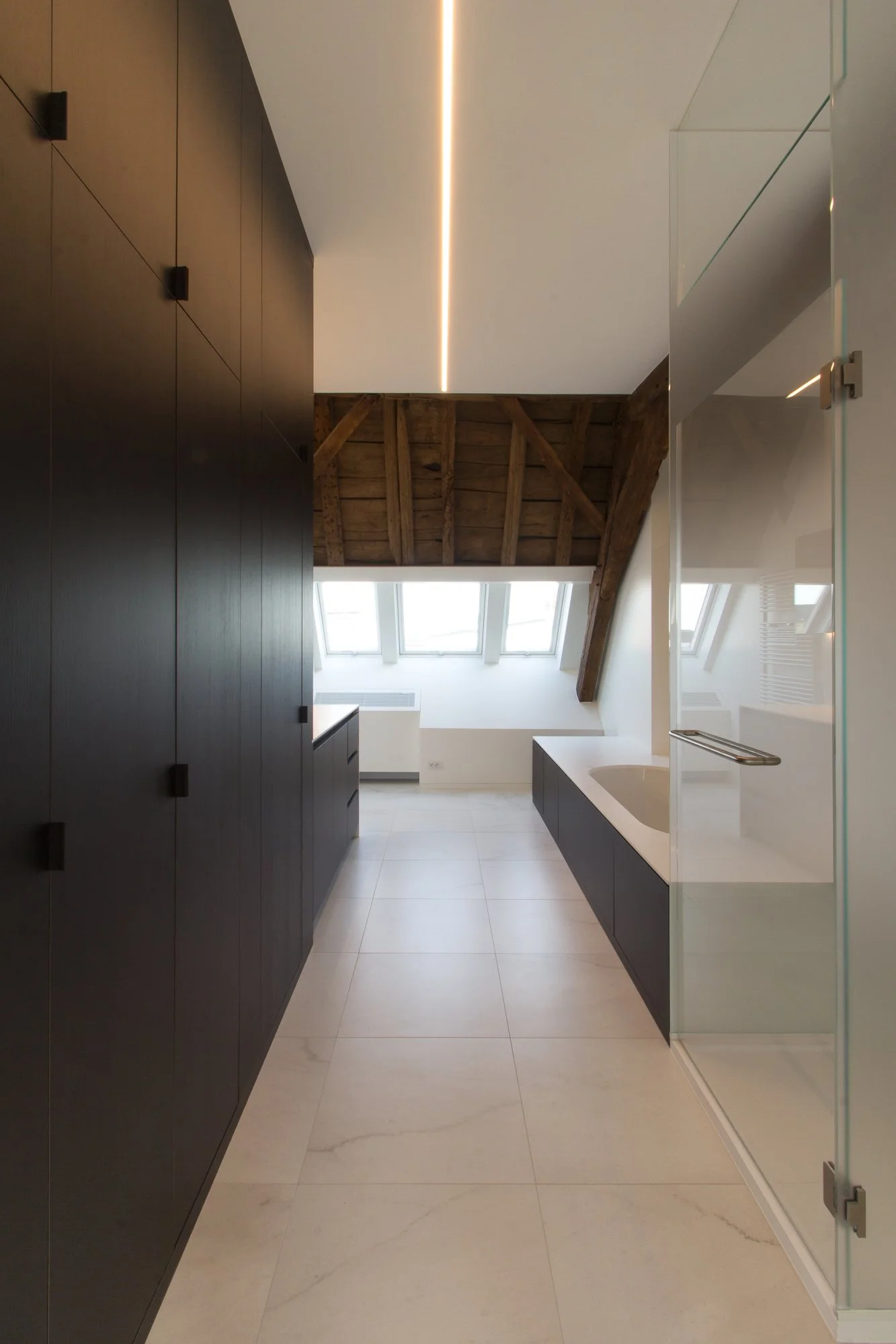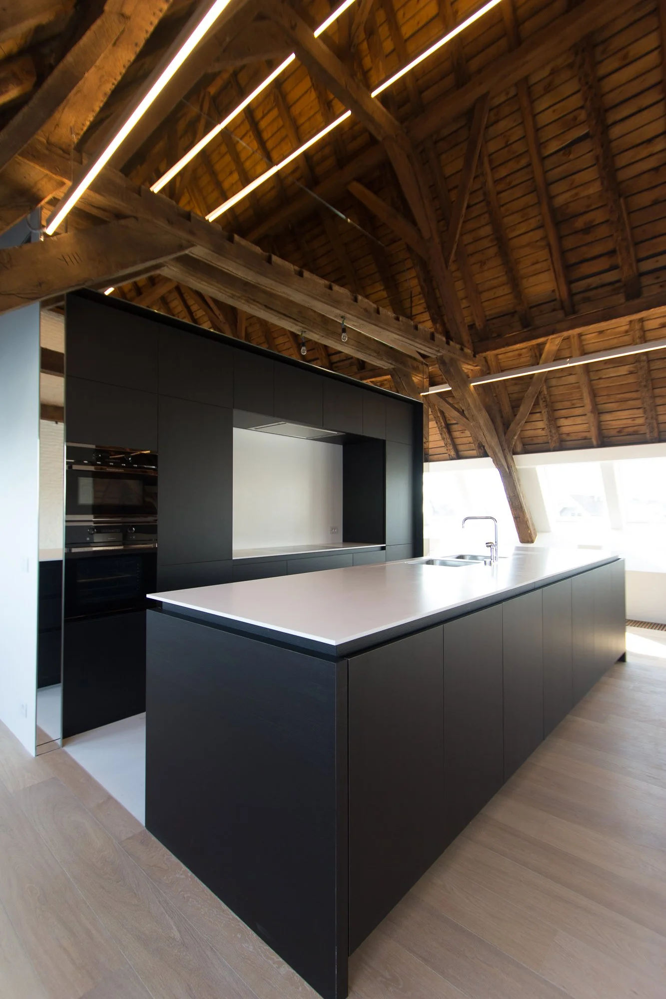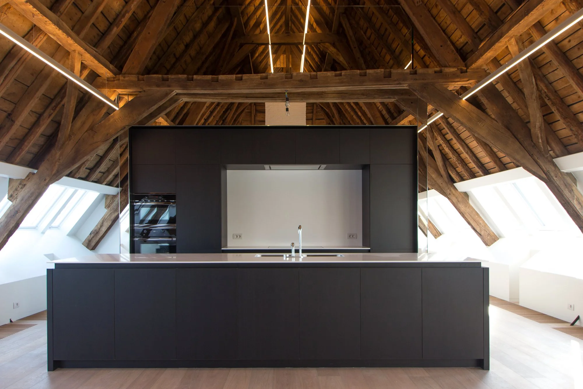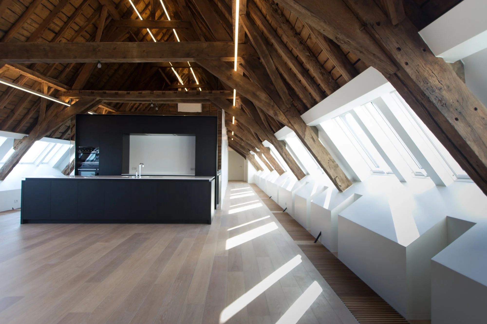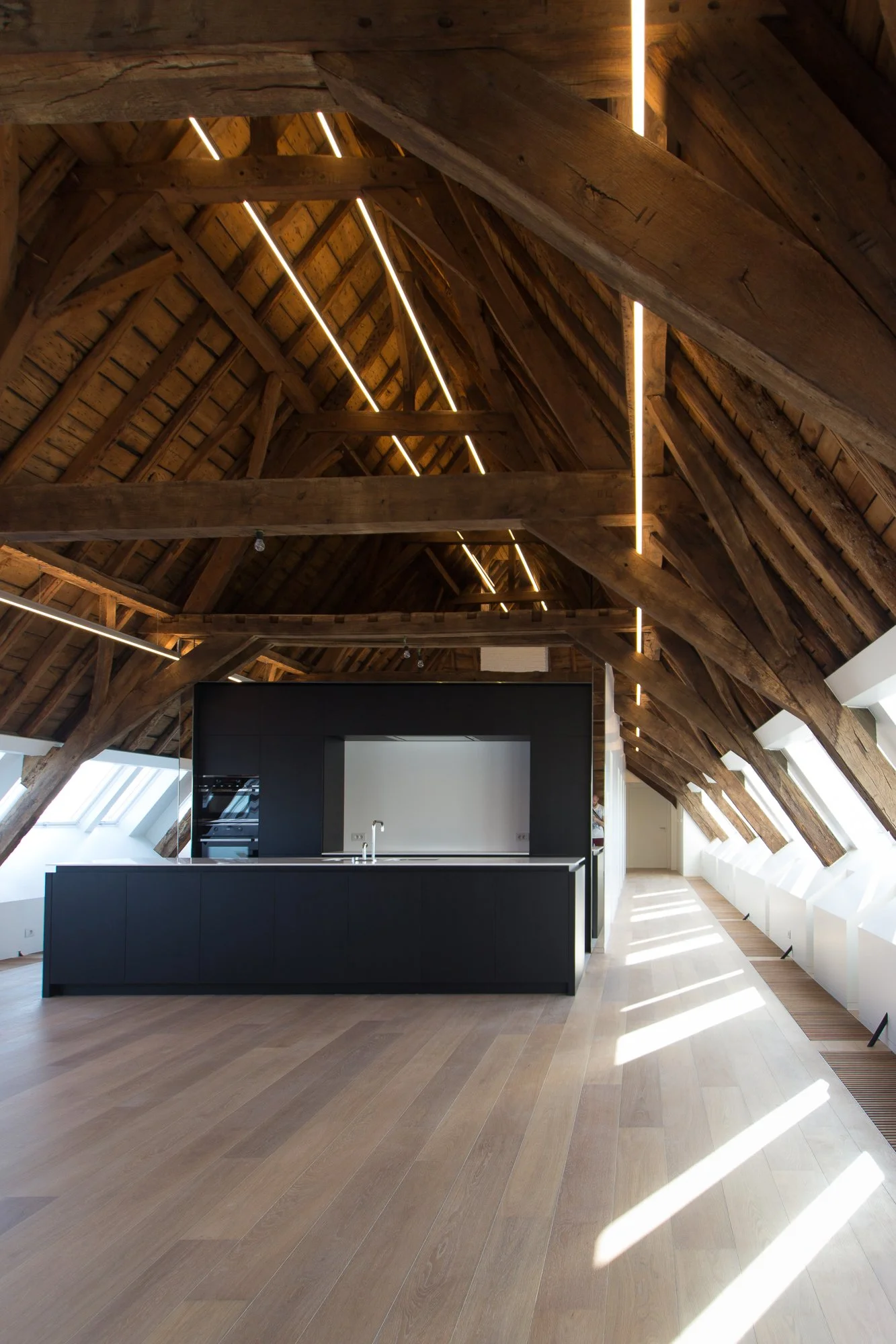 In deze unieke penthouse vormde de enorme lengte van de ruimte het vertrekpunt voor ons ontwerp. We kozen ervoor om dit horizontale karakter niet te breken, maar juist extreem te benadrukken. Verlichtingsarmaturen met een indrukwekkende lengte van 25 meter snijden als laserstralen door de ruimte. Ze creëren een krachtig lineair perspectief dat de historische houtstructuur uit de 18e eeuw op een dramatische en moderne manier accentueert.