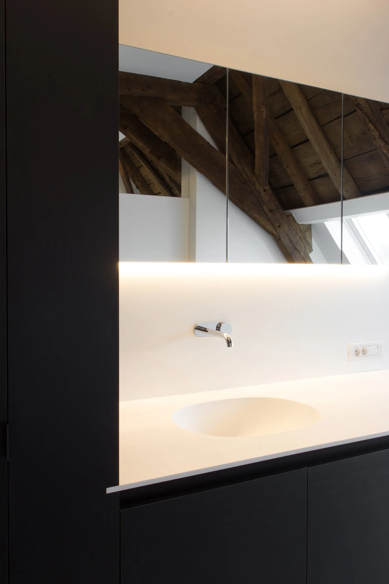 Om de integriteit van de monumentale spanten te bewaren, werden alle functionele ruimtes ondergebracht in één centraal volume. Door dit volume deels te bekleden met spiegels, lijkt het fysiek te verdwijnen in de omgeving. De historische structuur loopt visueel ononderbroken door, waardoor de bewoner leeft tussen de authentieke balken zonder dat de nieuwe ingrepen de overhand nemen.