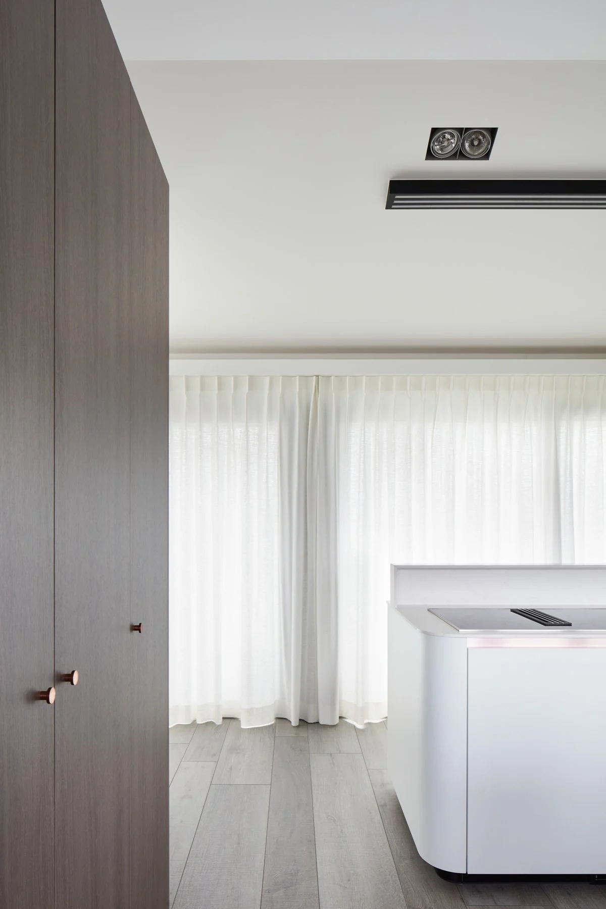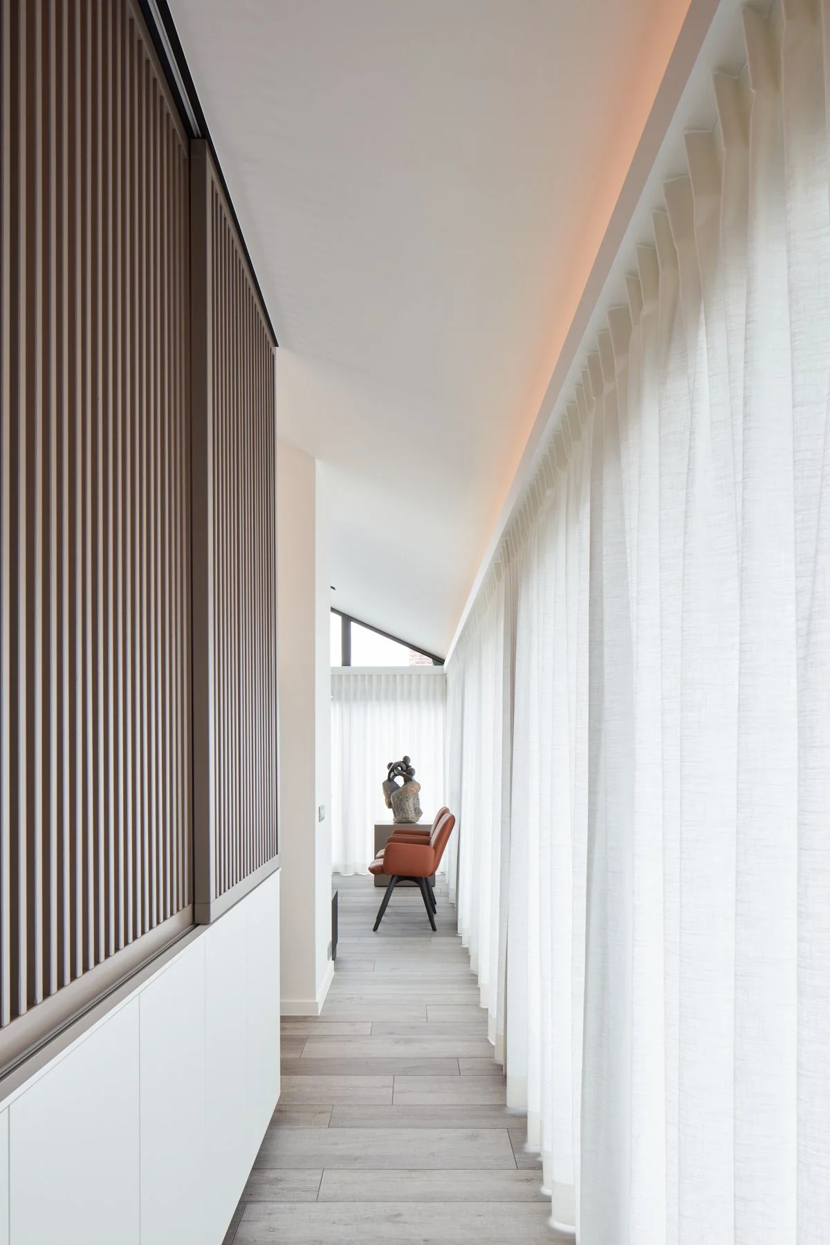 De kracht van de hoge ruimtes wordt versterkt door een strakke horizontale lijnvoering; het meubilair en de gordijnnissen houden consequent dezelfde hoogte aan. Voor de ramen kozen we een semi-transparante stof die overdag het harde licht verzacht en 's avonds transformeert tot een golvende, witte wand die de akoestiek optimaliseert.