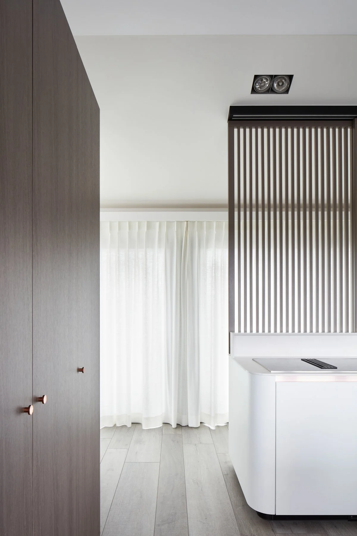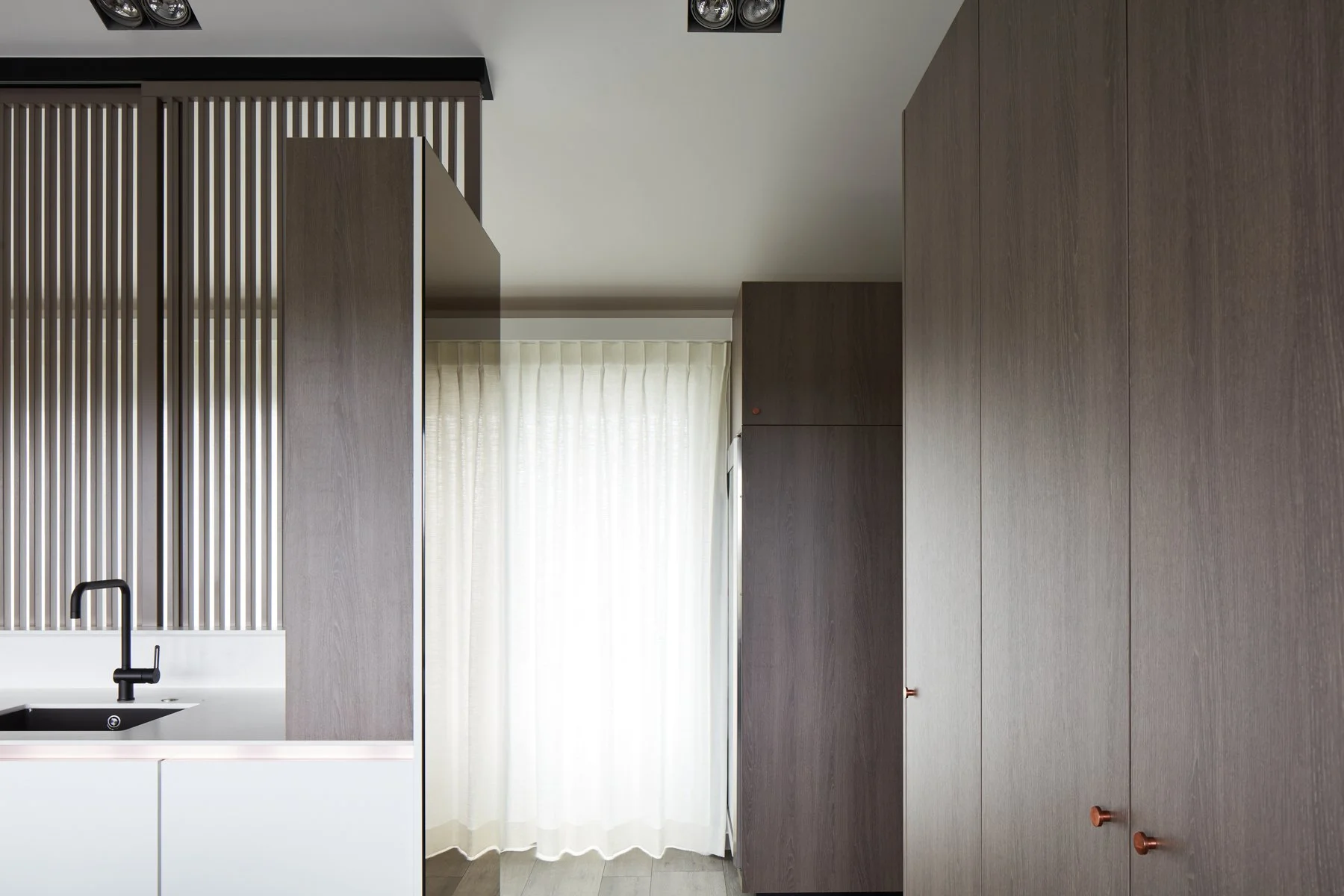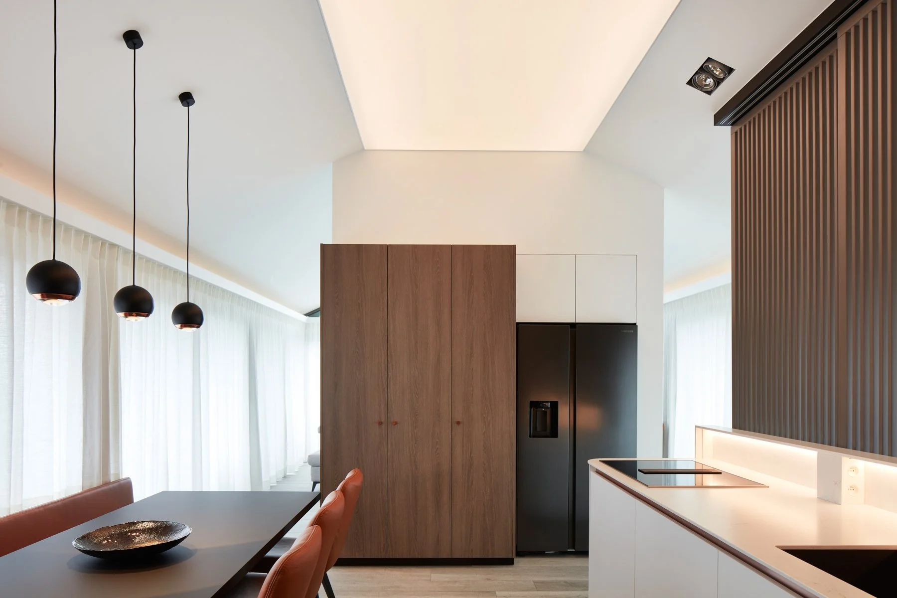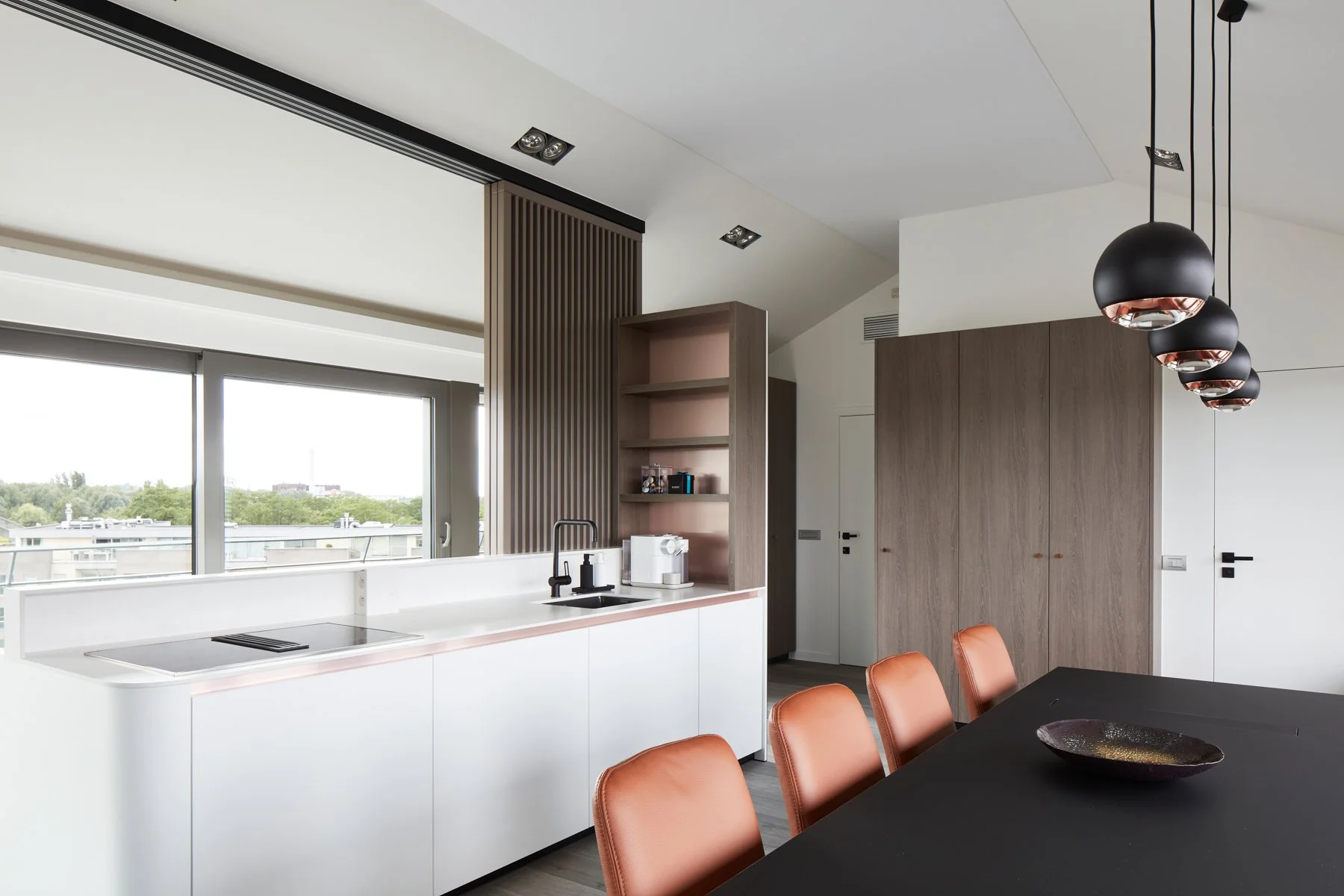 De keuken fungeert als het kloppend hart van de verdieping, maar biedt ook geborgenheid. Dankzij lamellen schuifwanden kan de keuken visueel worden afgeschermd van de publieke zone.