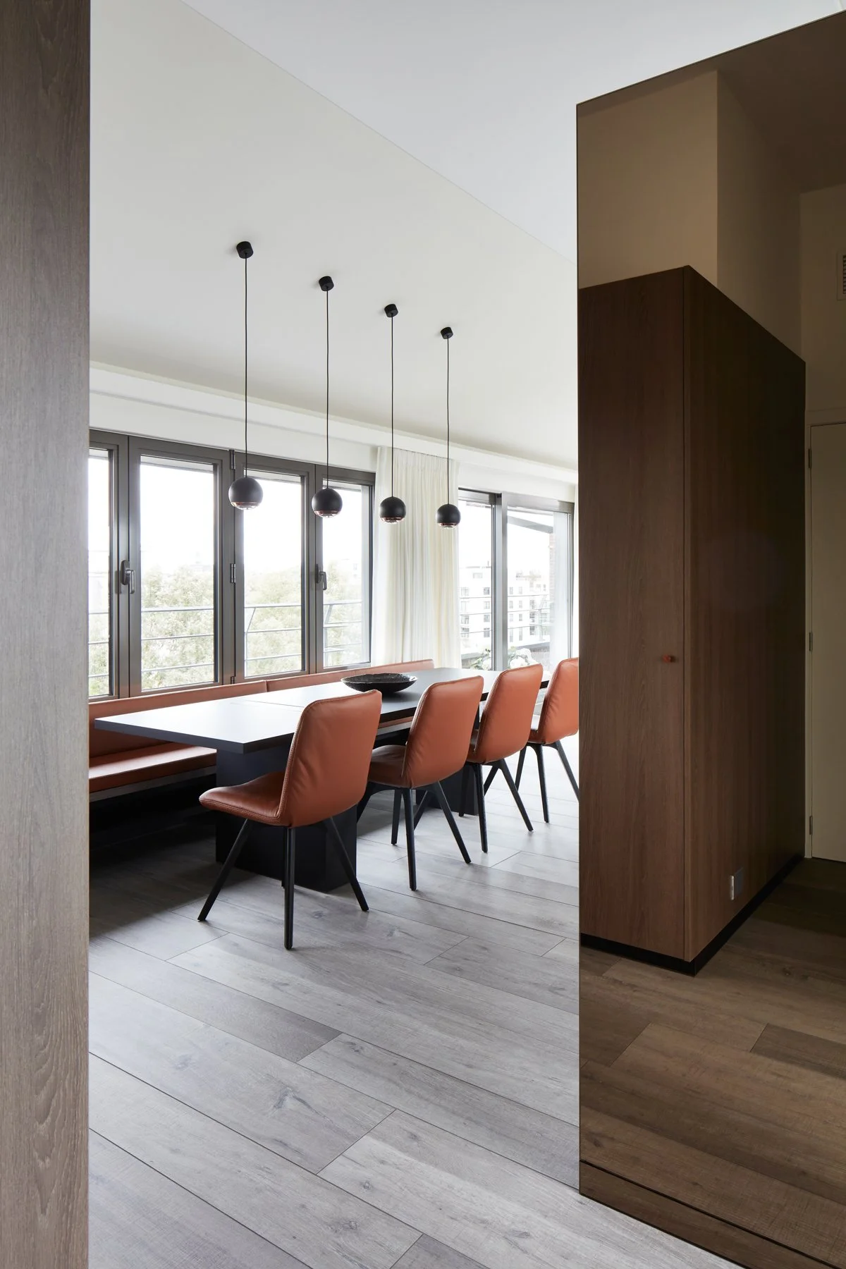Deze ingreep waarborgt de privacy, terwijl het gefilterde licht en de doorzichten behouden blijven. Door te werken met een geïntegreerde zitbank aan de eettafel, creëerden we extra ruimte voor een royale tafelsetting in een compacte ruimte.