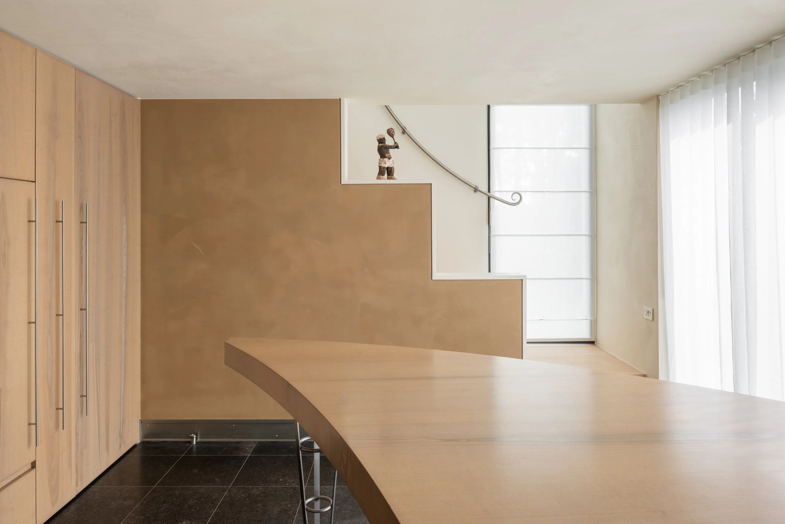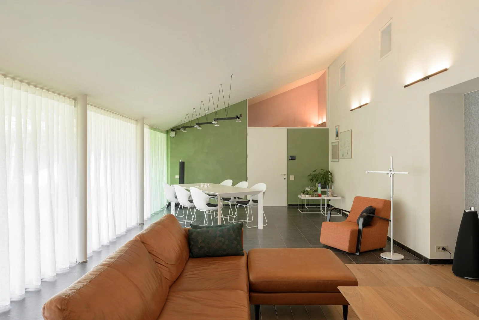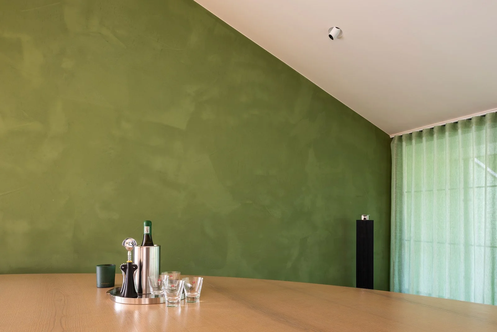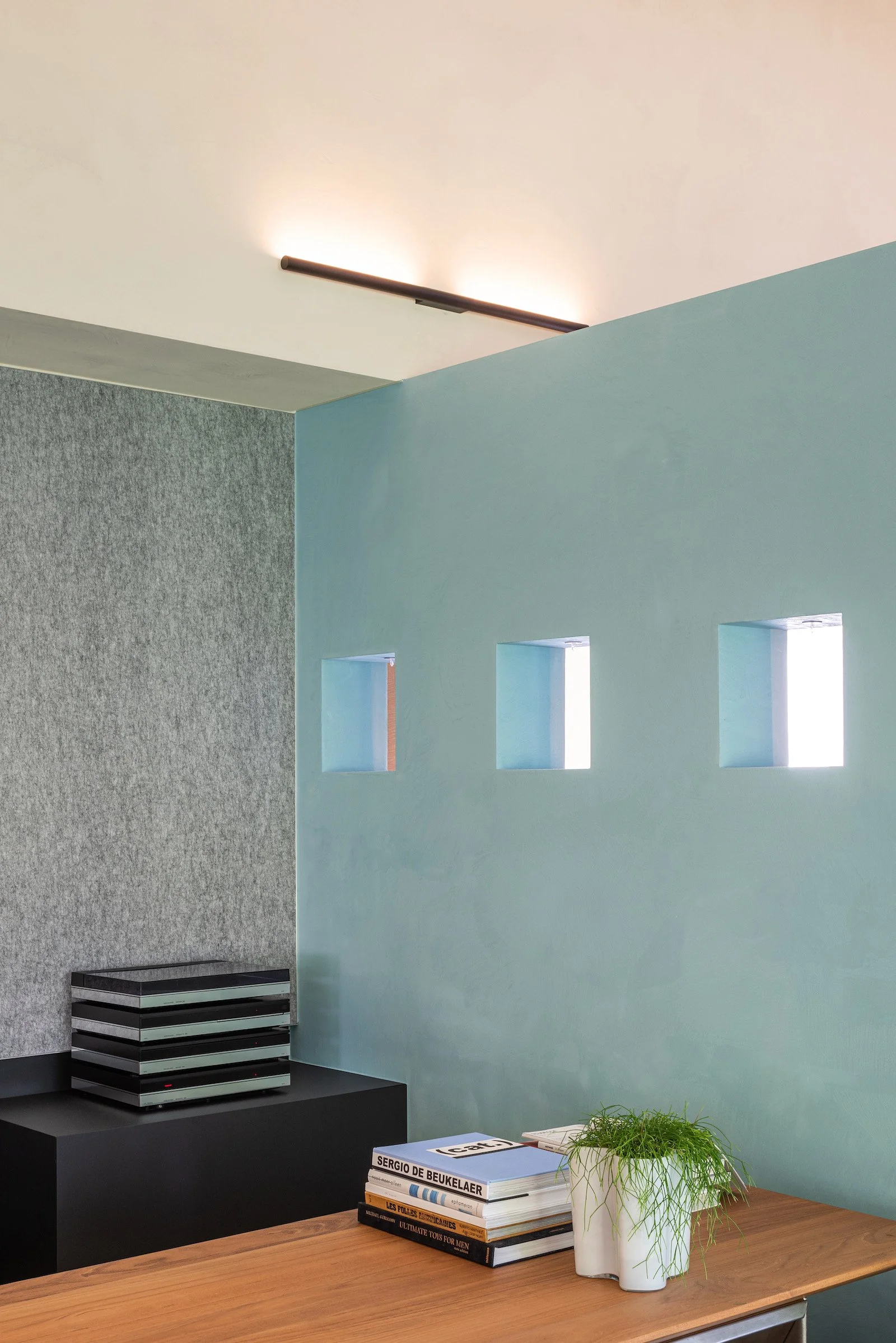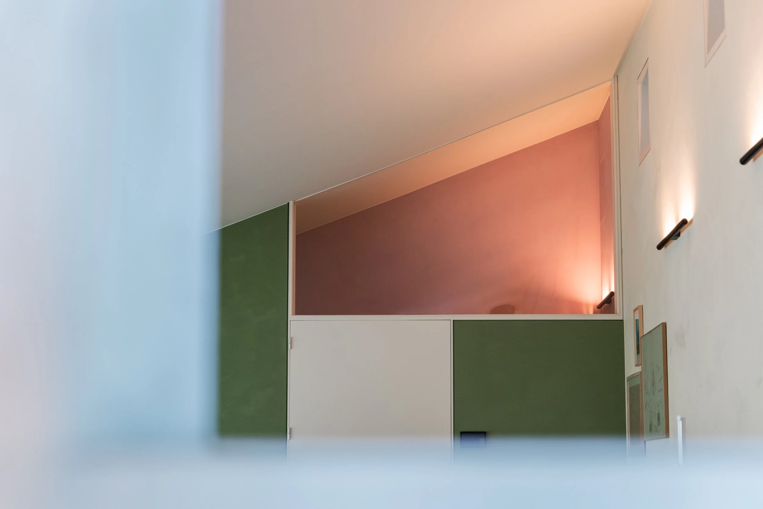 De intensiteit van mosgroen, luchtblauw, hemels roze en zachte kleitinten werd aangebracht met een warme kalkverftechniek. Deze afwerking geeft de muren een zachte, 'gewolkte' uitstraling die meebeweegt met het licht. Door te werken in strakke kleurvlakken accentueren we de typische geometrische vormen van de oorspronkelijke jaren 90 architectuur.
