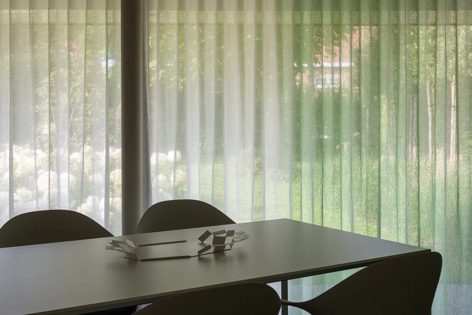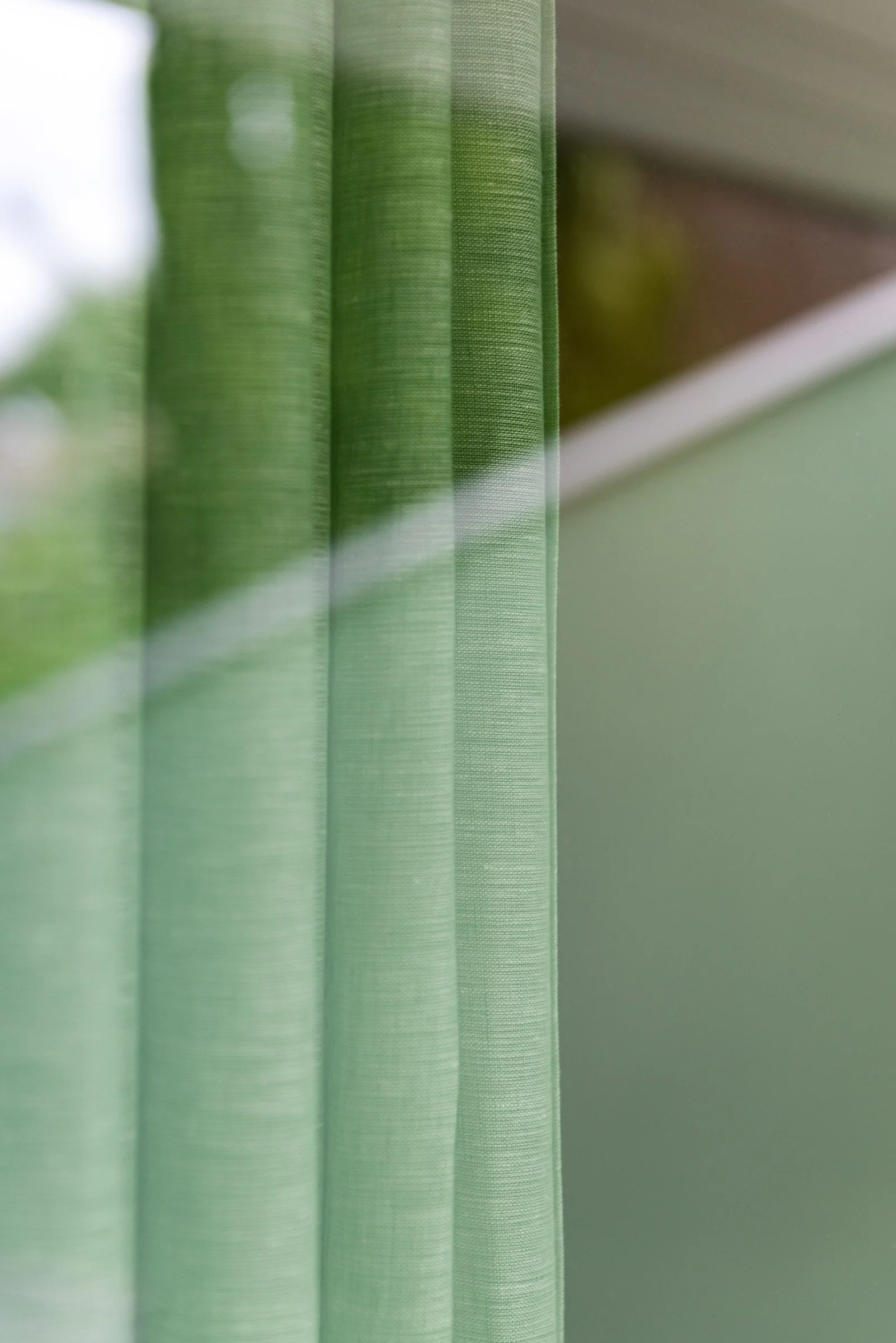 In een ruimtelijk, open interieur is akoestiek essentieel. We integreerden een multifunctionele akoestische wand die niet alleen rust brengt voor het gehoor, maar ook alle techniek voor audio, tv en airconditioning discreet uit het zicht onttrekt. De op maat gemaakte linnen gordijnen met een unieke gradiënt – van diep mosgroen naar zuiver wit – verzachten de overgang tussen de kleuren en de lichtinval.