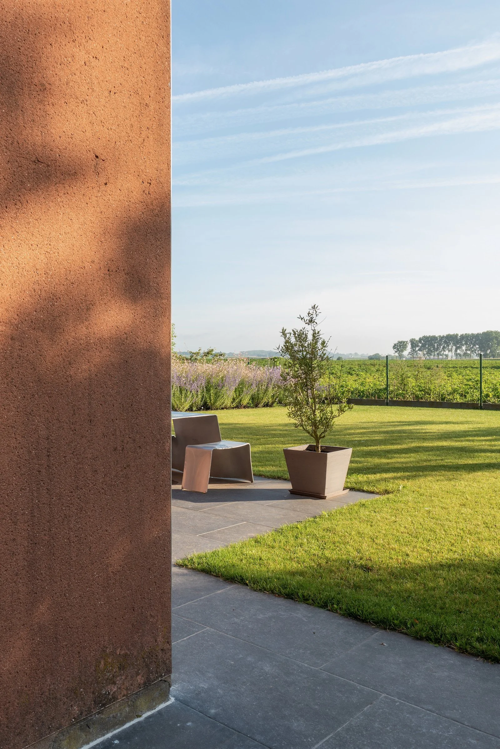 We besloten deze landschappelijke elementen niet alleen te observeren, maar ze letterlijk naar binnen te halen. Het resultaat is een interieur dat in nauwe dialoog staat met de wereld buiten de muren.