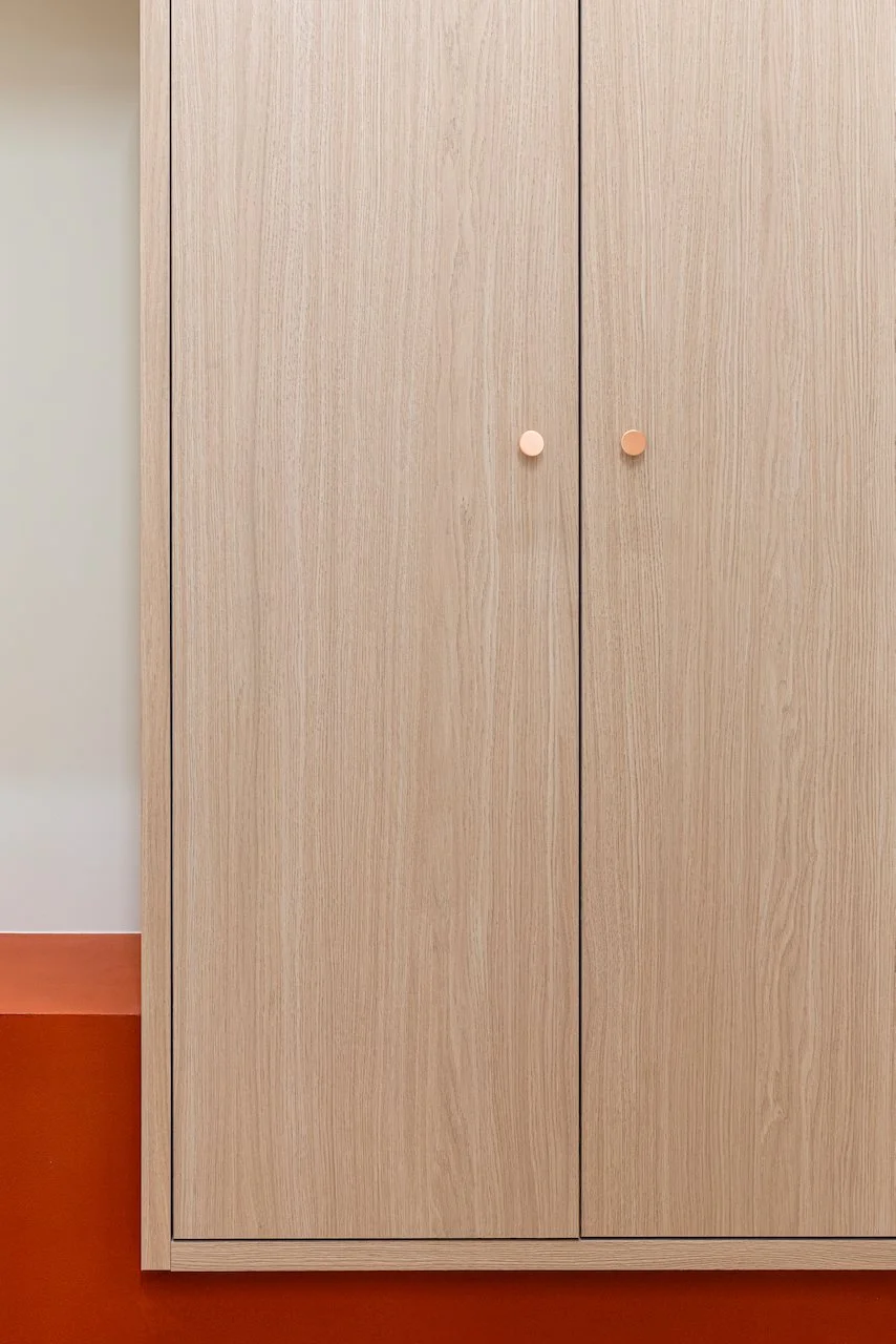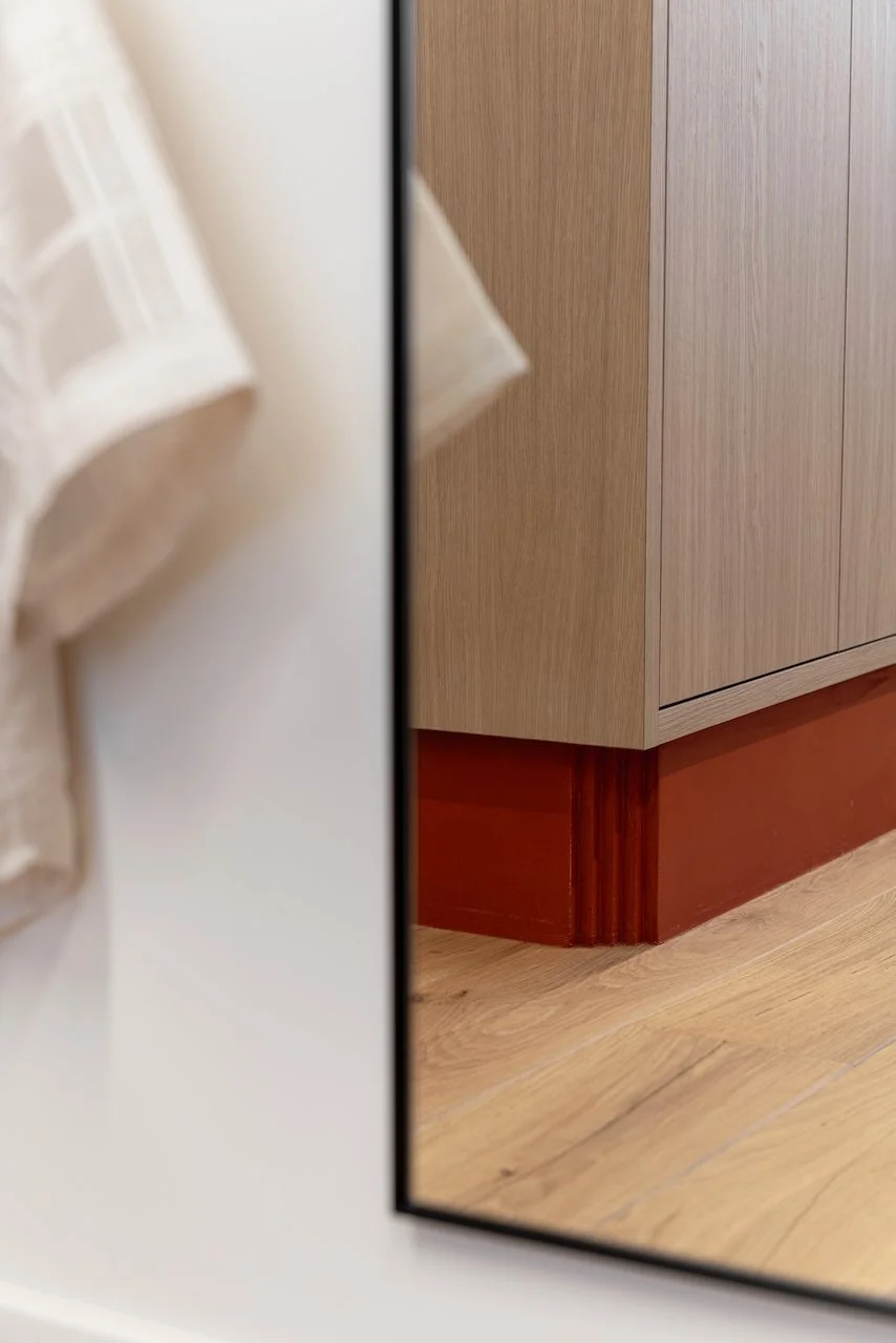 Samenhang ontstaat daar waar oog is voor historie. In de originele binnendeuren en de gevel ontdekten we een subtiel trapmotief. Dit architecturale detail hebben we consequent doorgetrokken in de afwerking van het maatwerkmeubilair.