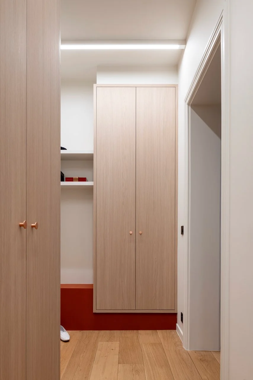 Onze opdracht? De badkamer, dressing en slaapkamer transformeren tot een samenhangend geheel dat rust uitstraalt zonder aan persoonlijkheid in te boeten. De bewoners zochten een efficiënte indeling met maximale bergruimte en een verrassend, gewaagd kleurgebruik.