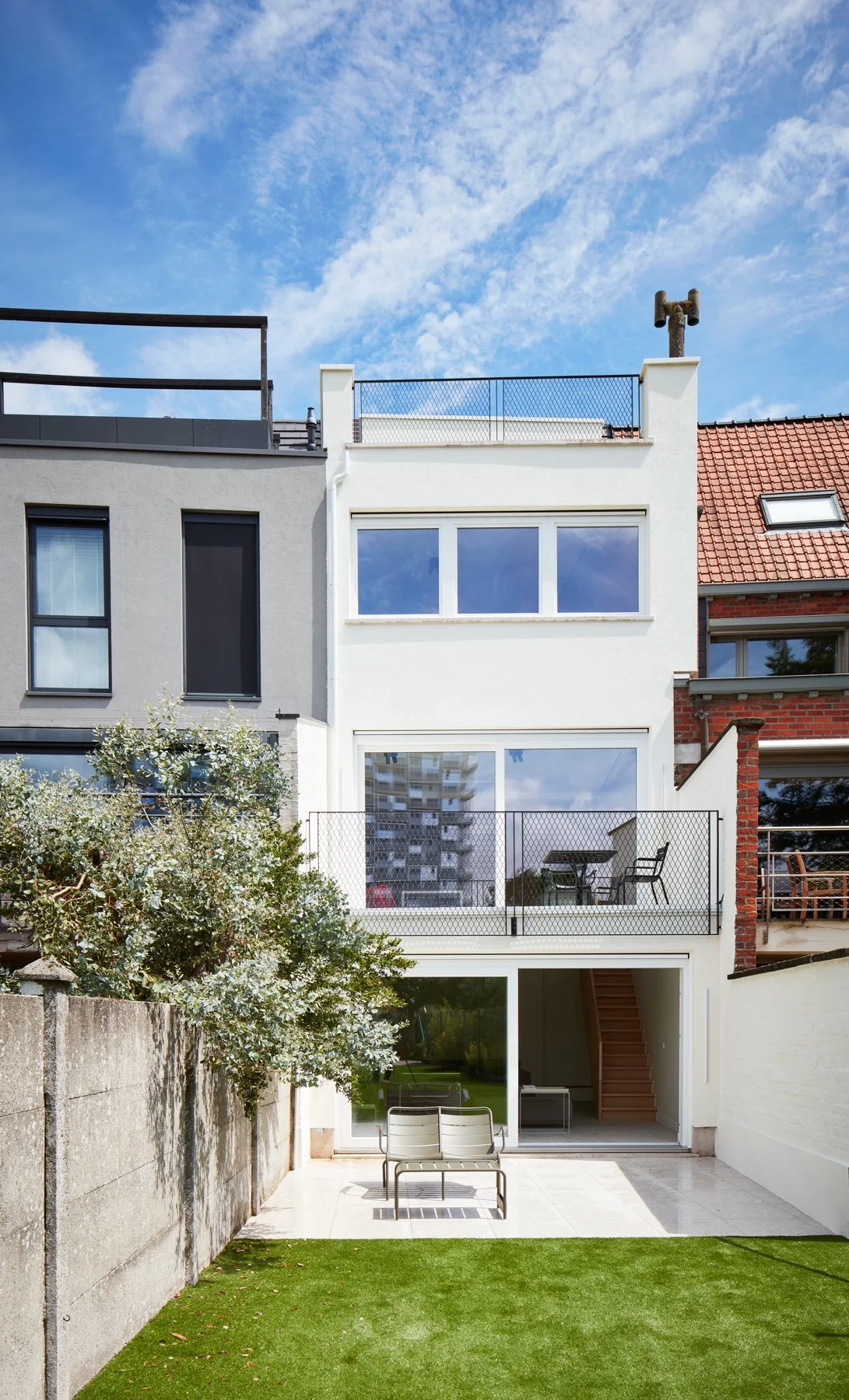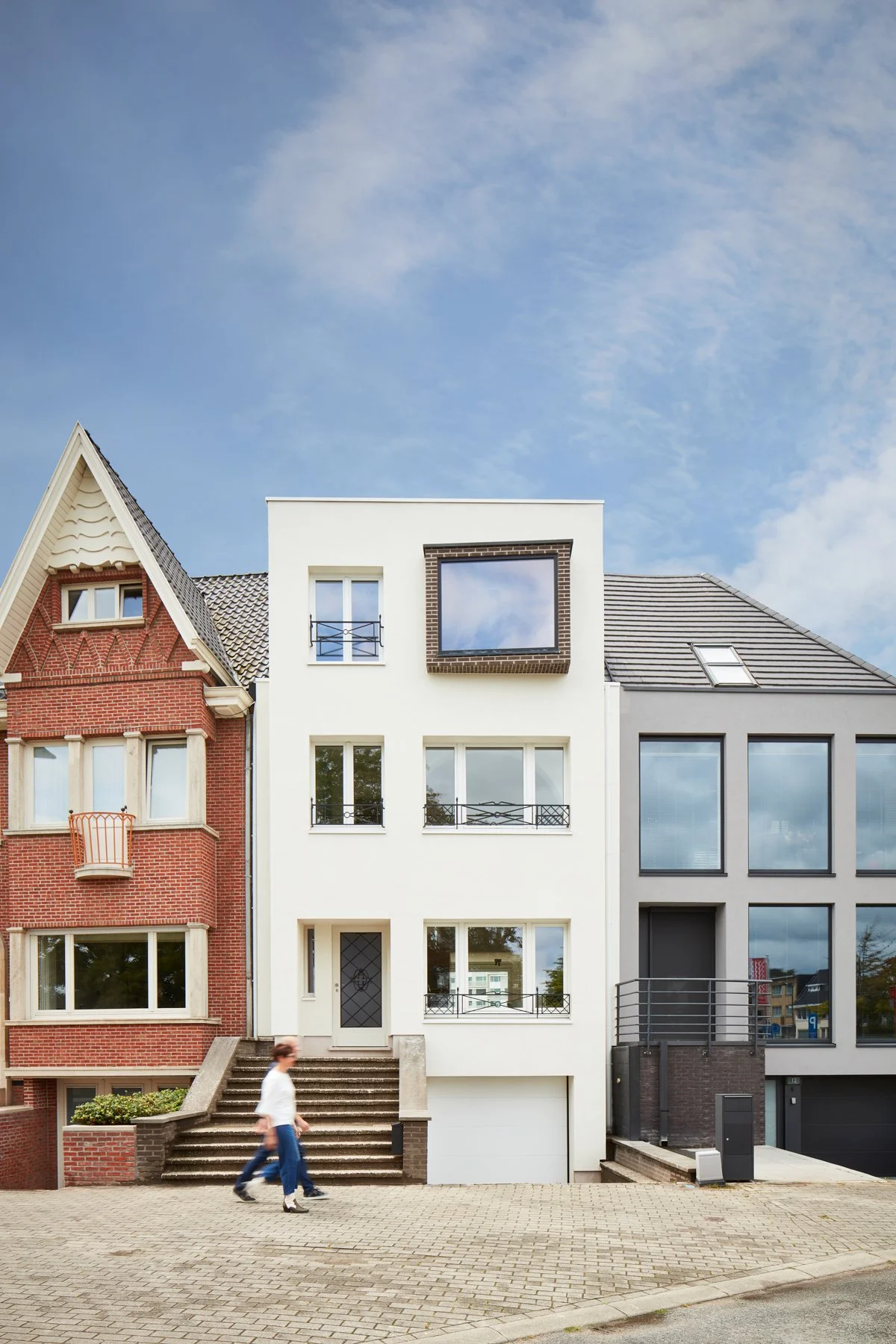 De grootste transformatie vond plaats in de hoogte: het bestaande dak maakte plaats voor een volwaardige extra verdieping die naadloos aansluit op de historische gevelopbouw. Dit biedt de bewoners een enorme flexibiliteit; leefruimtes verspreid over twee verdiepingen die meegroeien met de wisselende noden van een gezin.