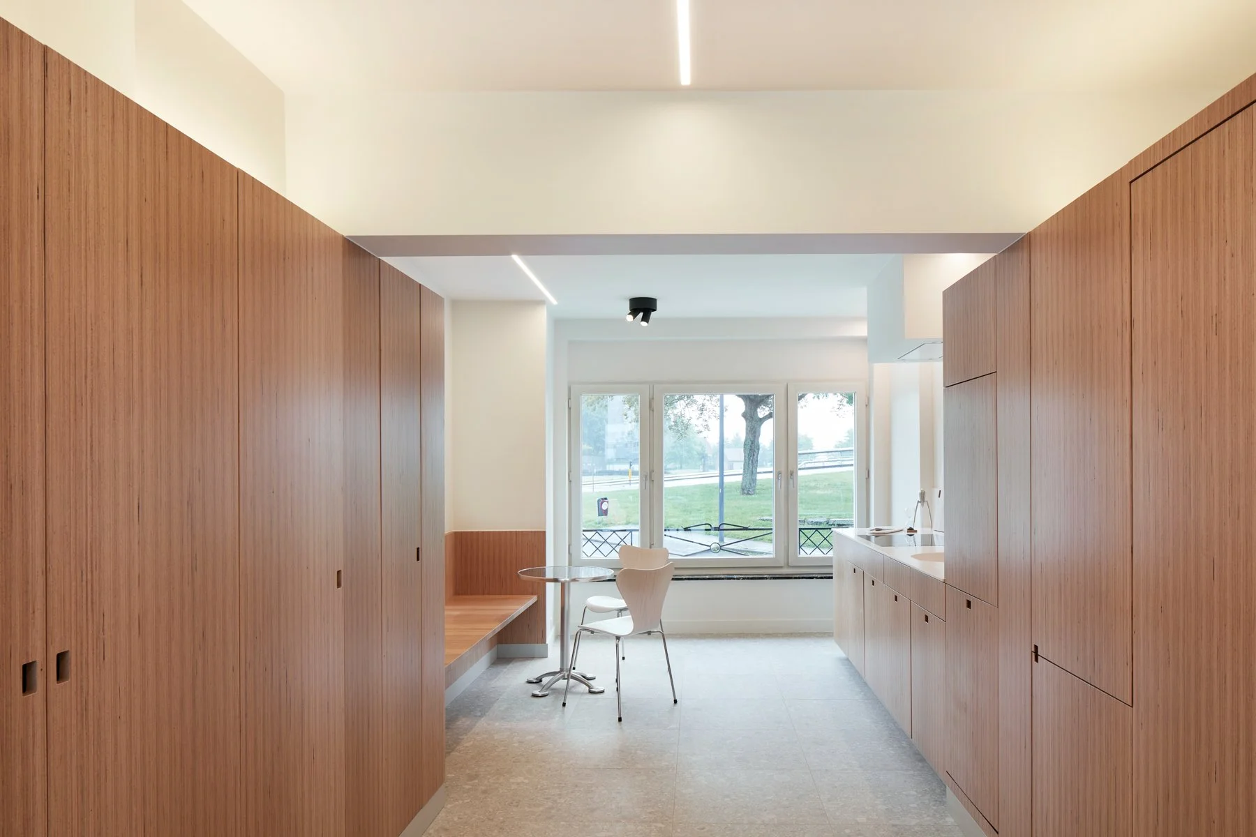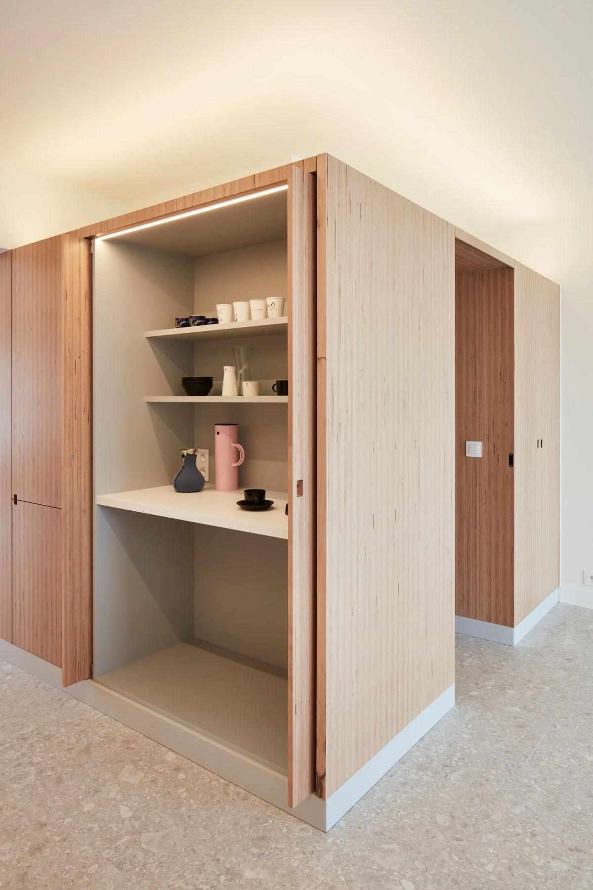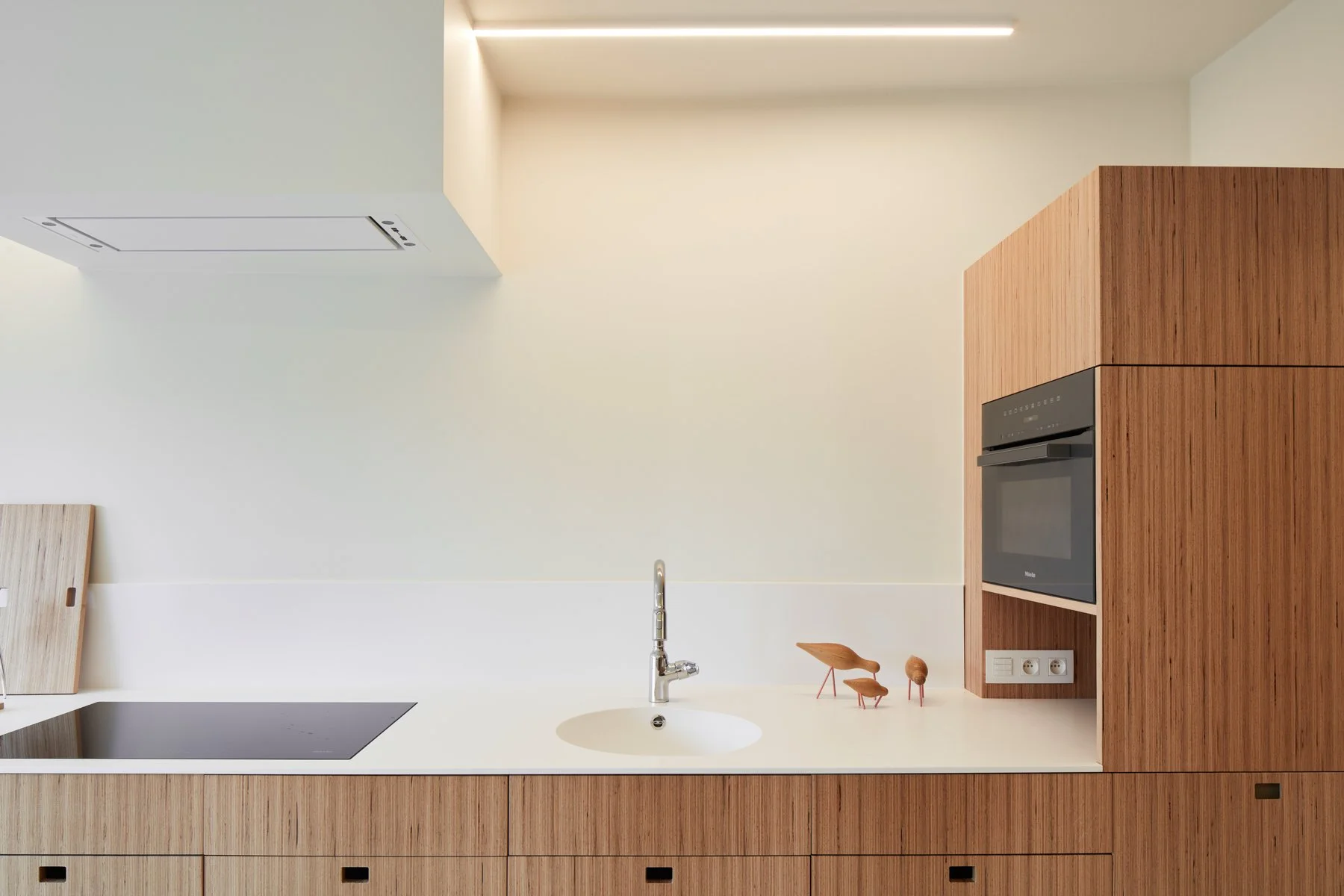 De keuken is ontworpen als een sculpturaal object. Door alle toestellen volledig weg te werken, behoudt de ruimte haar rustige woonkarakter.