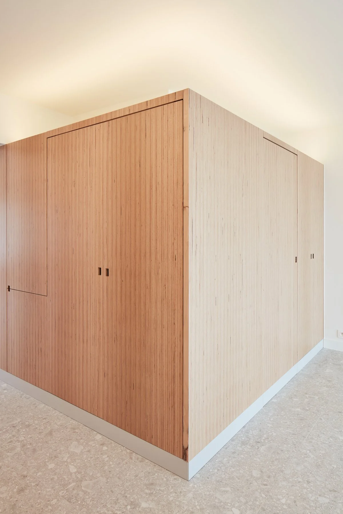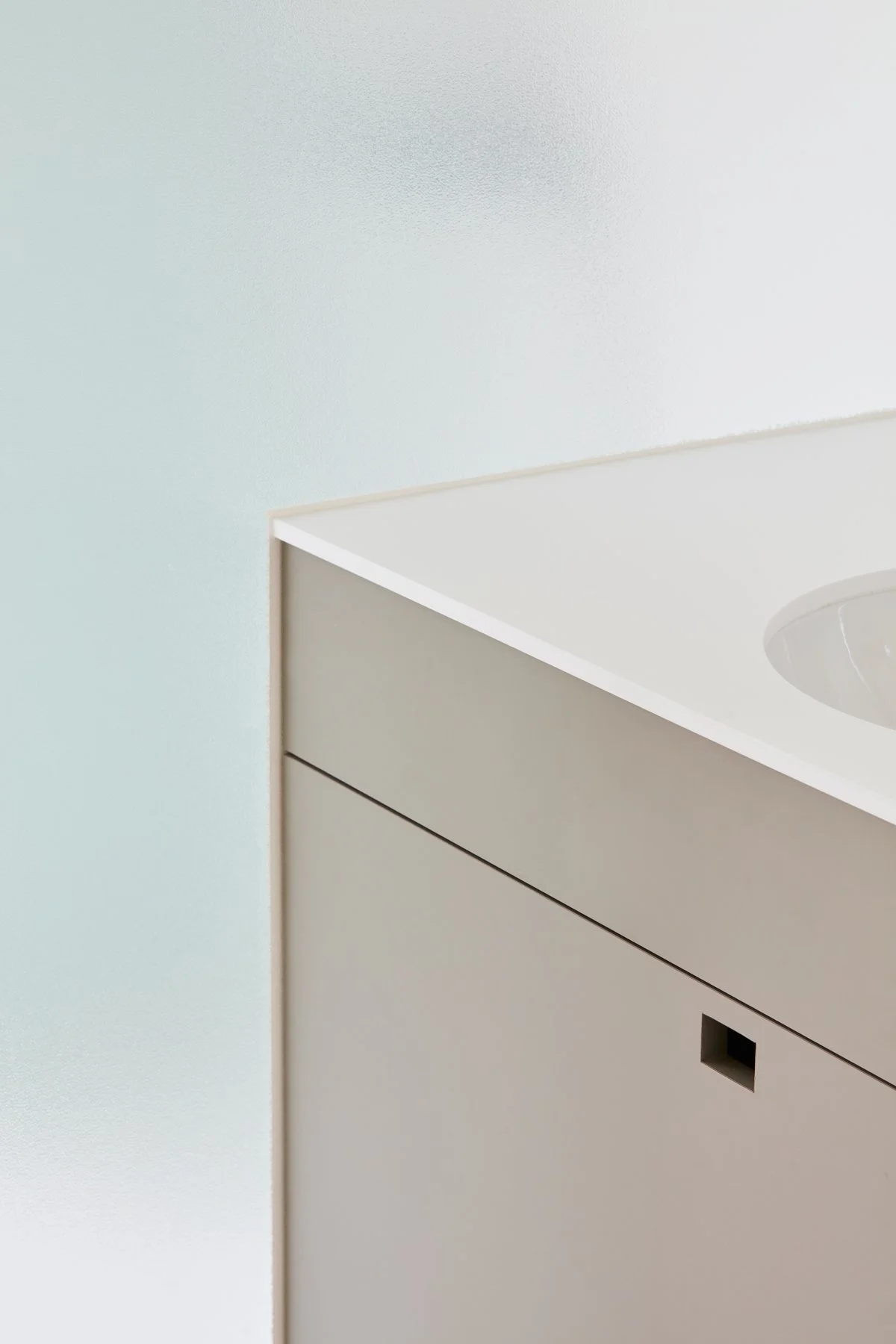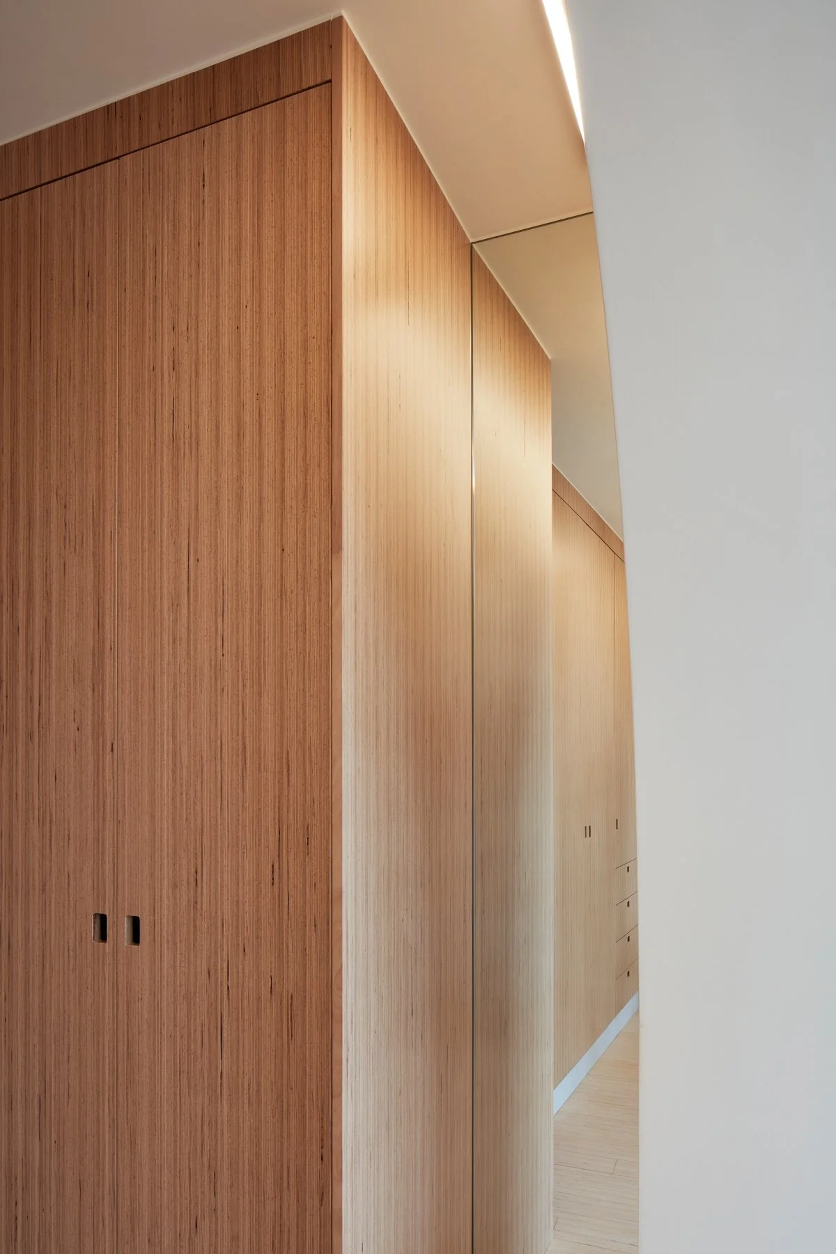 De keuken is ontworpen als een sculpturaal object. Door alle toestellen volledig weg te werken, behoudt de ruimte haar rustige woonkarakter.