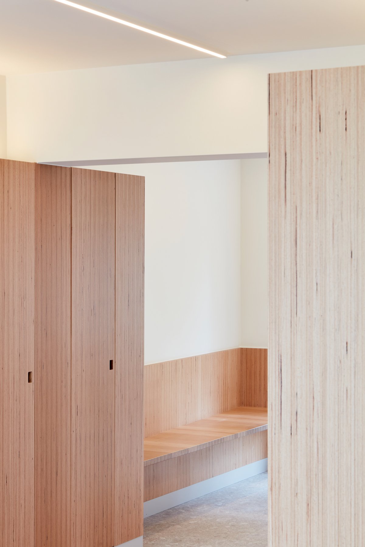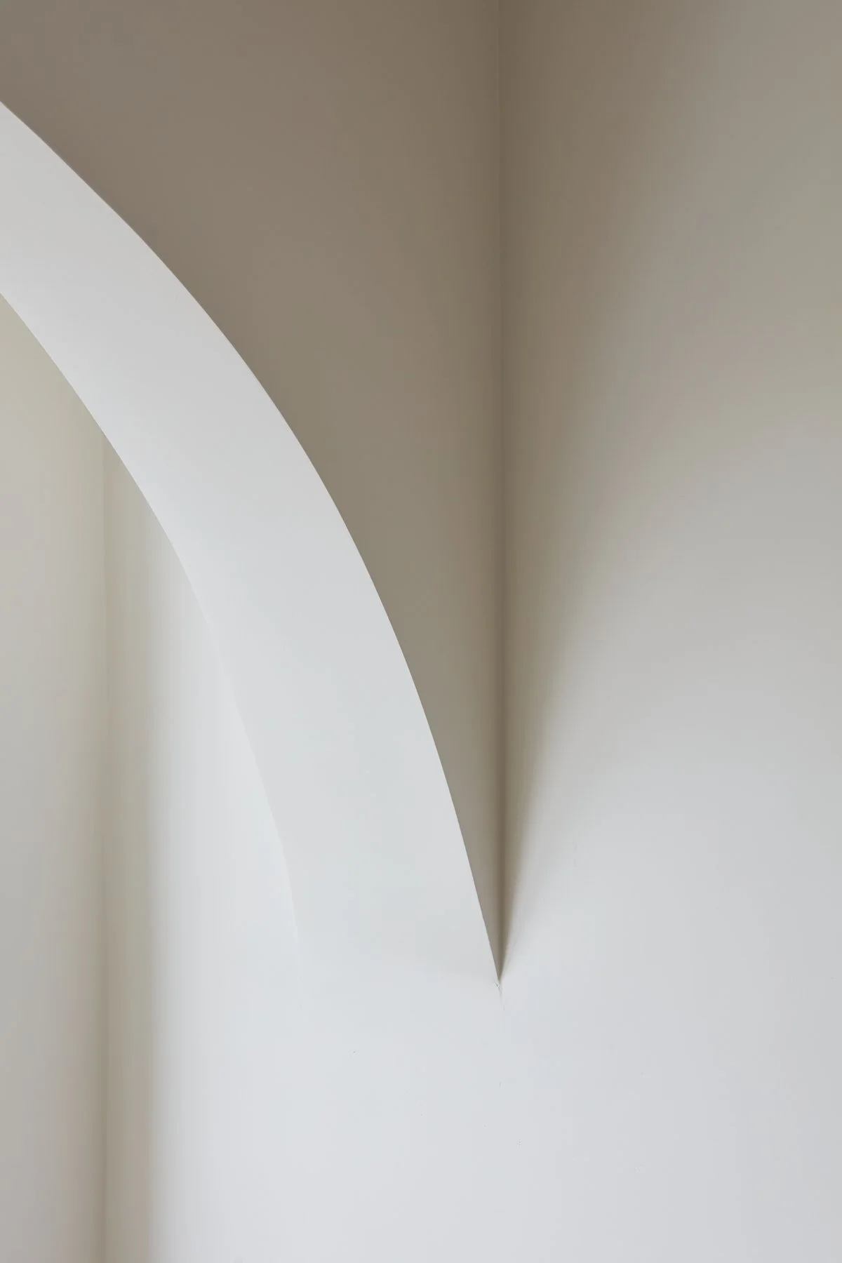 Alle wanden met een knik kregen een gebogen afwerking, waardoor de ruimtes in elkaar lijken over te vloeien. Zelfs in de tuin zet het golvende kunstgras dit thema door.