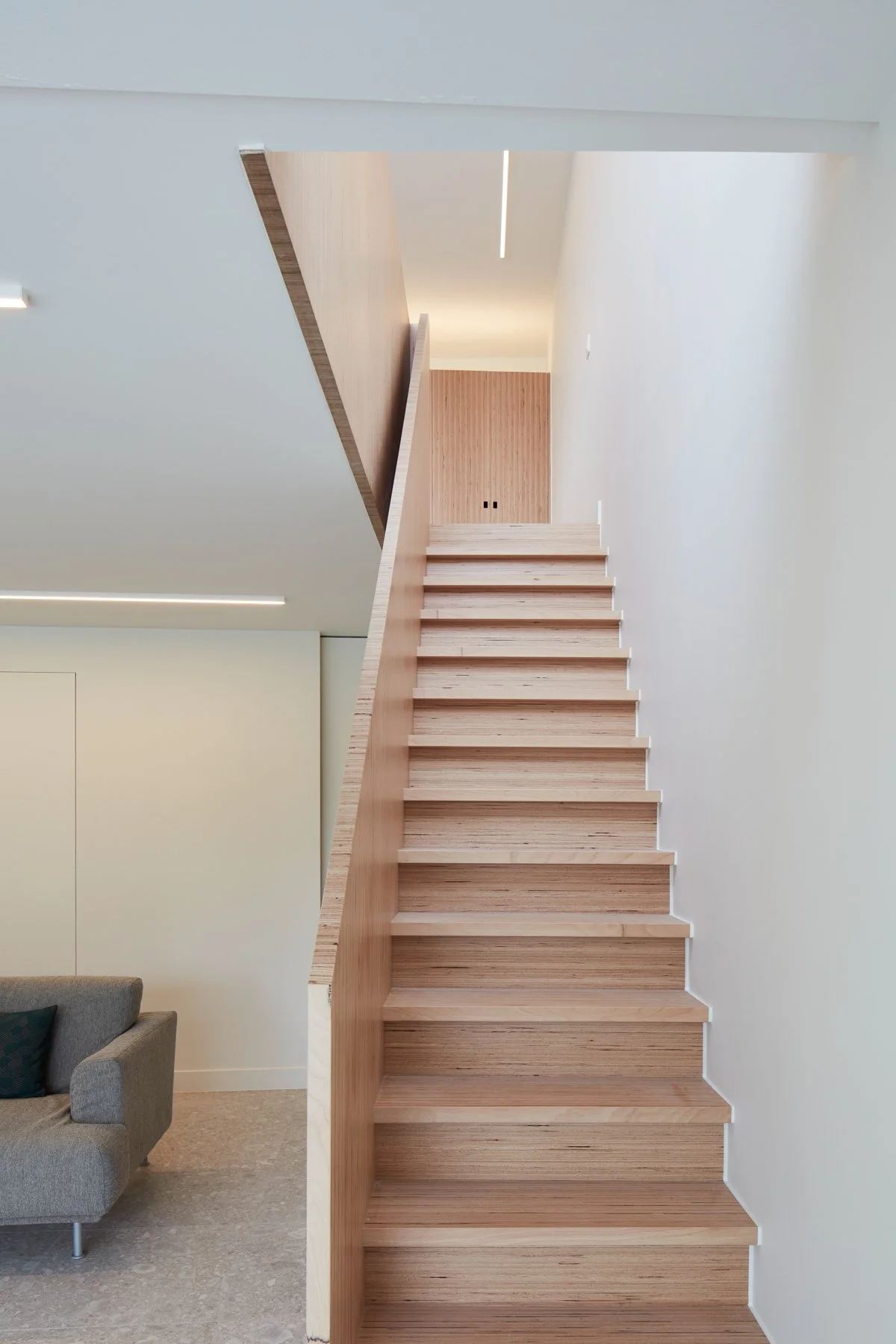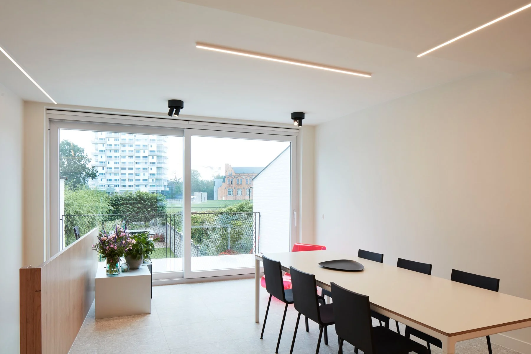 De unieke ligging aan de Leieboorden in Kortrijk vormde het fundament voor deze totaalverbouwing. Parallel aan de stroom van de rivier creëerden we in de woning een 'stroom van licht'. Waar de oorspronkelijke woning uit 1946 bestond uit een aaneenschakeling van kleine, donkere kamers, baadt het nieuwe ontwerp nu van de ochtend- tot de avondzon in natuurlijk licht. Door de achtergevel dieper te leggen en de ruimtes over de volledige breedte te spreiden, verdween het beklemmende gevoel van het smalle perceel en ontstond er een ongekende ruimtelijkheid.
