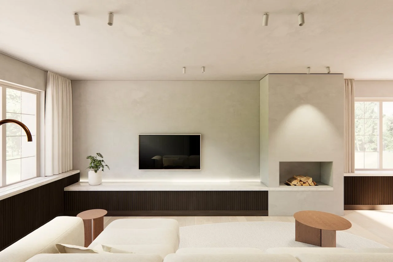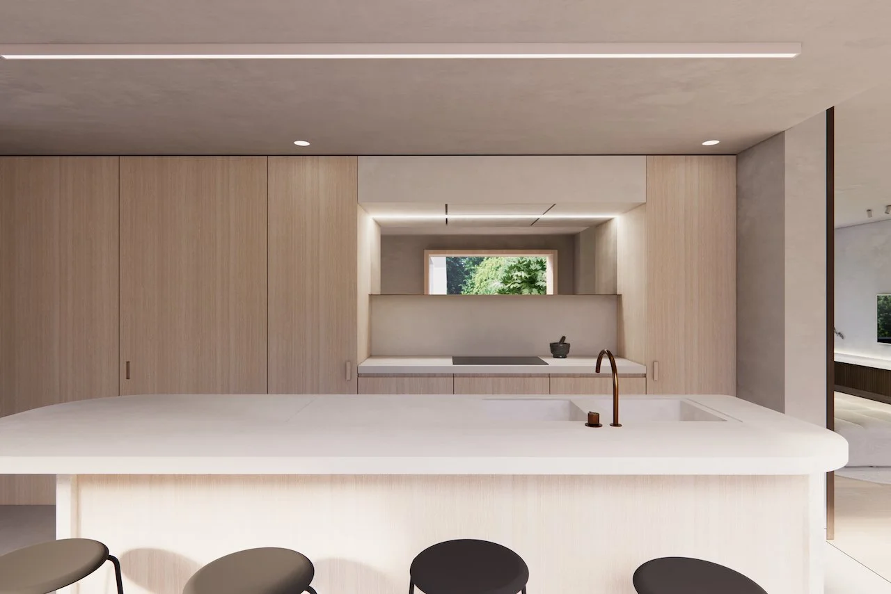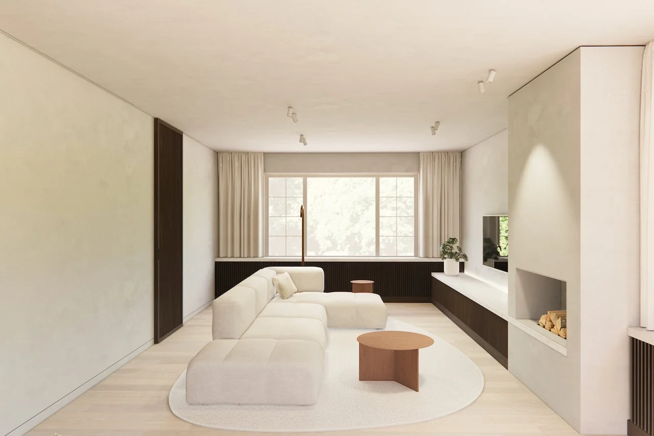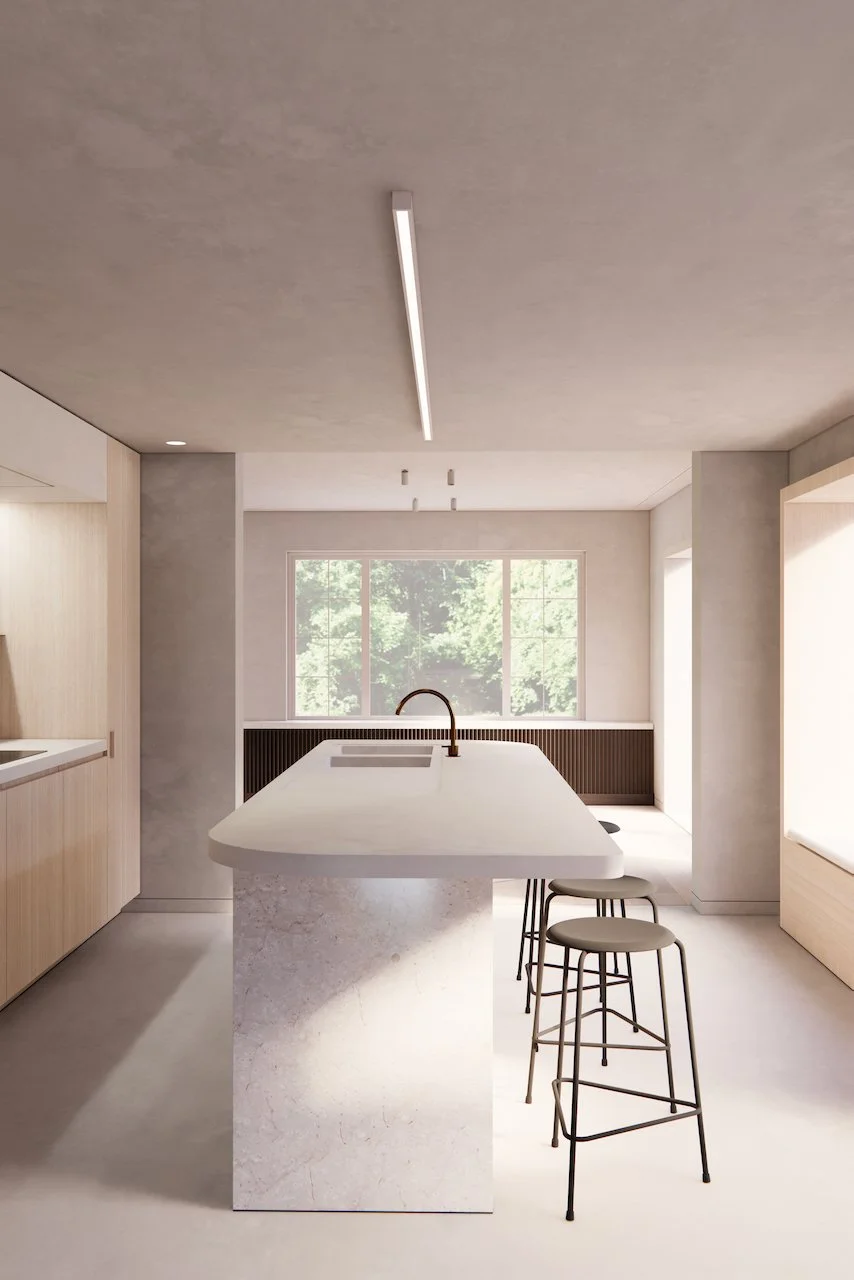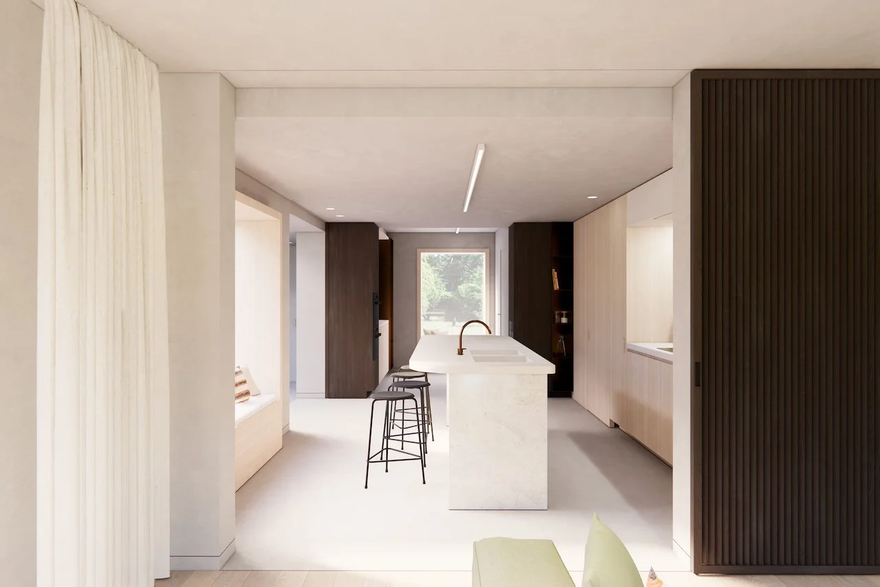 De keuze voor zachte en natuurlijke materialen - zoals het spel tussen het lichte en donkere houtfineer, en de matte kalkverftechniek op de wanden - zorgt voor een tijdloze, serene sfeer waarin elke ruimte een eigen kwaliteit van rust en focus krijgt. Die combinatie resulteert in een evenwichtig interieur dat tegelijk uitnodigend en ingetogen is.