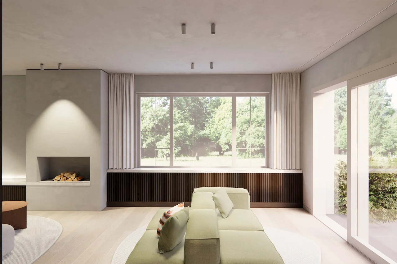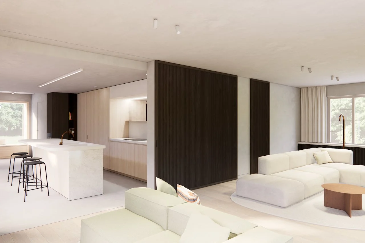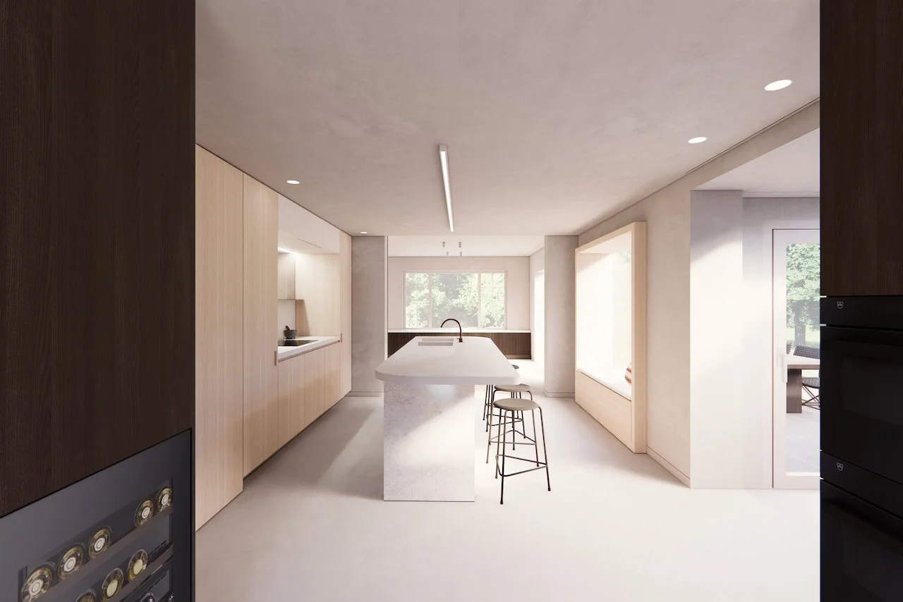 Doorheen het project wordt de relatie met de buitenruimte telkens benadrukt: ramen en zichtlijnen verbinden de leefzones met de tuin, waardoor je een continu gevoel van openheid ervaart.