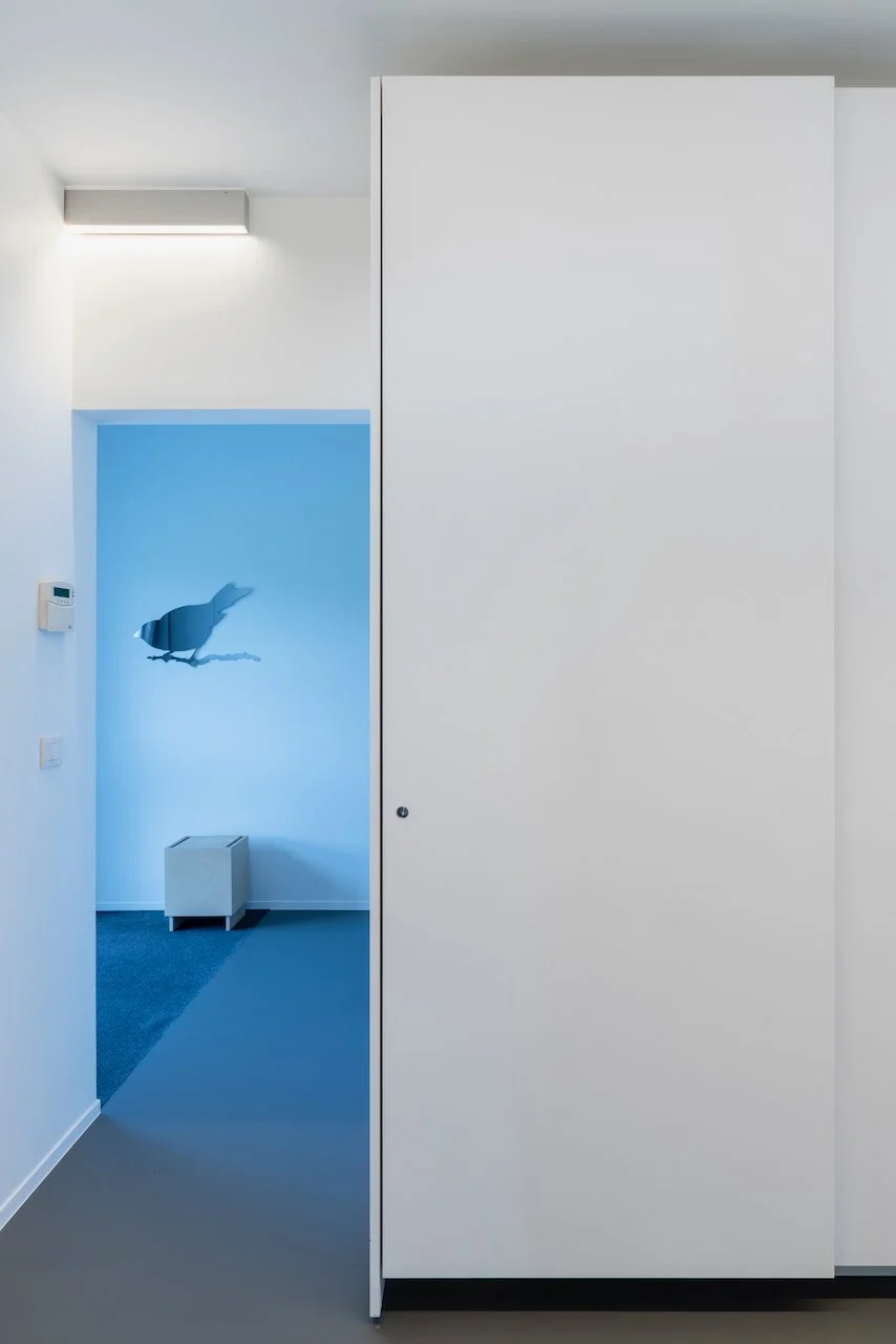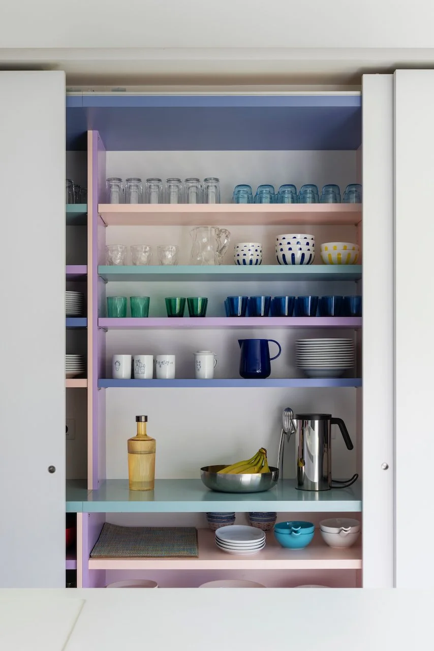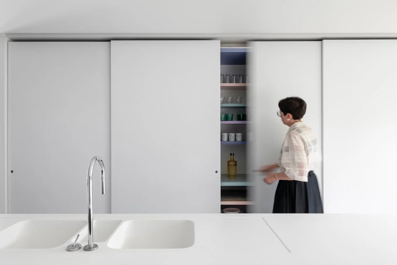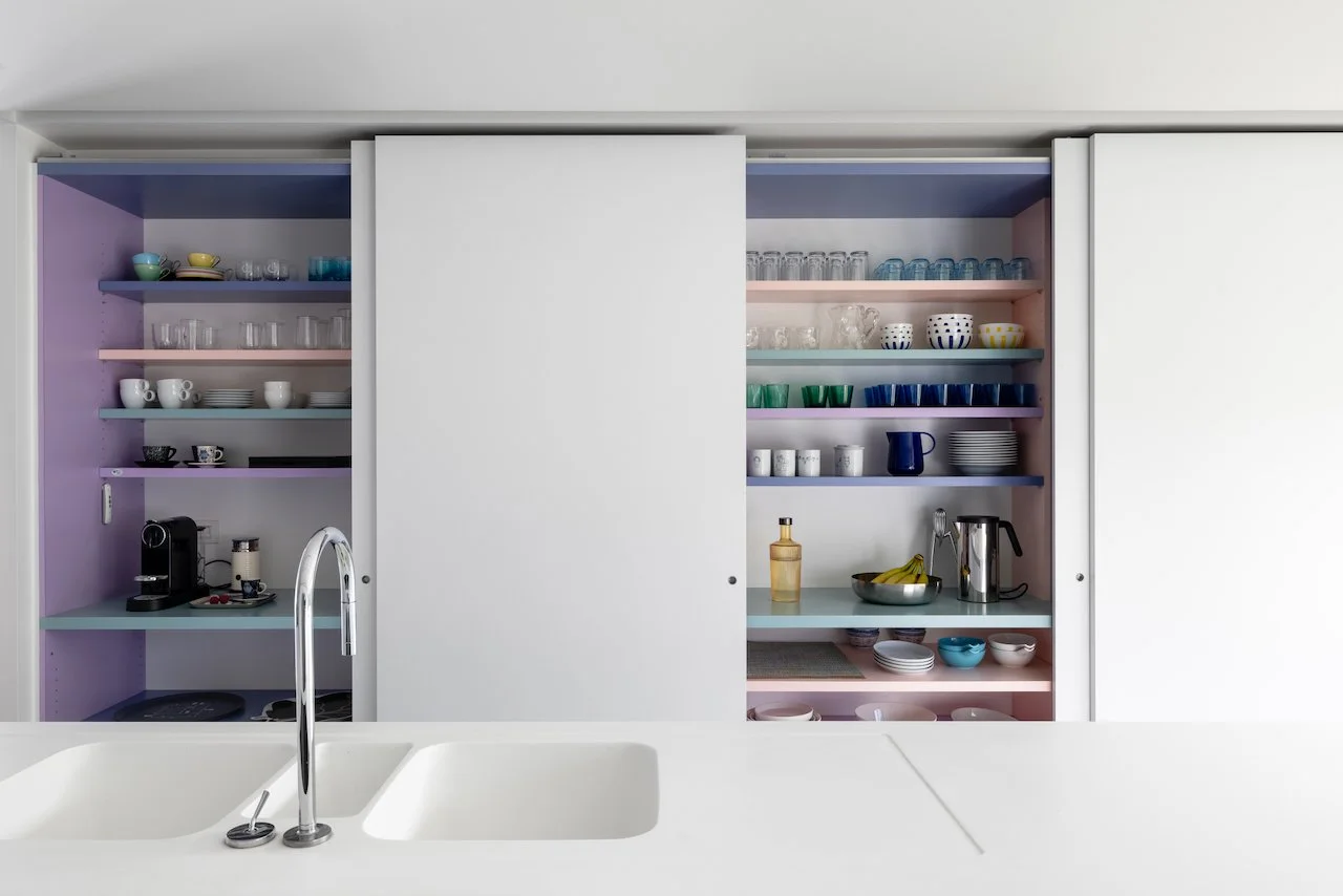 Een bijzonder detail bevindt zich in het maatwerk: de belangrijkste kleuraccenten zitten verscholen in de binnenzijde van de kasten. Pas wanneer ze geopend worden, onthullen ze hun karakter en brengen ze een verrassende dynamiek in de ruimte. Deze bewuste keuze zorgt voor een ingetogen beeld in rust, met een speelse en persoonlijke toets tijdens het gebruik.