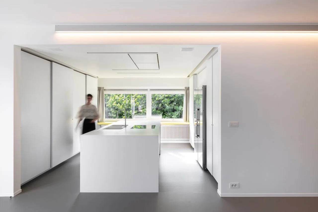 In deze woning stond het herstellen en versterken van de oorspronkelijke volumes centraal. Door de klassieke indeling open te trekken, ontstond een indrukwekkende ruimtelijkheid die de woning opnieuw laat ademen. De grote, lichte ruimtes vloeien naadloos in elkaar over, waardoor een gevoel van vrijheid en rust ontstaat dat in elke hoek voelbaar is.