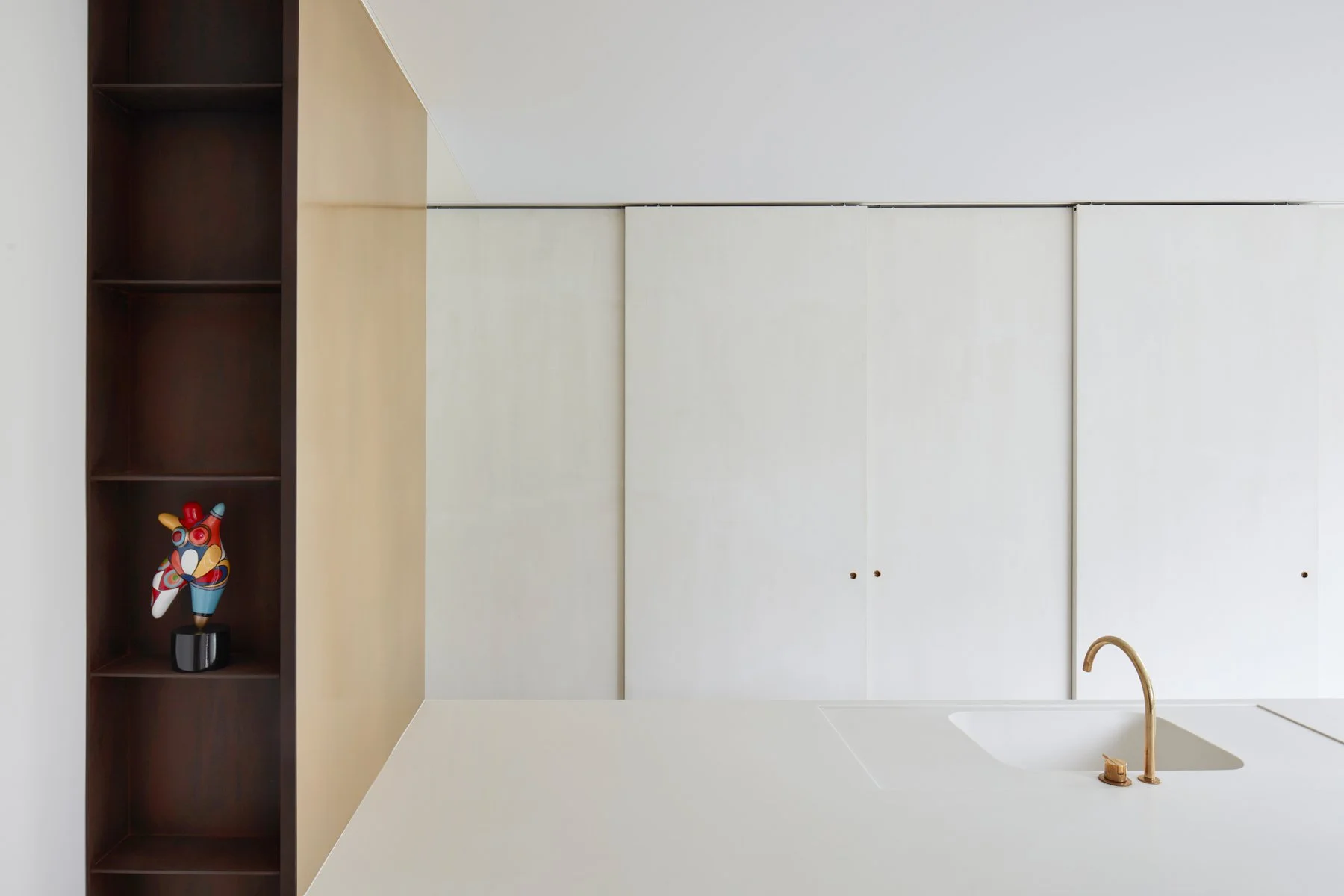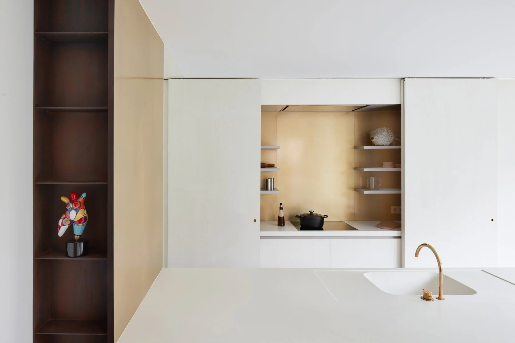 Messing wanden en grote glasoppervlaktes zorgen voor een spel van reflecties die het ruimtegevoel vergroten, terwijl het Corian werkblad en de zwevende tafel voor een rustgevende steriliteit zorgen.