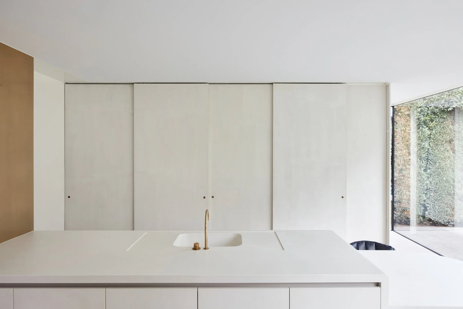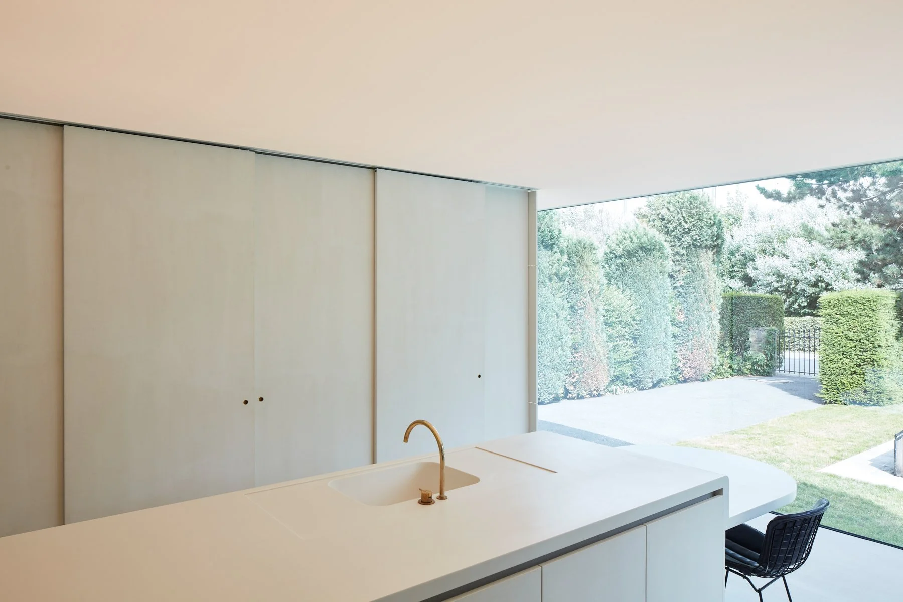 Achter de zuivere lijnen schuilt een enorme techniek. De kastenwand herbergt niet alleen de volledige keukenuitrusting (oven, koffiezet, etc.), maar bevat ook een slim weggewerkte wasnis voor de wasmachine en droogkast. Wanneer alles gesloten is, blijft enkel een serene, onverstoorde ruimte over. Een spanplafond met geïntegreerde akoestische isolatie garandeert dat de rust ook auditief bewaard blijft, ondanks de grote glaspartijen.