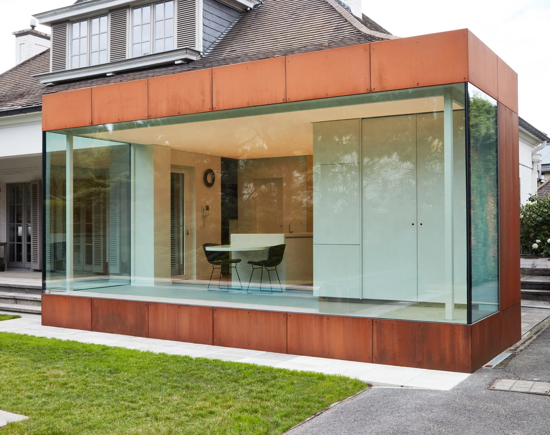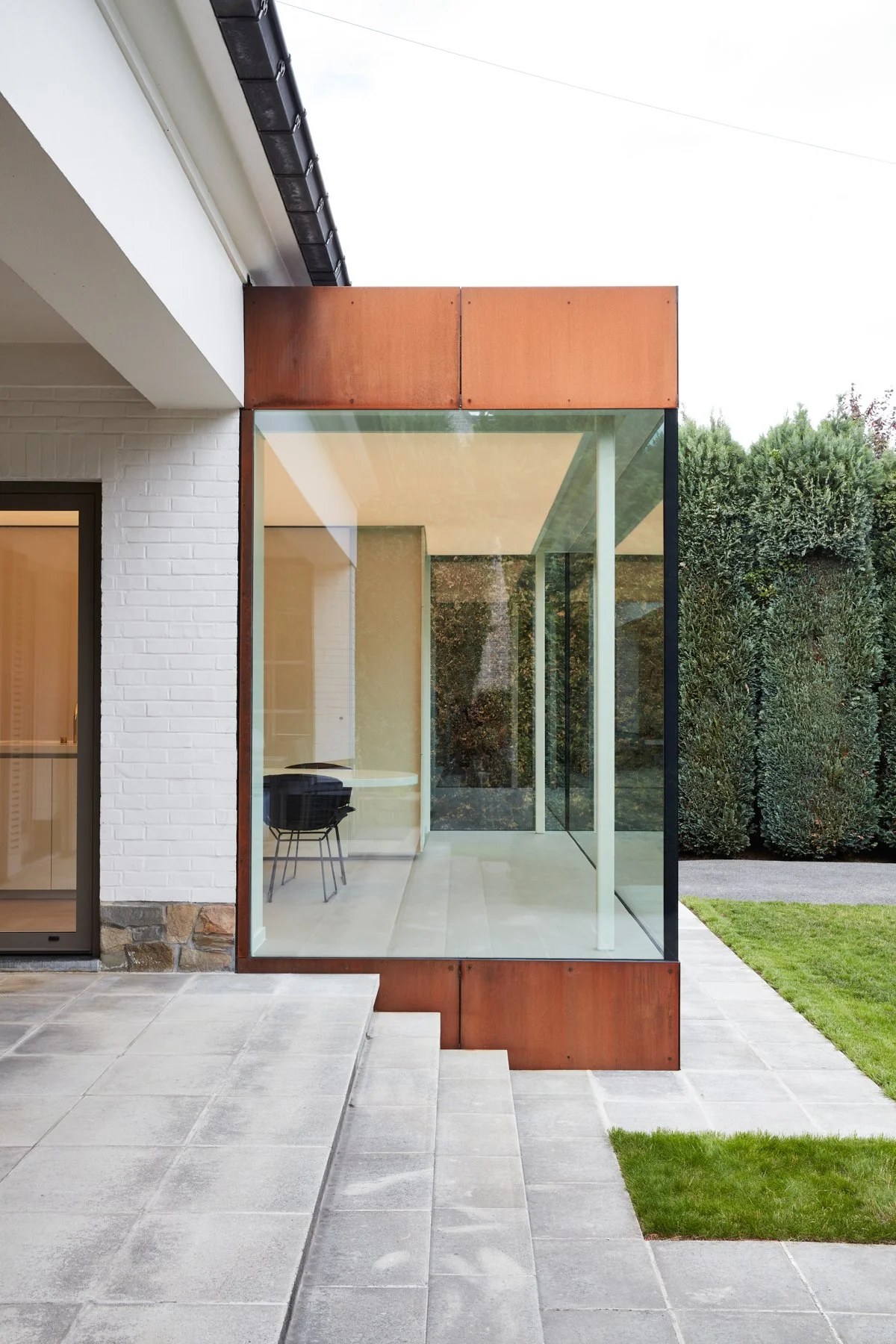 Geïnspireerd door het werk van Richard Serra, ontwierpen we de uitbreiding van deze woning als een architecturale sculptuur. De oorspronkelijke keuken was te klein en te donker, maar in plaats van enkel te vergroten, hebben we uit de woning 'gebroken'. De nieuwe uitbouw, uitgevoerd in karaktervol cortenstaal, creëert een krachtige dialoog met de bestaande architectuur en herdefinieert tegelijkertijd de relatie tussen de woning en de tuin.