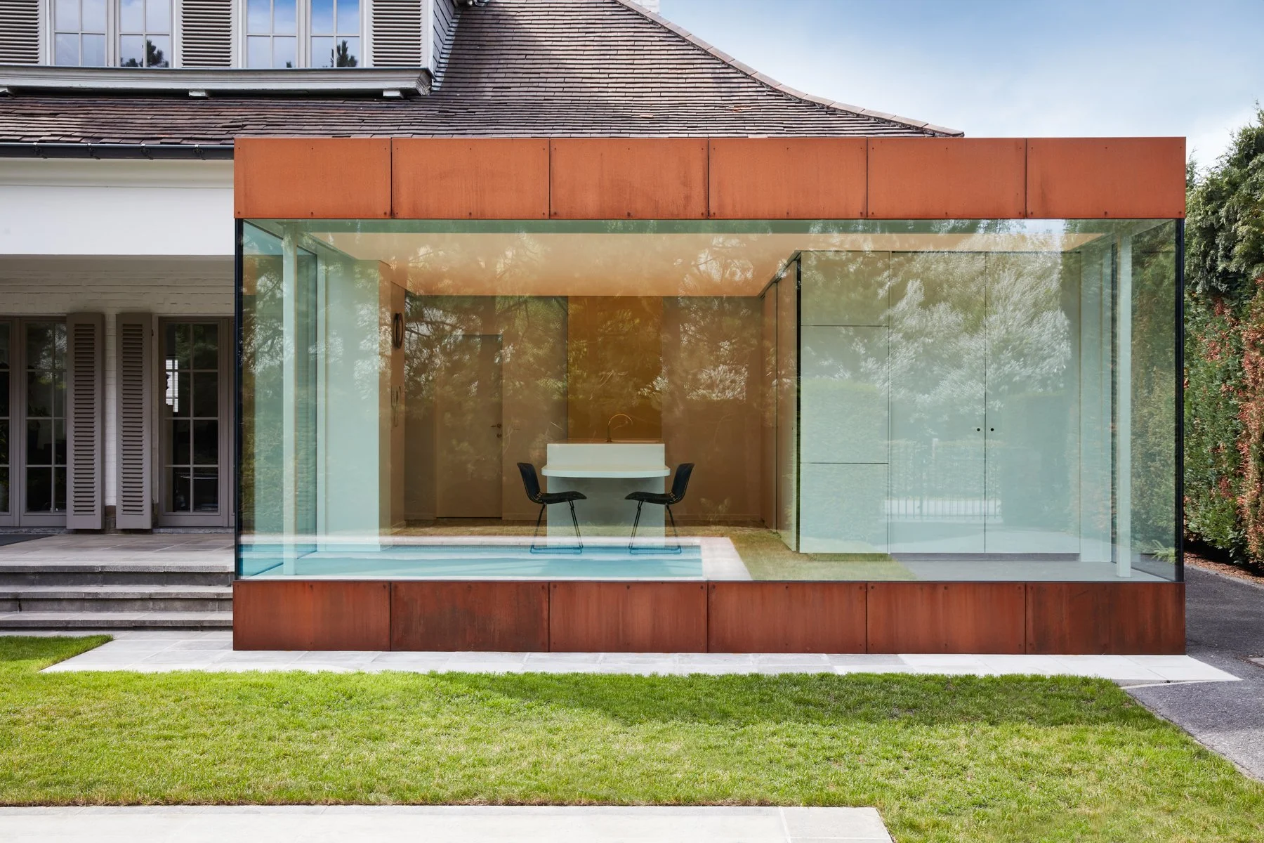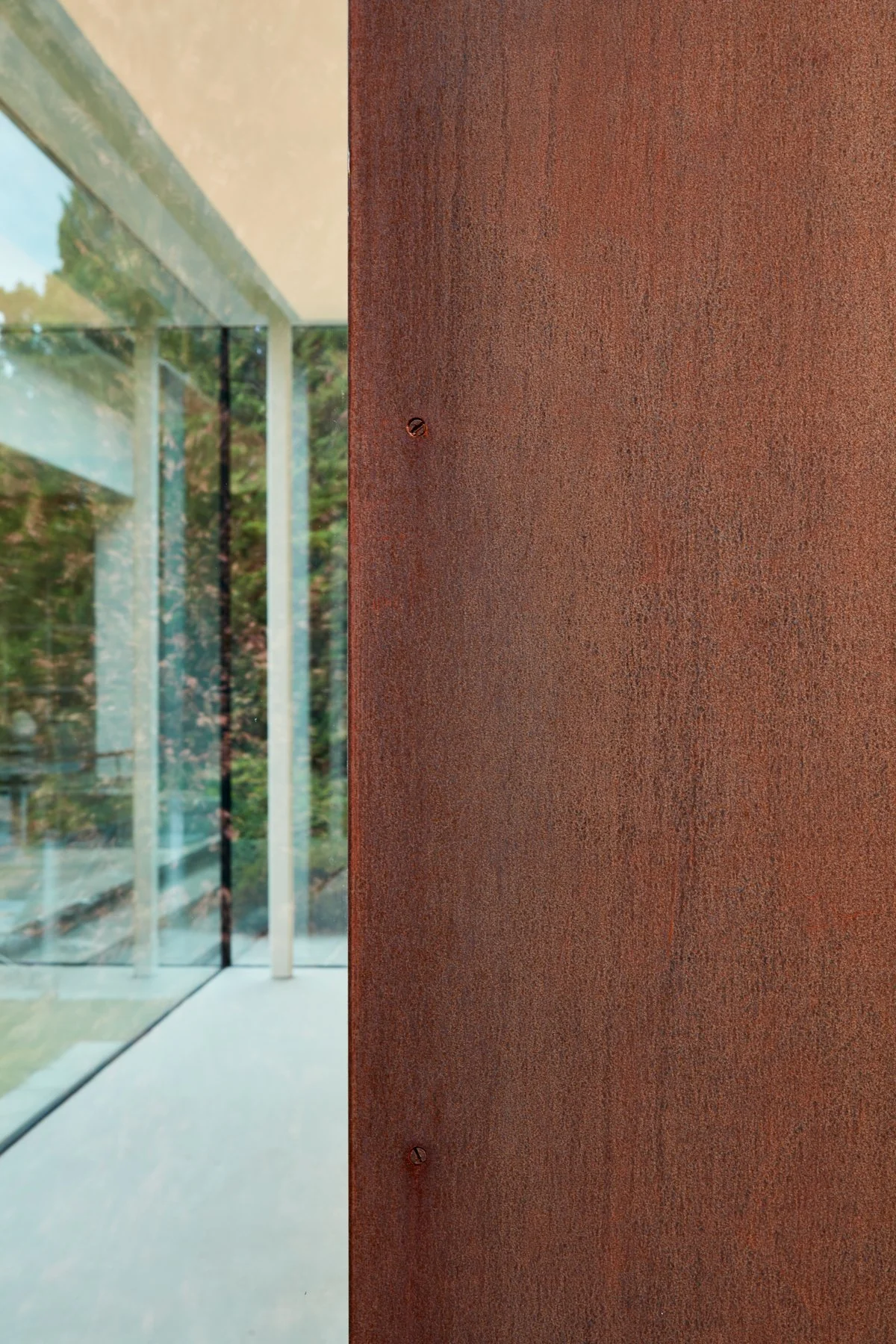De kalkverftechniek op de vloer en het meubilair is in subtiele lijnen aangebracht, een directe echo van de verticale lijnen in de staalplaten buiten.
