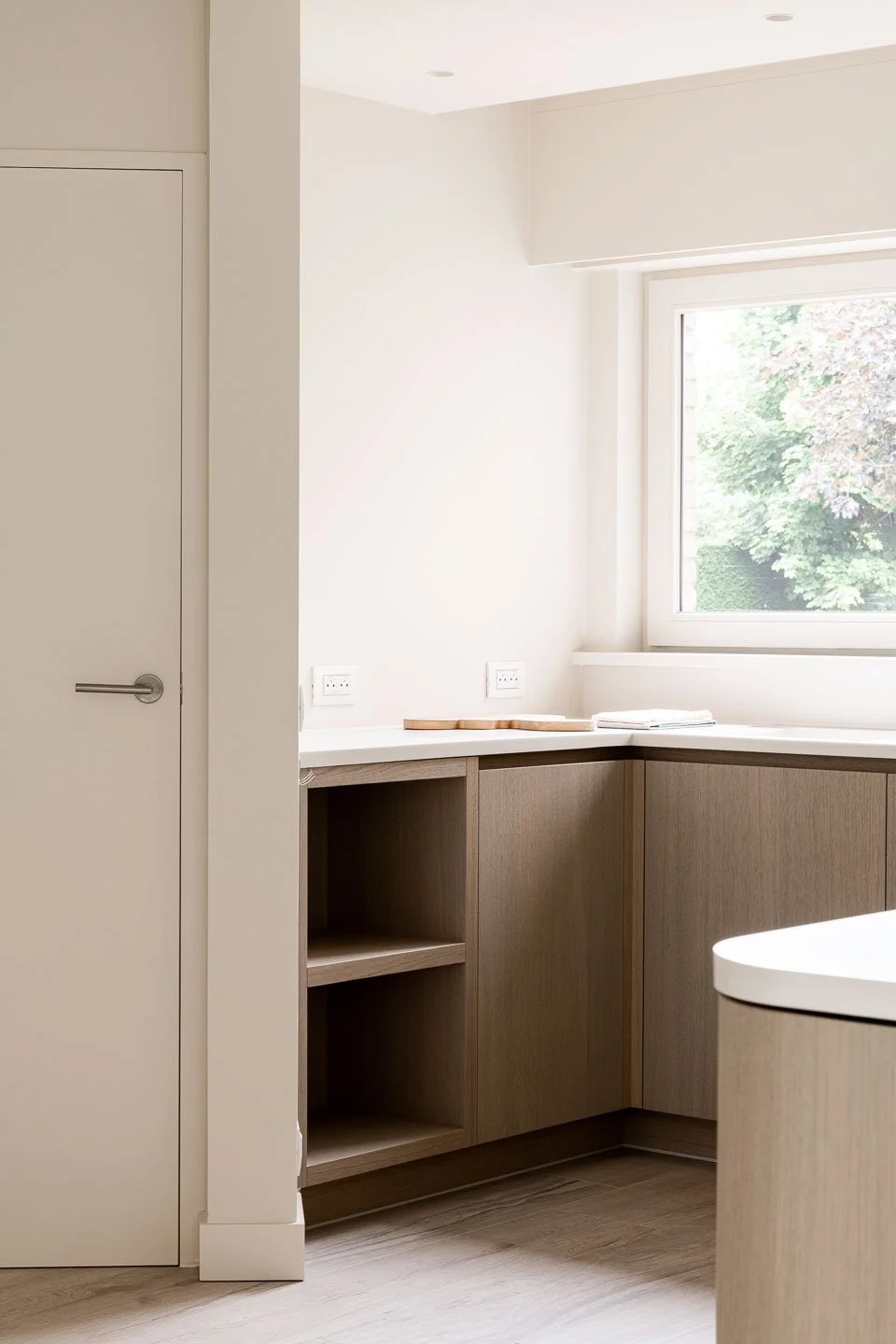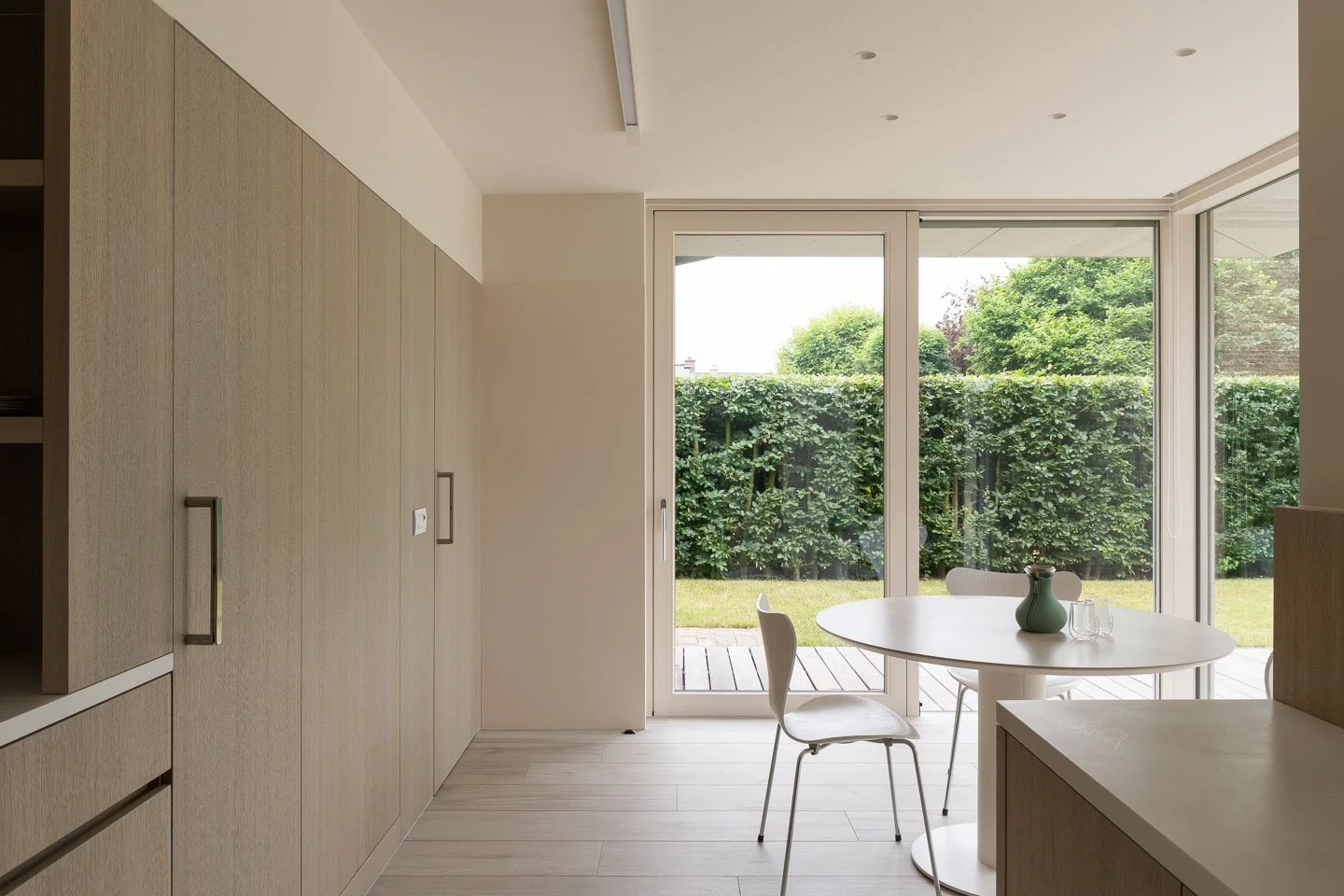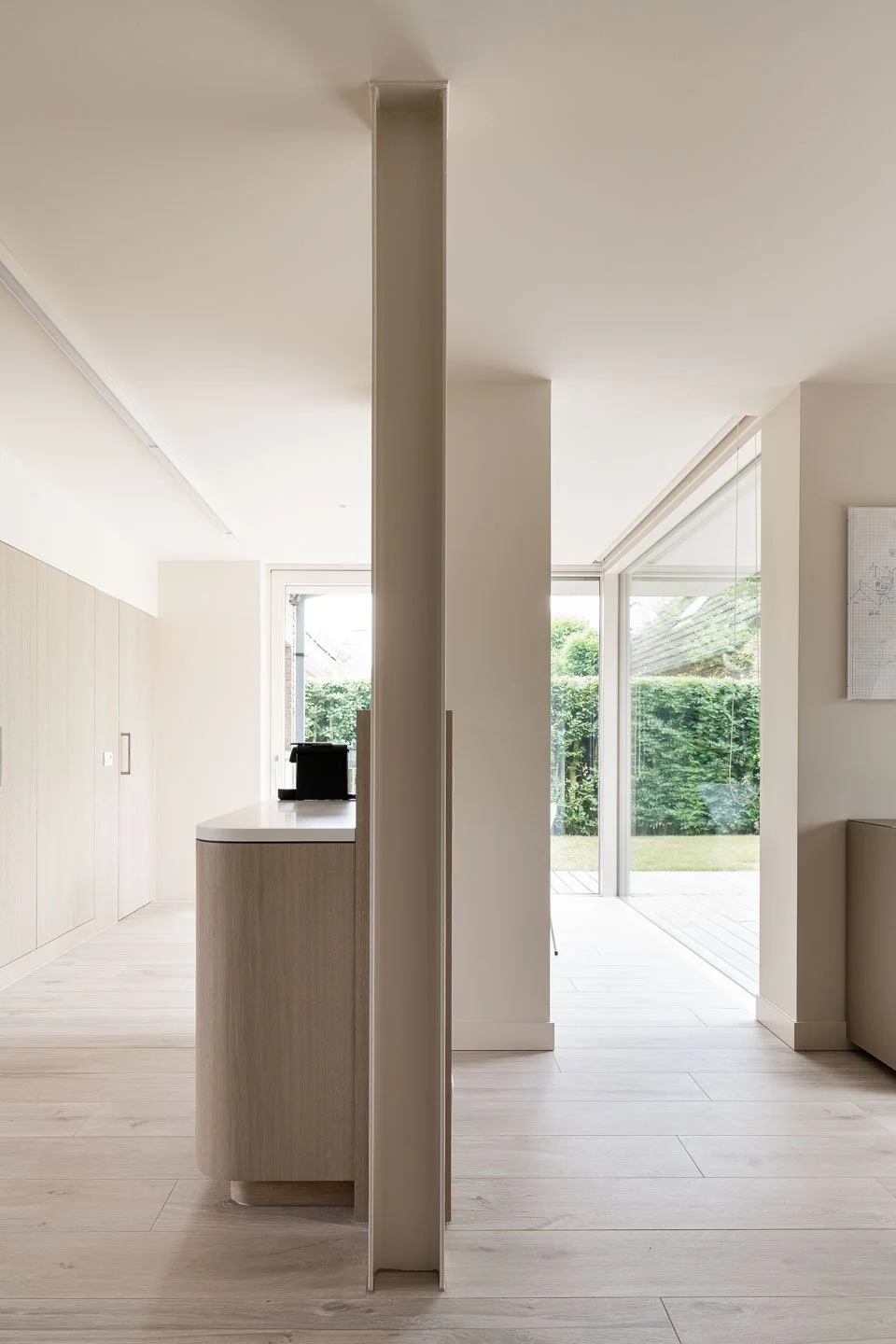 Niet alleen het glas, maar ook de materiaalkeuze versterkt de link met de omliggende tuin. We kozen voor specifieke houtfineer-tinten die de natuurlijke kleuren van buiten naar binnen halen en de woning een onmiddellijke warmte geven. Deze houten accenten vormen, samen met een palet van rijke structuren, de rode draad doorheen de volledige woning.