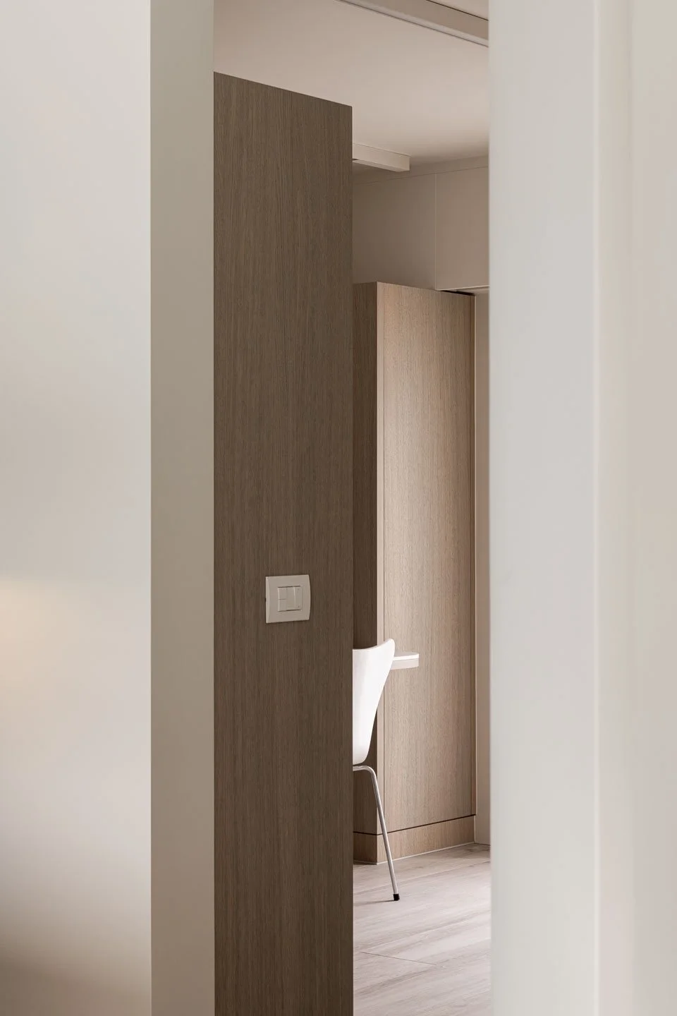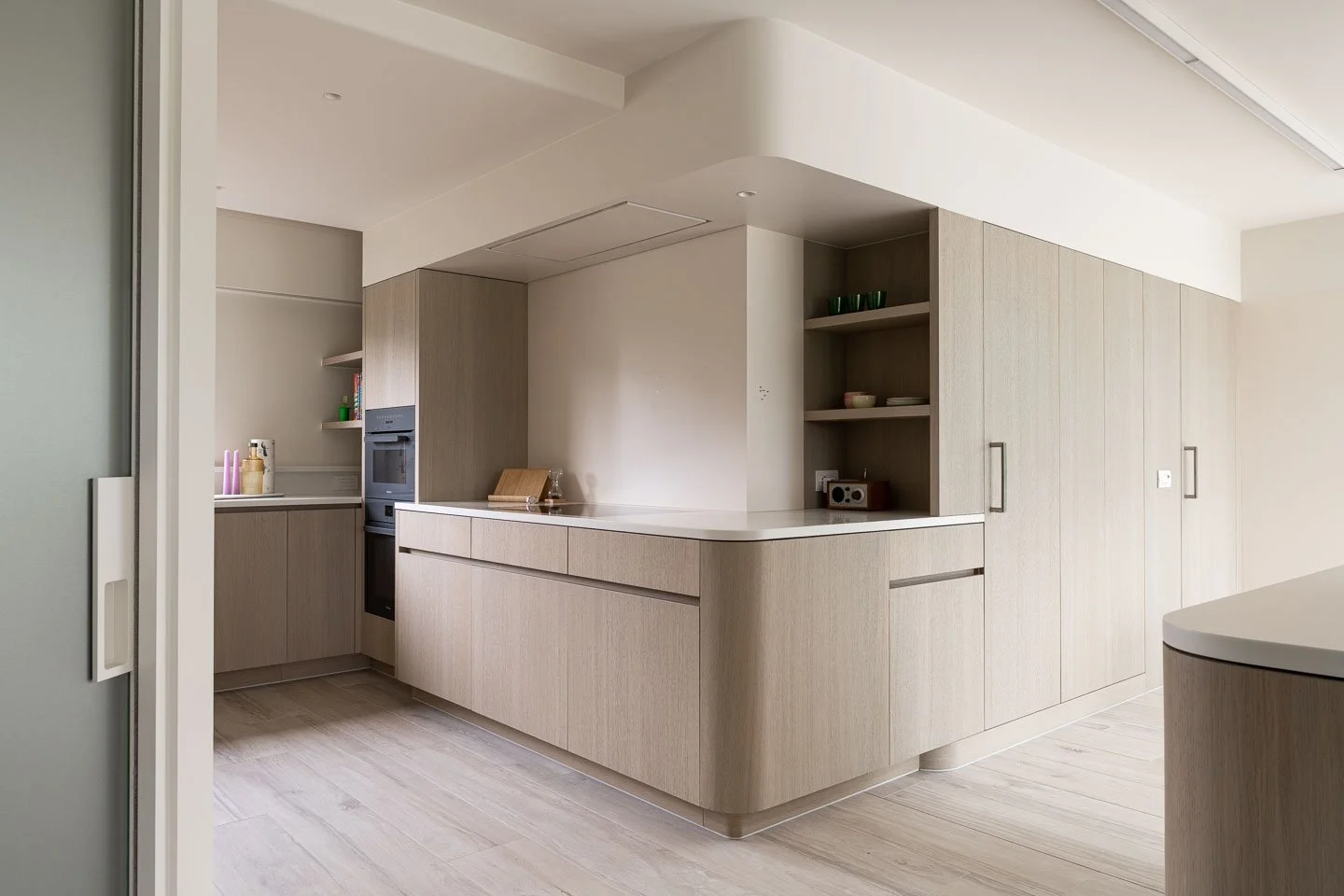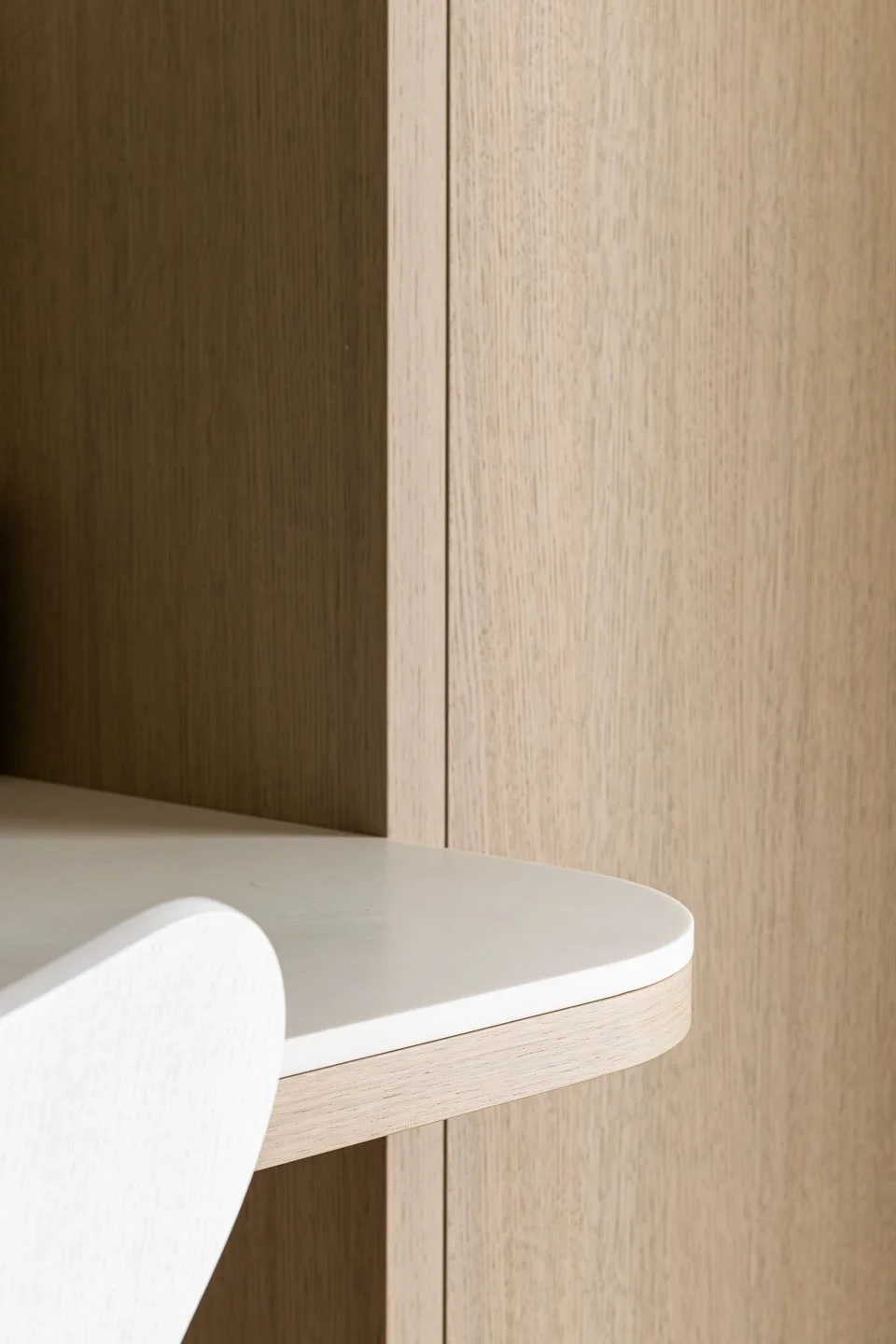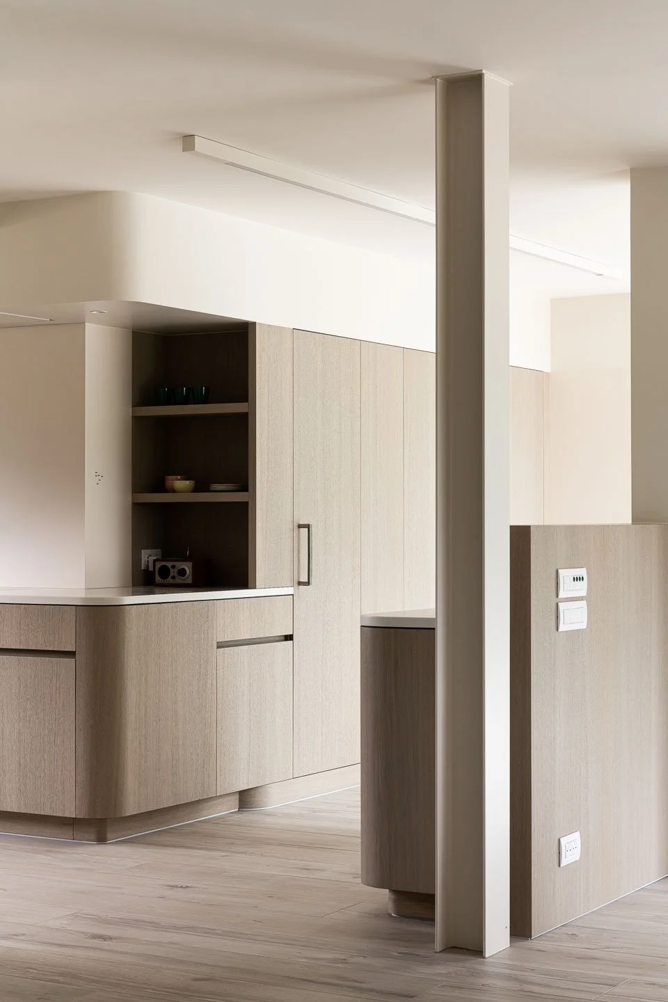 Niet alleen het glas, maar ook de materiaalkeuze versterkt de link met de omliggende tuin. We kozen voor specifieke houtfineer-tinten die de natuurlijke kleuren van buiten naar binnen halen en de woning een onmiddellijke warmte geven. Deze houten accenten vormen, samen met een palet van rijke structuren, de rode draad doorheen de volledige woning.