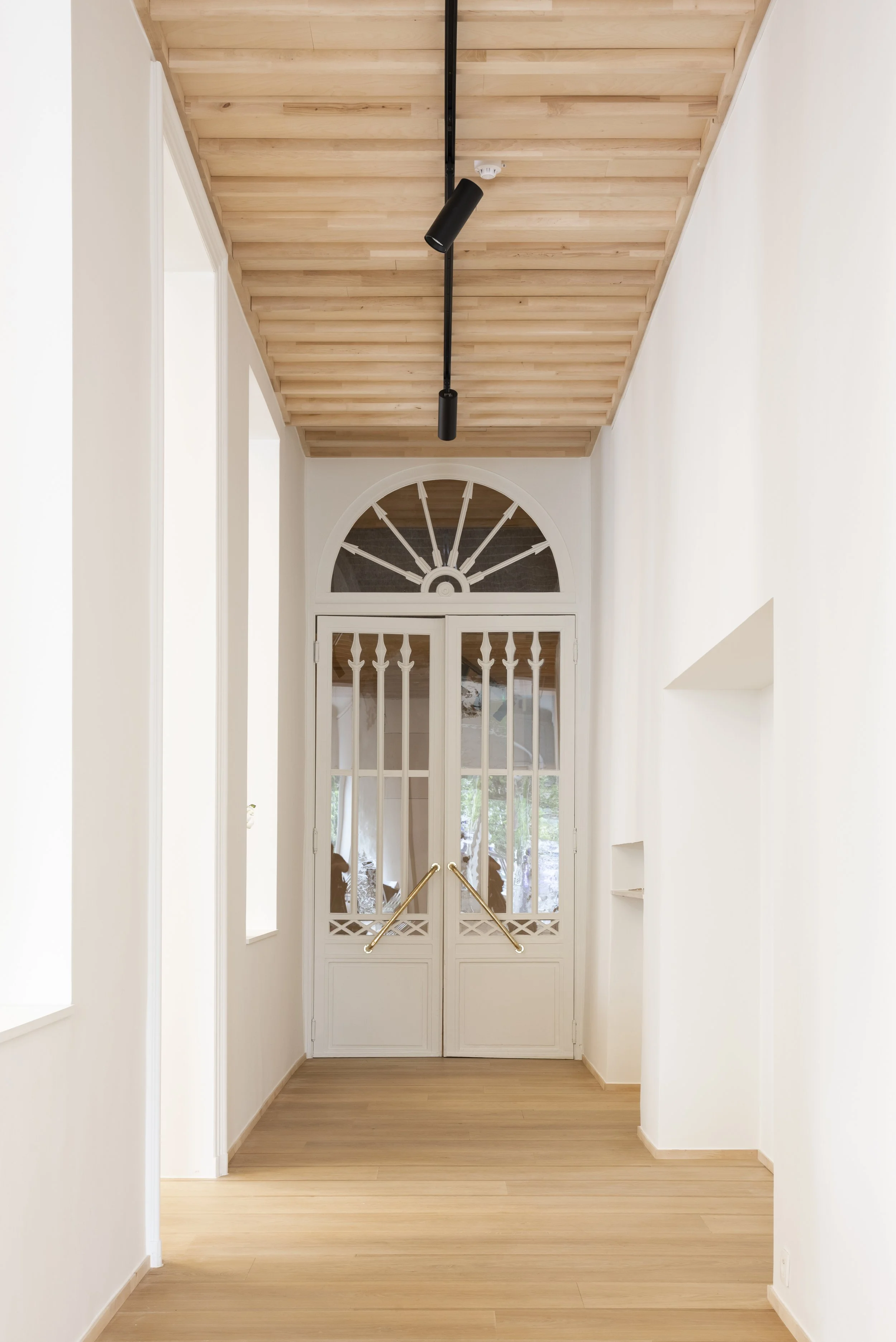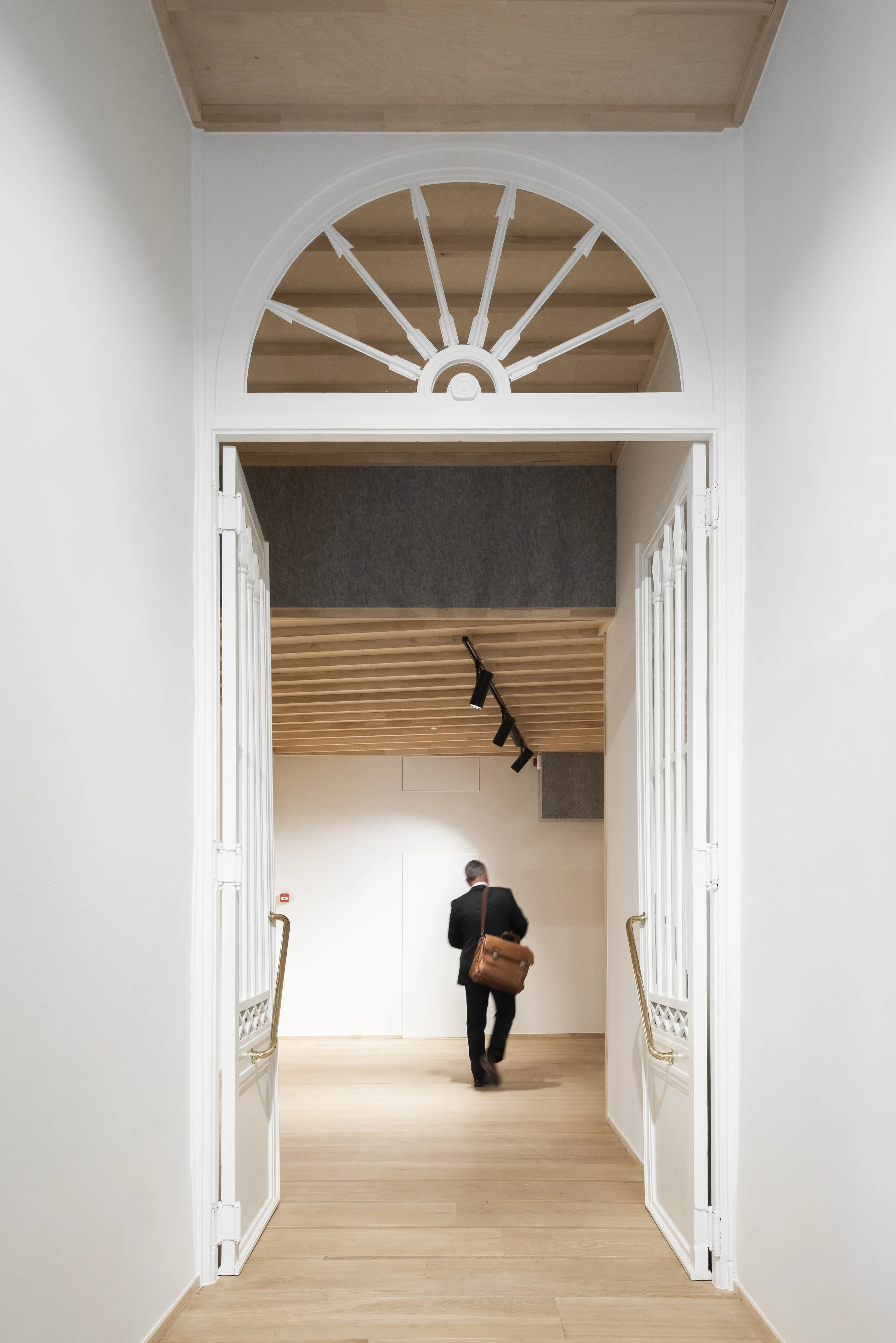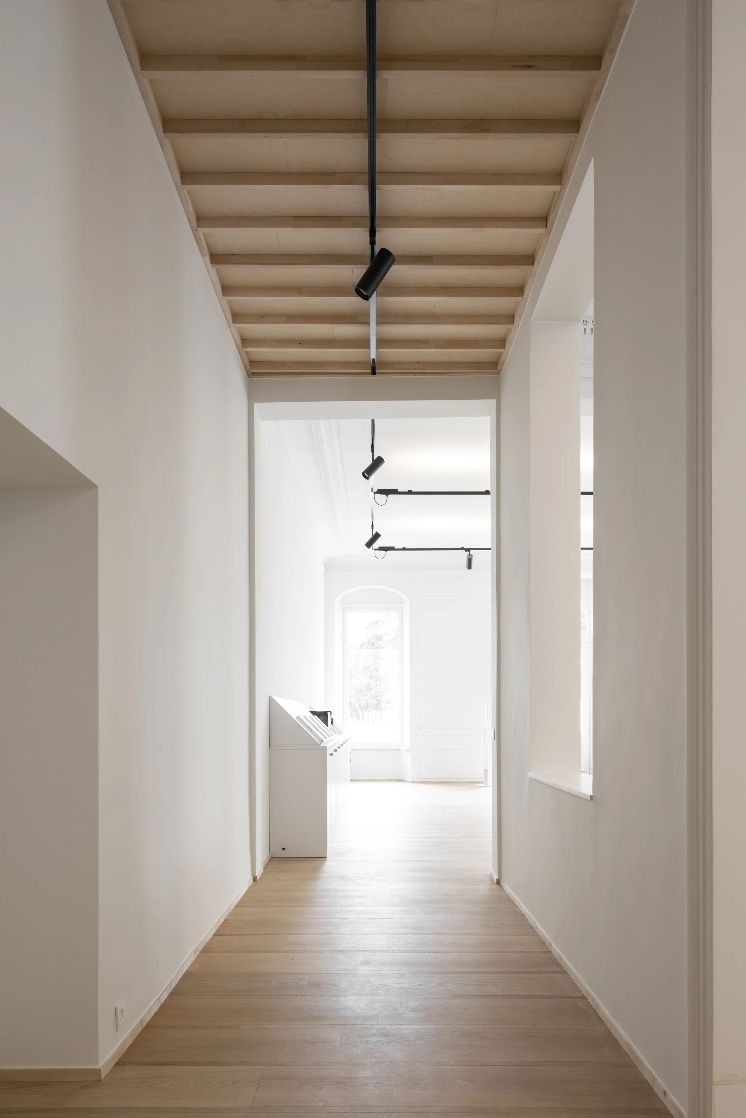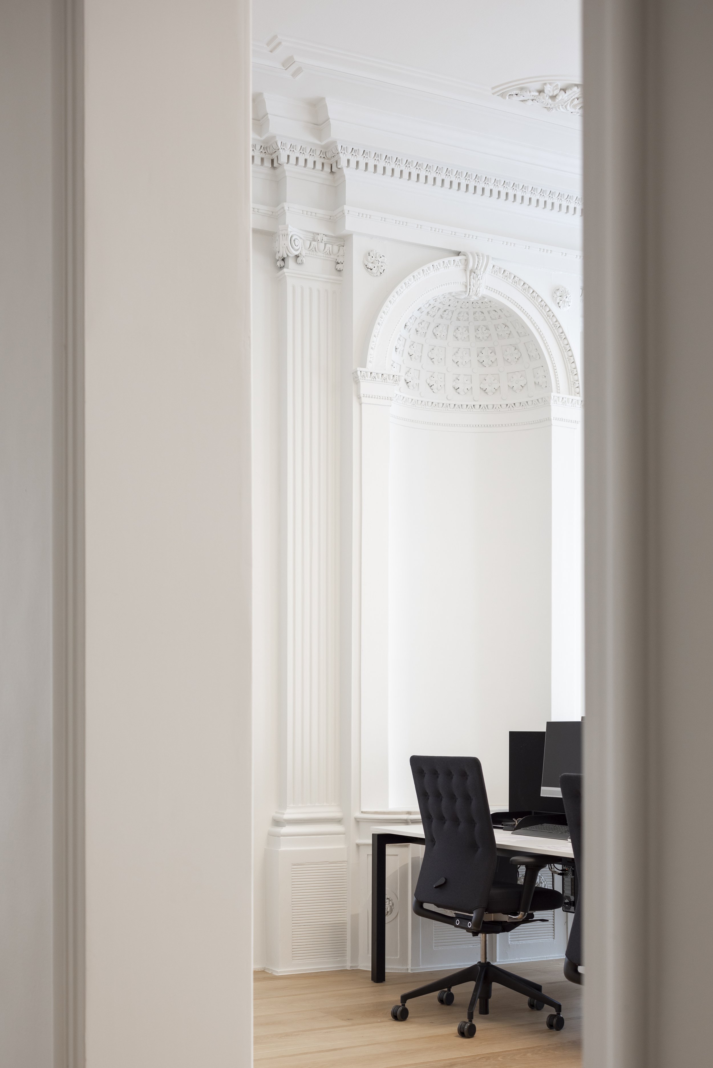 De uitdaging: rust brengen in een wirwar van lokalen met diverse plafondhoogtes en klassieke ornamenten. We kozen voor een universeel lijnenspel van 38/300 mm, geïnspireerd op de Japanse bouwstijl waarbij de structuur de versiering vormt.